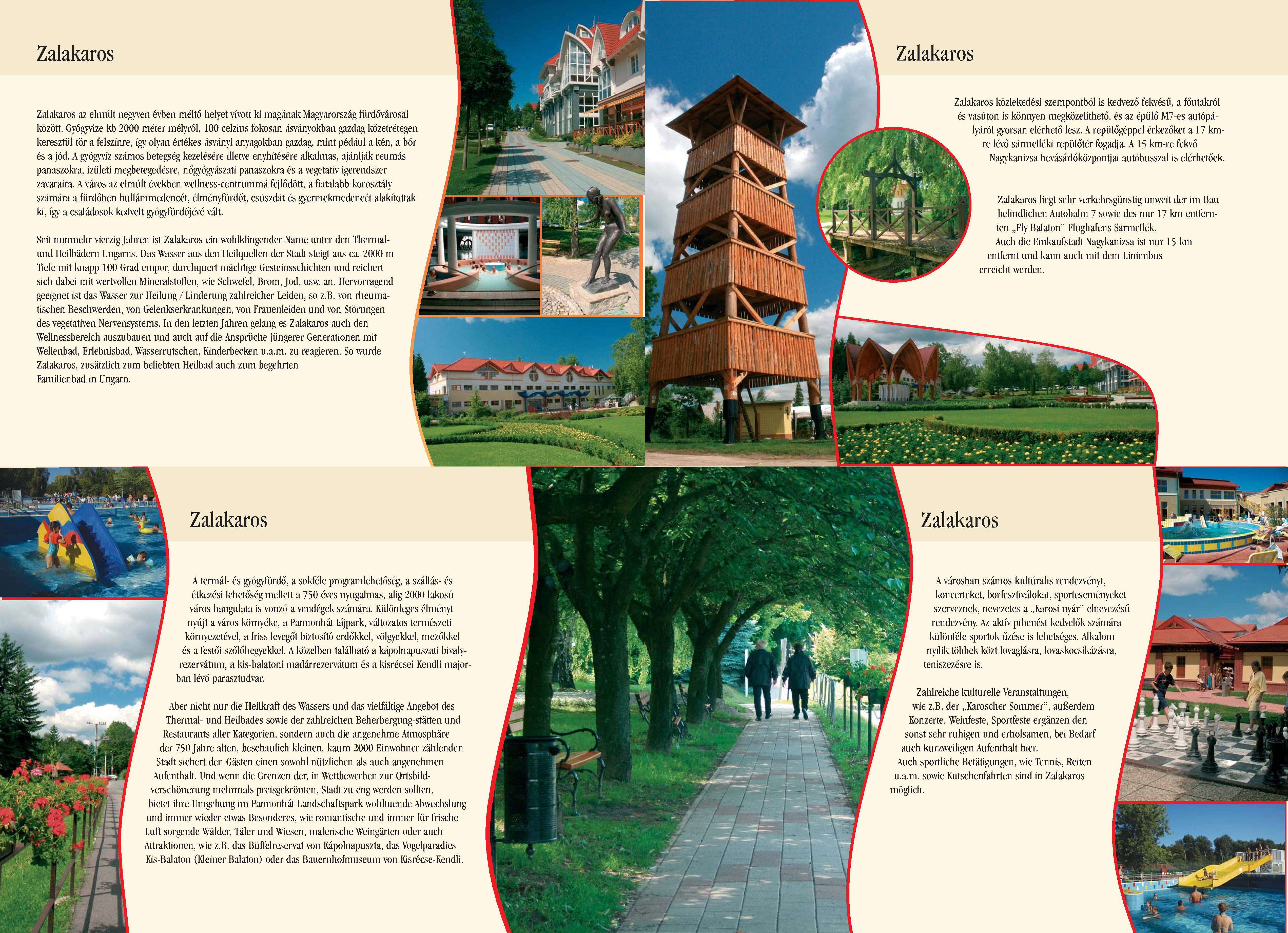 Nyilvános 1669 | 5066 | Zalakaros | Seit nunmehr vierzig Jahren ist Zalakaros ein wohlklingender Name unter den Thermal- und Heilbädern Ungarns. Das Wasser aus den Heilquellen der Stadt steigt aus ca. 2000 m Tiefe mit knapp 100 Grad empor, durchquert mächtige Gesteinsschichten und reichert sich dabei mit wertvollen Mineralstoffen, wie Schwefel, Brom, Jod, usw. an. Hervorragend geeignet ist das Wasser zur Heilung / Linderung zahlreicher Leiden, so z.B. von rheumatischen Beschwerden, von Gelenkserkrankungen, von Frauenleiden und von Störungen des vegetativen Nervensystems. In den letzten Jahren gelang es Zalakaros auch den Wellnessbereich auszubauen und auch auf die Ansprüche jüngerer Generationen mit Wellenbad, Erlebnisbad, Wasserrutschen, Kinderbecken u.a.m. zu reagieren. So wurde Zalakaros, zusätzlich zum beliebten Heilbad auch zum begehrten Familienbad in Ungarn. Aber nicht nur die Heilkraft des Wassers und das vielfältige Angebot des Thermal- und Heilbades sowie der zahlreichen Beherbergung-stätten und Restaurants aller Kategorien, sondern auch die angenehme Atmosphäre der 750 Jahre alten, beschaulich kleinen, kaum 2000 Einwohner zählenden Stadt sichert den Gästen einen sowohl nützlichen als auch angenehmen Aufenthalt. Und wenn die Grenzen der, in Wettbewerben zur Ortsbild-verschönerung mehrmals preisgekrönten, Stadt zu eng werden sollten, bietet ihre Umgebung im Pannonhát Landschaftspark wohltuende Abwechslung und immer wieder etwas Besonderes, wie romantische und immer für frische Luft sorgende Wälder, Täler und Wiesen, malerische Weingärten oder auch Attraktionen, wie z.B. das Büffelreservat von Kápolnapuszta, das Vogelparadies Kis-Balaton (Kleiner Balaton) oder das Bauernhofmuseum von Kisrécse-Kendli. Zahlreiche kulturelle Veranstaltungen, wie z.B. der ,,Karoscher Sommer", außerdem Konzerte, Weinfeste, Sportfeste ergänzen den sonst sehr ruhigen und erholsamen, bei Bedarf auch kurzweiligen Aufenthalt hier. Auch sportliche Betätigungen, wie Tennis, Reiten u.a.m. sowie Kutschenfahrten sind in Zalakaros möglich. Zalakaros liegt sehr verkehrsgünstig unweit der im Bau befindlichen Autobahn 7 sowie des nur 17 km entfernten ,,Fly Balaton" Flughafens Sármellék. Auch die Einkaufstadt Nagykanizsa ist nur 15 km entfernt und kann auch mit dem Linienbus erreicht werden. Dieses Text stammt von: Pannonhát tájpark prospektus 2006. Web: http://www.pannonhat.hu/ (auch in Deutsch) |