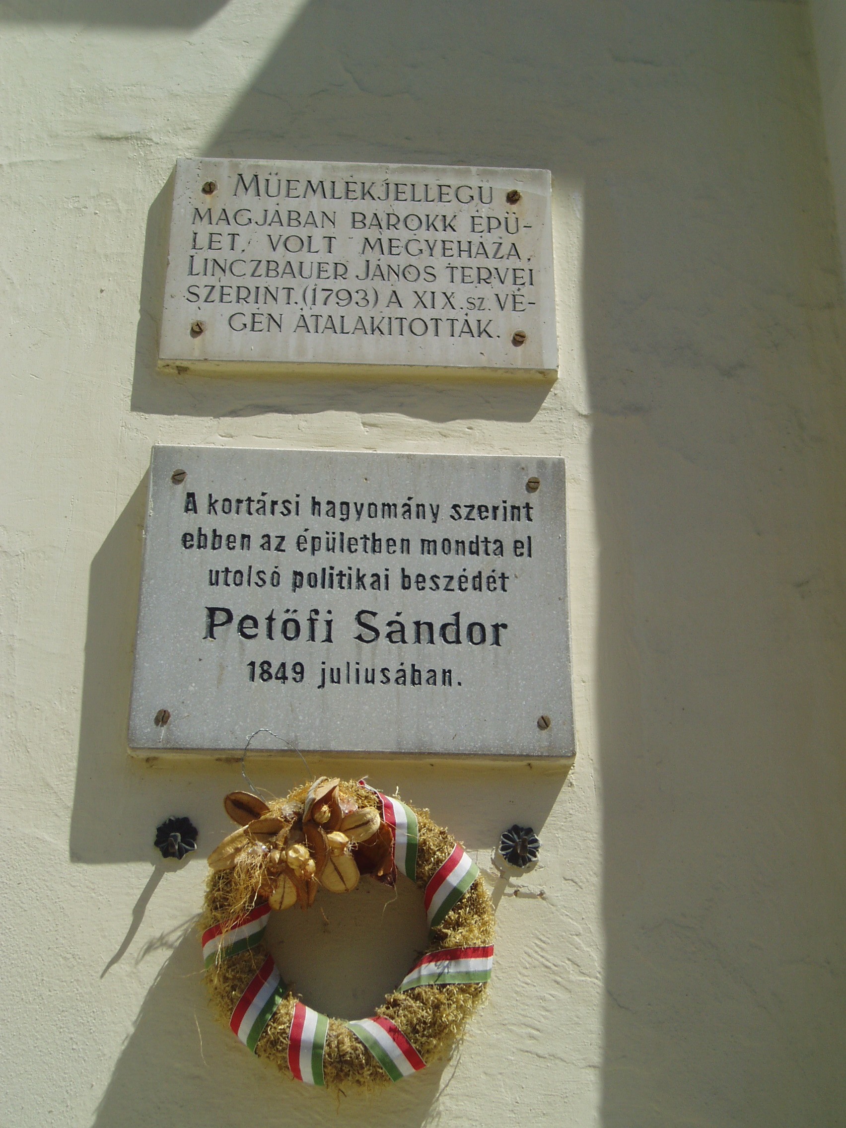 Nyilvános 767 | 1207 | Gyula, Petőfi tér 3. Régi Vármegyeháza | A városközponti háromszög alakú hangulatos tér csaknem minden épülete történelmi vagy műemléki érték. Az egykori Vármegyeháza - a mai Városháza - a tér legszebb épülete. Eredeti formájában a XVIII. század utolsó harmadában épült az akkoriban újjátelepült Békés megye közigazgatási központjának. Azóta többszöri átépítéseket, alakításokat, bővítéseket hajtottak végre rajta. Ezek eredményeképpen ma barokk, klasszicista, romantikus és eklektikus részleteket egyaránt megfigyelhetünk az összességében eklektikus hatású épületen. A Vármegyeháza sok nevezetes eseménynek volt helyszíne. 1848. március 22-én az udvaron ismertették az egybegyűlt sokaság előtt a Pesten zajló eseményeket. A helyi hagyomány szerint 1849 júliusában a védbizottmány egyik ülésén mondta el utolsó politikai beszédét Petőfi Sándor. A költő akkoriban Mezőberényben tartózkodott, onnan rándult át a megyeszékhelyre. Az eseményt az épület homlokzatán emléktábla örökíti meg. A fénykép 2007 júliusában készült. Felh. irod.: Czeglédi Imre: Gyula útikalauz. 2. jav., bőv. kiad. Gyula, 1995 |