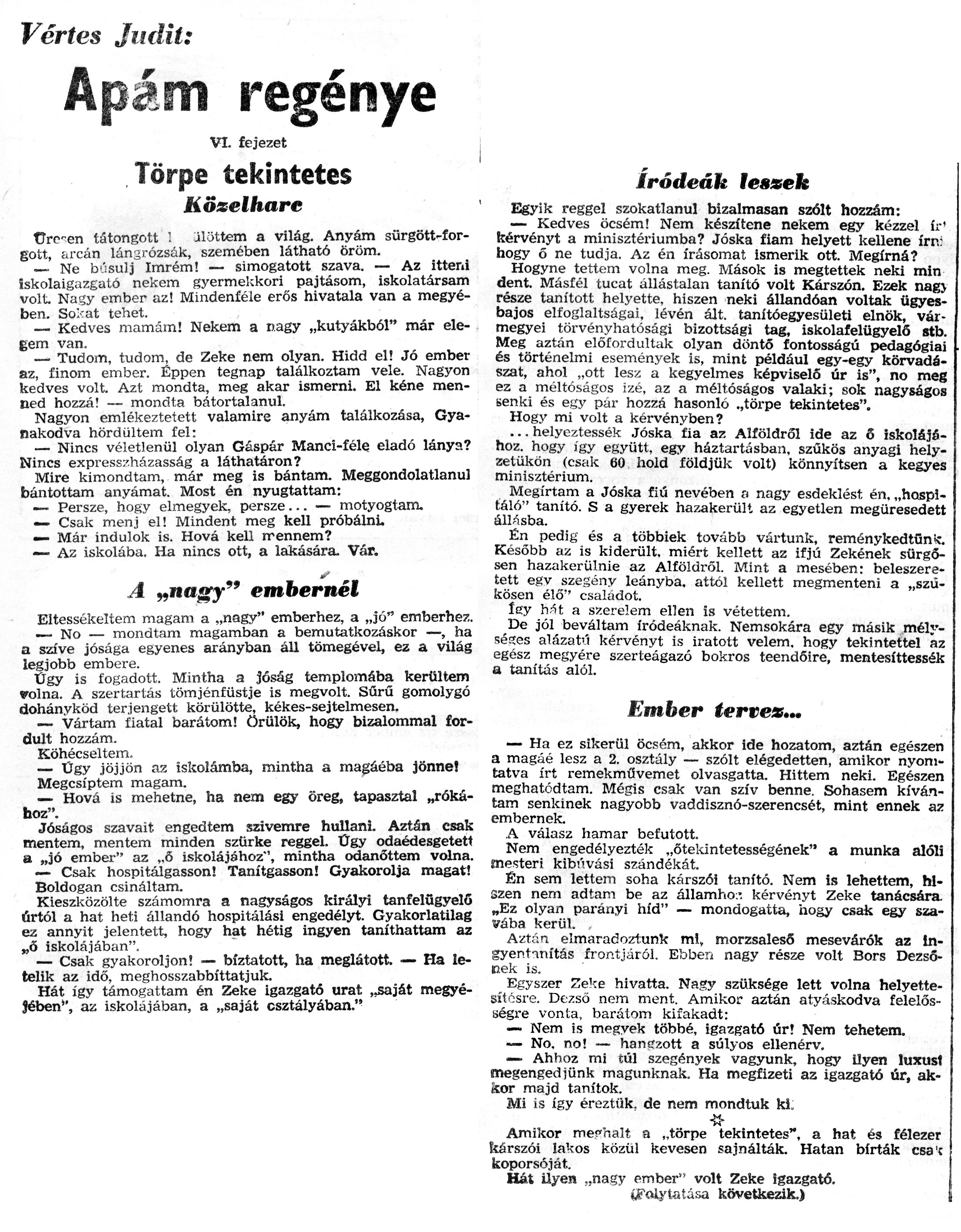 Nyilvános 921 | 1946 | Zalai Hírlap 1971.01.24. 020sz 08old - Apám regénye 04 | A következő szöveg a cikkből keletkezett automata szövegfelismertető segítségével: Vértes Judit: Apám regénye VI. fejezet Törpe tekintetes {■ Közelharc ürc-en tátongott ! jlöttem a világ. Anyám sürgött-for-gott, arcán lángrózsák, szemében látható öröm. — Ne búsulj Imrém! — simogatott szava. — Az itteni iskolaigazgató nekem gyermekkori pajtásom, iskolatársam volt Nagy ember az! Mindenféle erős hivatala van a megyében. So\'^at tehet. ..... __ Kedves mamám! Nekem a nagy „kutyákból" mar elegem van. __Tudom, tudom, de Zeke nem olyan. Hidd el! Jó ember az, finom ember. Éppen tegnap találkoztam vele. Nagyon kedves volt. Azt mondta, meg akar ismerni. El kéne menned hozzá! — mondta bátortalanul. Nagyon emlékeztetett valamire anyám találkozása, Gyanakodva hördültem fel: — Nincs véletlenül olyan Gáspár Manci-féle eladó lánya? Nincs expresszházasság a láthatáron? Mire kimondtam, már meg is bántam. Meggondolatlanul bántottam anyámat. Most én nyugtattam: __ Persze, hogy elmegyek, persze... — motyogtam. — Csak menj el! Mindent meg kell próbálni. — Már indulok is. Hová kell rrennem? — Az iskolába. Ha nincs ott, a lakására. Vár. __ \' A „nagy" embernél Eltessékeltem magam a „nagy" emberhez, a „jó" emberhez. __ No — mondtam magamban a bemutatkozáskor —, ha a szíve jósága egyenes arányban áll tömegével, ez a világ legjobb embere. | Ügy is fogadott. Mintha a jóság templomába kerültem volna. A szertartás tömjénfüstje is megvolt. Sűrű gomolygó dohányköd terjengett körülötte, kékes-sejtelmesen. — Vártam fiatal barátom! örülök, hogy bizalommal fordult hozzám. Köhécseltem. — Ügy jöjjön az iskolámba, mintha a magáéba jönne! Megcsíptem magam. — Hová is mehetne, ha nem egy öreg, tapasztal „rókához". Jóságos szavait engedtem szivemre hullani. Aztán csak mentem, mentem minden szürke reggel. Ügy odaédesgetett a „jó ember" az „6 iskolájához", mintha odanőttem volna. — Csak hospitálgasson! Tanítgasson! Gyakorolja magát! Boldogan csináltam. Kieszközölte számomra a nagyságos királyi tanfelügyelő úrtól a hat heti állandó hospitálási engedélyt. Gyakorlatilag ez annyit jelentett, hogy hat hétig ingyen taníthattam az „ő iskolájában". — Csak gyakoroljon! — bíztatott, ha meglátott. — Ha letelik az idő, meghosszabbíttatjuk. Hát így támogattam én Zeke igazgató urat „saját megyéjében", az iskolájában, a „saját osztályában." íródeák lessek Egyik reggel szokatlanul bizalmasan szólt hozzám: — Kedves öcsém! Nem készítene nekem egy kézzel ír\' kérvényt a minisztériumba? Jóska fiam helyett kellene írn: hogy ő ne tudja. Az én írásomat ismerik ott. Megírná? Hogyne tettem volna meg. Mások is megtettek neki min dent. Másfél tucat állástalan tanító volt Kárszón. Ezek nag> része tanított helyette, hiszen neki állandóan voltak ügyesbajos elfoglaltságai, lévén ált. tanítóegyesületi elnök, vármegyei törvényhatósági bizottsági tag, iskolafelügyelő stb. Meg aztán előfordultak olyan döntő fontosságú pedagógiai és történelmi események is, mint például egy-egy körvadászat, ahol „ott lesz a kegyelmes képviselő úr is", no meg ez a méltóságos izé, az a méltóságos valaki; sok nagyságos senki és egy pár hozzá hasonló ..törpe tekintetes". Hogy mi volt a kérvényben? ... helyeztessék Jóska fia az Alföldről ide az ő iskolájához, hogy így együtt, egy háztartásban, szűkös anyagi helyzetükön (csak 60 hold földjük volt) könnyítsen a kegyes minisztérium. Megírtam a Jóska fiú nevében a nagy esdeklést én. „hospl-táló" tanító. S a gyerek hazakerült az egyetlen megüresedett állásba. Én pedig és a többiek tovább vártunk, reménykedtünk Később az is kiderült, miért kellett az ifjú Zekének sürgősen hazakerülnie az Alföldről. Mint a mesében: beleszeretett egv szegény leányba, attól kellett megmenteni a „szűkösen élő" csaladot. íey h.-ít a szerelem ellen is vétettem. De jól beváltam íródeáknak. Nemsokára egy másik mélységes alázat\'í kérvényt is íratott velem, hogy tekintettel az egész megyére szerteágazó bokros teendőire, mentesíttessék a tanítás alól. Ember tertex... — Ha ez sikerül öcsém, akkor ide hozatom, aztán egészen a magáé lesz a 2. osztály — szólt elégedetten, amikor nyomtatva írt remekművemet olvasgatta. Hittem neki. Egészen meghatódtam. Mégis csak van szív benne. Sohasem kívántam senkinek nagyobb vaddisznó-szerencsét, mint ennek az embernek. A válasz hamar befutott. Nem engedélyezték „őtekintetességének" a munka alóli mesteri kibúvási szándékát. Én sem lettem soha kárszói tanító. Nem is lehettem, hiszen nem adtam be az államho:\'. kérvényt Zeke tanácsára. „Ez olyan parányi híd" — mondogatta, hogy csak egy szavába kerül. Aztán elmaradoztunk ml, morzsaleső mesevárók az in-gyentnnítás frontjáról. Ebben nagy része volt Bors Dezsőnek is. Egyszer "eke hivatta. Nagy szüksége lett volna helyettesítésre. Dezső nem ment. Amikor aztán atyáskodva felelősségre vonta, barátom kifakadt: — Nem is megyek többé, igazgató úr! Nem tehetem. — No. no! — hangzott a súlyos ellenérv. •— Ahhoz mi túl szegények vagyunk, hogy ilyen luxust megengedjünk magunknak. Ha megfizeti az igazgató úr, ak-ísor majd tanítok. Mi is így éreztük, de nem mondtuk ki: Amikor me«"nalt a „törpe tekintetes", a hat és félezer kárszói lakos közül kevesen sajnálták. Hatan bírták csa\'c koporsóját. Hát ilyen „nagy ember" volt Zeke igazgató. (Folytatása következik.) |