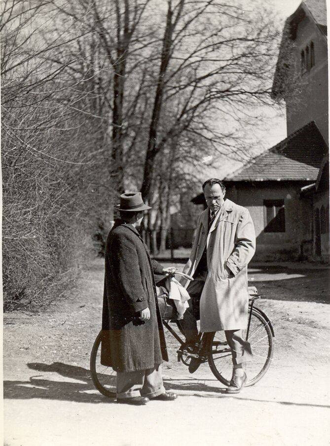 Nyilvános 1332 | 2905 | Vértes Imre tanár úr jellegzetes elgondolkozó pózában látható a Mozikertben, a félig háttal álló kalapos ember – a tanítvány, a képet beküldő dr. Cserfalvi Tamás édesapja – Cserfalvi József. A kép 1954-55-környékén készülhetett. | |