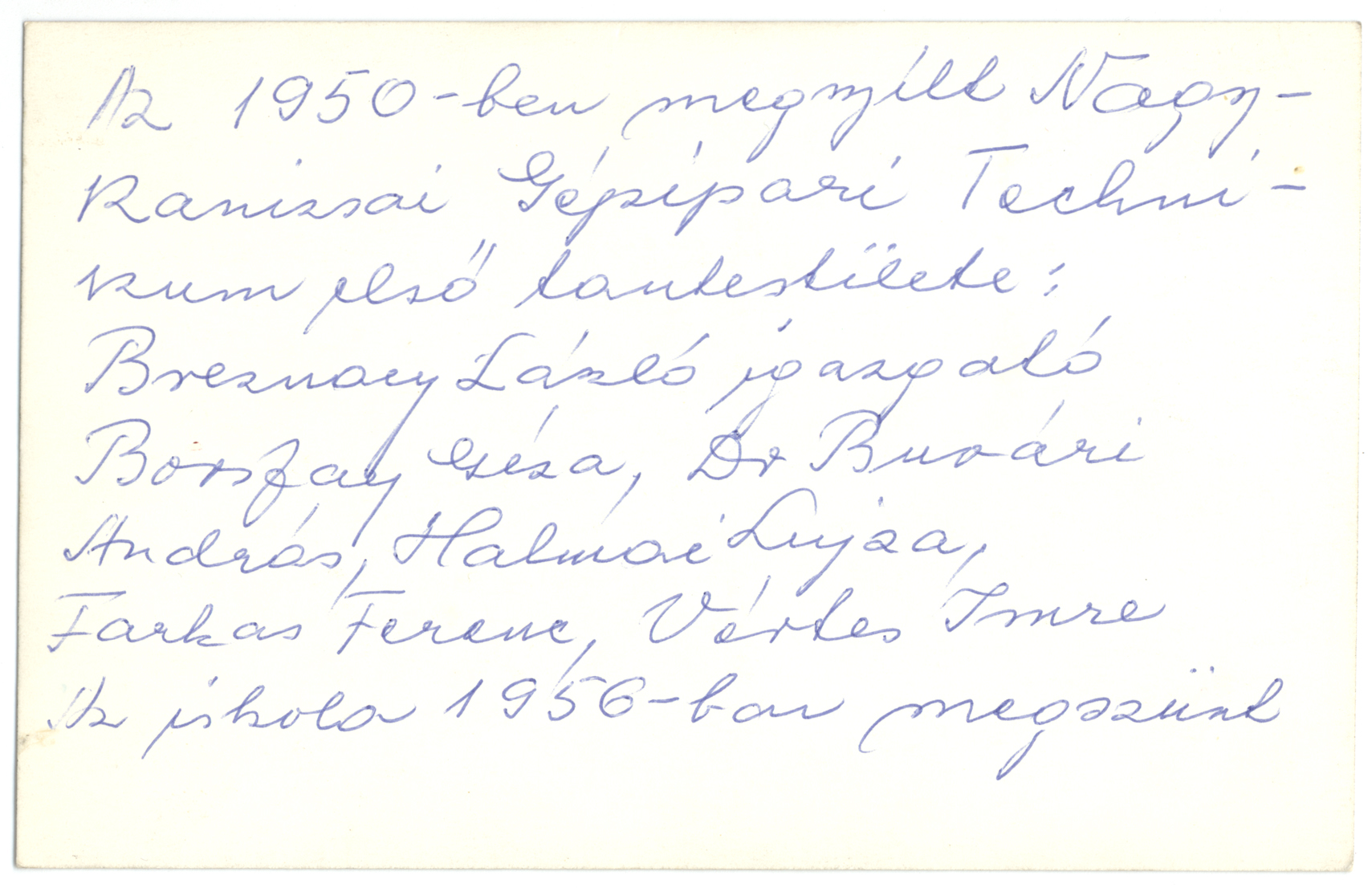 Nyilvános 1208 | 2777 | Az 1950-ben megnyílt Nagykanizsai Gépipari Technikum első tantestülete (balról jobbra): Borsfay Géza, Halmai Lujza, Farsang Ferenc, Vértes Imre, Breznay László igazgató, dr. Buvári András. Az iskola 1956-ban megszűnt | |