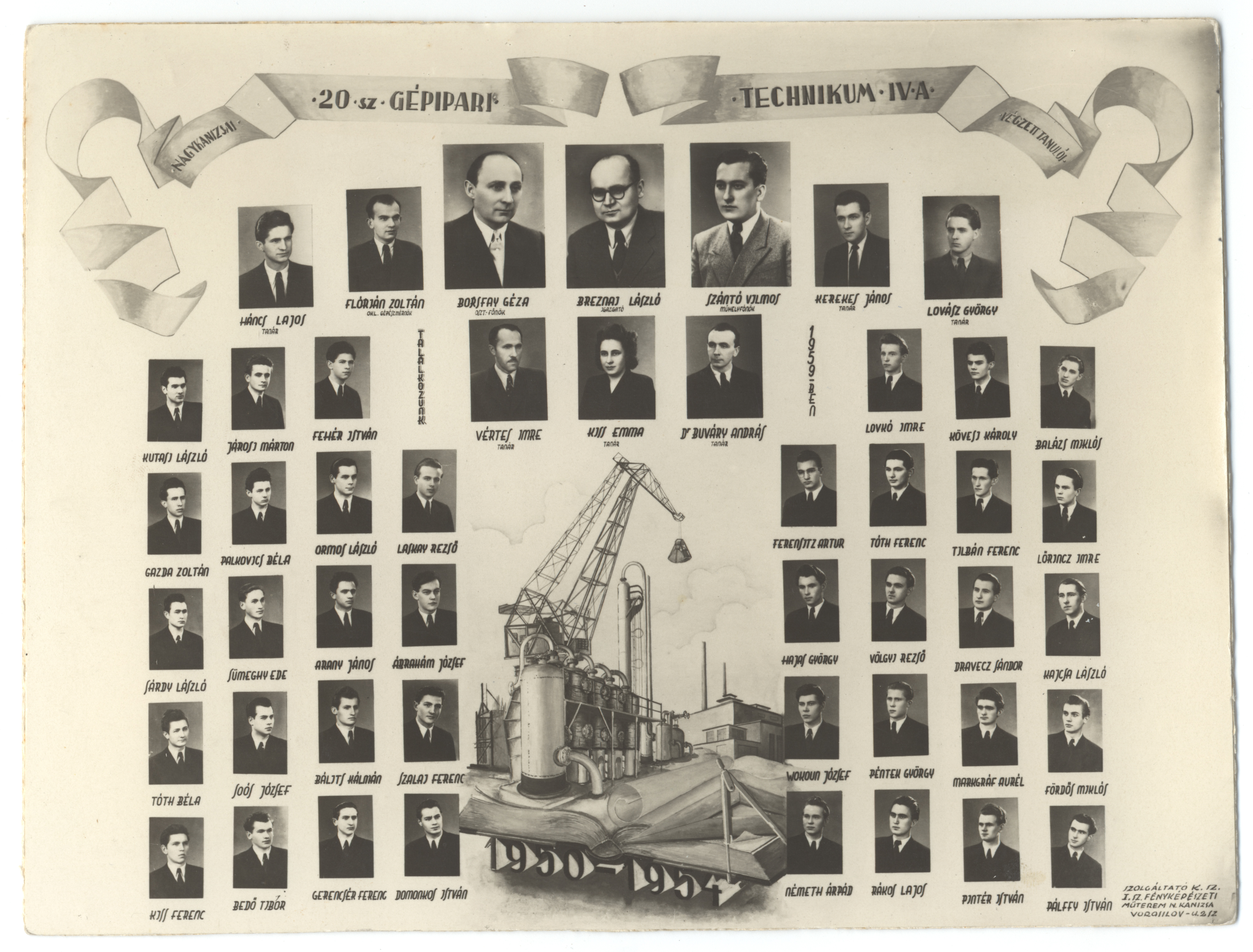Nyilvános 1158 | 2190 | Nagykanizsai 20 sz Gépipari Technikum IV A végzett tanulói | Borsfay Géza osztályfőnök Breznai László igazgató Buváry András dr. Flórján Zoltán olk. gépészmérnök Háncs Lajos tanár Kerekes János tanár Kiss Emma tanár Lovász György tanár Szántó Vilmos műhelyfőnök Vértes Imre tanár Ábrahám József Arany János Balázs Miklós Bálits Kálmán Bedő Tibor Domonkos István Dravecz Sándor Fehér István Ferensitz Artur Fördős Miklós Gazda Zoltán Gerencsér Ferenc Hajas György Járosi Márton Kajcsa László Kiss Ferenc Kövesi Károly Kutasi László Laskay Rezső Lovkó Imre Lőrincz Imre Markgráf Aurél Németh Árpád Ormos László Pálffy István Palkovics Béla Péntek György Pintér István Rákos Lajos Sárdy László Soós József Sümeghy Ede Szalai Ferenc Tilbán Ferenc Tóth Béla Tóth Ferenc Völgyi Rezső Wokoun József |