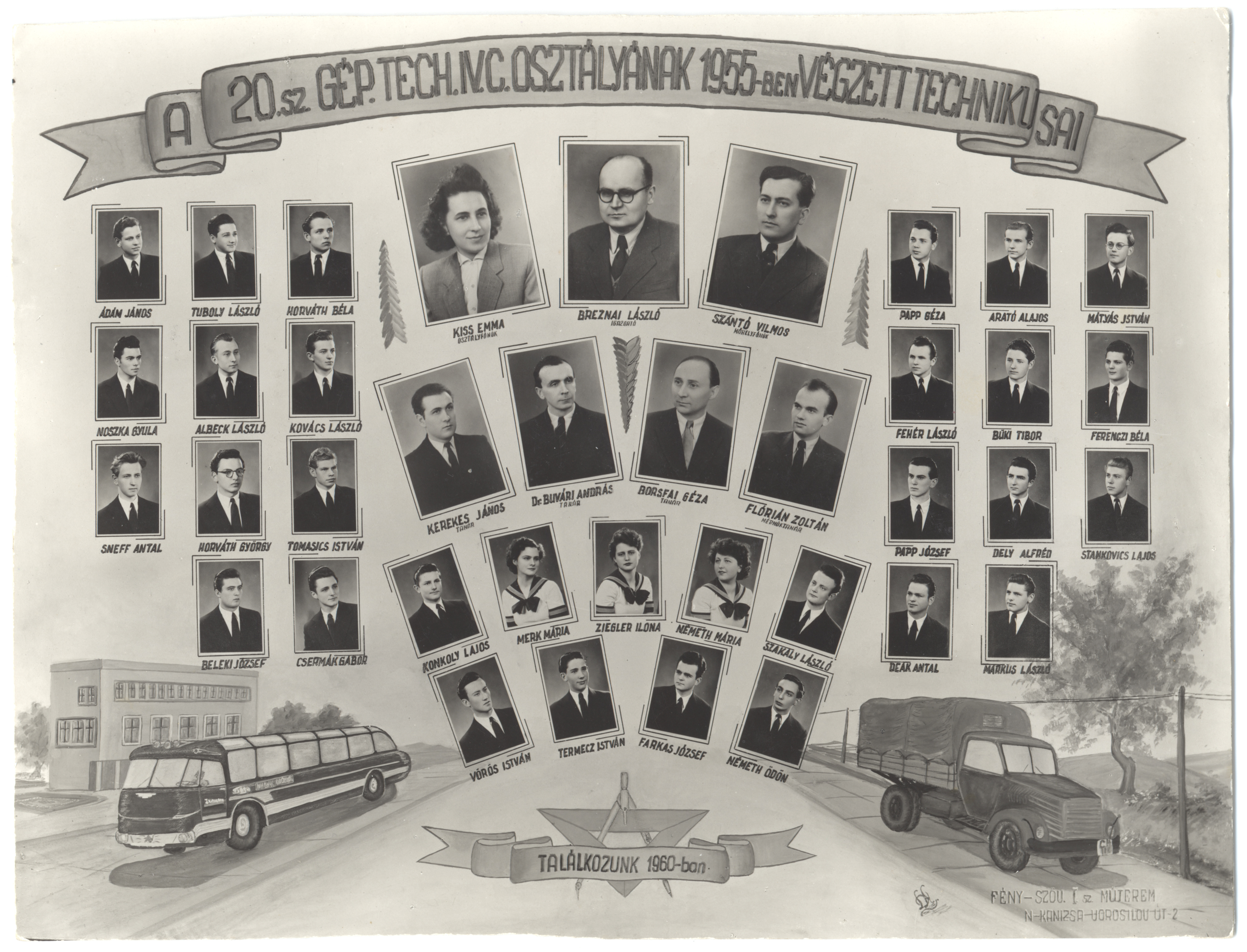 Nyilvános 1135 | 2441 | A 20.sz. Gép. Tech. IV. C. osztályának 1955-ben végzett technikusai | Borsfai Géza tanár Breznai László igazgató Buvári András dr. tanár Flórián Zoltán mérnöktanár Kerekes János tanár Kiss Emma osztályfőnök Szántó Vilmos műhelyfőnök Ádám János Albeck László Arató Alajos Beleki József Büki Tibor Csermák Gábor Deák Antal Dely Alfréd Farkas József Fehér László Ferenczi Béla Horváth Béla Horváth György Konkoly Lajos Kovács László Márkus László Mátyás István Merk Mária Németh Mária Németh Ödön Noszka Gyula Papp Géza Papp József Sneff Antal Stankovics Lajos Szakály László Termecz István Tomasics István Tuboly László Vörös István Ziegler Ilona |