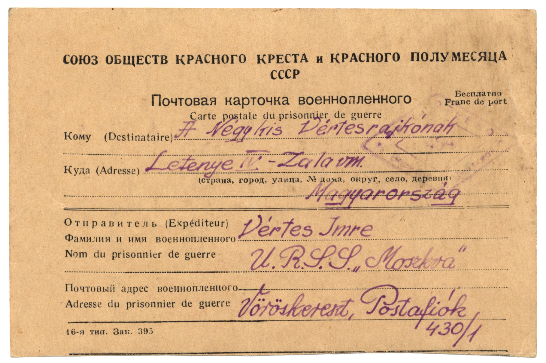 Nyilvános 1064 | 2044 | A Négy kis Vértesrajkónak | Letenye IV. - Zala vm. Magyarország Vértes Imre U.R.S.S. "Moszkva" Vöröskereszt, Postafiók 430/1. c. 1947. II. 10. Kicsiny fészek, benn négy fecske, Élő fészek élő kincse: Négy fióka; négy kis lélek Gellért, Jutka, bennem éltek, Eszter, Györgyi: Kicsi fecskék, Rátok szállnak álomlepkék Attól, akit hazavártok, Éj-nap, aki gondol Rátok. Messzeszakadt Apukátok |