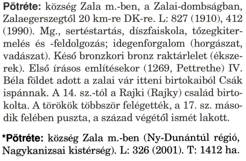 Nyilvános 1832 | 3710 | Rövid leírás | Teljes leírás (2.35 KB) | A szócikkek felismertetett szövege: (A csillag után a kiegészítő kötetből származó szöveg következik) Pötréte: község Zala m.-ben, a Zalai-dombságban, Zalaegerszegtől 20 km-re DK-re. L: 827 (1910), 412 (1990). Mg., sertéstartás, díszfaiskola, tőzegkitermelés és -feldolgozás; idegenforgalom (horgászat, vadászat). Késő bronzkori bronz raktárlelet (ékszerek). Első írásos említésekor (1269, Pettrethe) IV. Béla földet adott a zalai vár itteni birtokaiból Csák ispánnak. A 14. sz.-tól a Rajki (Rajky) család birtokolta. A törökök többször felégették, a 17. sz. második felében puszta, a század végétől ismét lakott. *Pötréte: község Zala m.-ben (Ny-Dunántúl régió, Nagykanizsai kistérség). L: 326 (2001). T: 1412 ha. A szócikkek a következő lexikonból származnak: Cím: Magyar nagylexikon Közreműködő: Élesztős László (1949) (szerk.) ; Barabás Éva (1943) (szerk.) ; Berényi Gábor (1946) (szerk.) ; Bárány Lászlóné (szerk.) ; Adelmann-né Kertész Judit (1945) (közrem.) ; Froemel Károlyné Jáky Éva (1936) (közrem.) ; Akadémiai Kiadó és Nyomda Vállala Szerz. közl.: [... Élesztős László főszerk.] ; [szerk. Barabás Éva et al.] ; [bibliogr. Adelmanné Kertész Judit] ; [kész. az Akadémiai Kiadó Magyar Nagylexikon Szerkesztőségében] Kiadás: Budapest : Akad. K., 1993- Kötetei: 1. köt., A - Anc 2. köt., And - Bag 3. köt., Bah - Bij 4. köt., Bik - Bz 5. köt., C - Csem 6. köt., Csen - Ec 7. köt., Ed - Fe 8. köt., Ff - Gyep 9. köt., Gyer - Iq 10. köt., Ir - Kip 11. köt., Kir - Lem 12. köt., Len - Mep 13. köt., Mer - Nyk 14. köt., Nyl - Pom 15. köt., Pon - Sek 16. köt., Sel - Szö 17. köt., Szp - Ung 18. köt., Unh - Z 19. köt., Kiegészítő kötet, A - Z ETO jelzet: 030=945.11 Szakjelzet: 030 Cutter: M 14 ISBN: 963-05-6611-7 [!ISBN 963-05-6615-X] Nyelv: magyar Megjegyzés: Az 5. kötettől kiad. a Magyar Nagylexikon Kiadó ; A 6. kötettől főszerk. Berényi Gábor ; A 6. kötettől szakszerk. Bárány Lászlóné et al. ; A 6. kötettől bibliogr. Froemel Károlyné ; Bibliogr. a szócikkek végén |