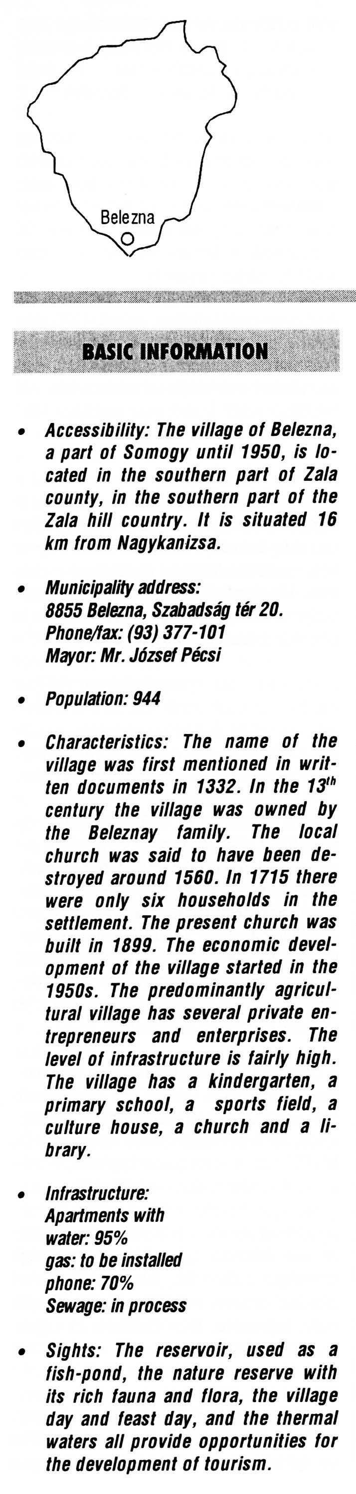 Nyilvános 1986 | 6114 | Belezna | BASIC INFORMATION • Accessibility: The village of Belezna, a part of Somogy until 1950, is located in the southern part of Zala county, in the southern part of the Zala hill country. It is situated 16 km from Nagykanizsa. • Municipality address: 8855 Belezna, Szabadság tér 20. Phone/fax: (93) 377-101 Mayor: Mr. József Pécsi • Population: 944 • Characteristics: The name of the village was first mentioned in written documents in 1332. In the 13th century the village was owned by the Beleznay family. The local church was said to have been destroyed around 1560. In 1715 there were only six households in the settlement. The present church was built in 1899. The economic development of the village started in the 1950s. The predominantly agricultural village has several private entrepreneurs and enterprises. The level of infrastructure is fairly high. The village has a kindergarten, a primary school, a sports field, a culture house, a church and a library. • Infrastructure: Apartments with water: 95% gas: to be installed phone: 70% Sewage: in process • Sights: The reservoir, used as a fish-pond, the nature reserve with its rich fauna and flora, the village day and feast day, and the thermal waters all provide opportunities for the development of tourism. This text came from the following book: Title: Handbook of Zala county (Zala megye kézikönyve) Series: County handbooks of Hungary (Magyarország megyei kézikönyvei) Chief editor: Hóbor József Publisher: (Hatvan), CEBA-Hungary Ltd, 1998 ETO: 908.439.121(035) ; 050.8(439.121) ISBN: 963-9089-18-2 Pages: 488-1040 p. Remark: Closed on: 1998. márc. 31. |