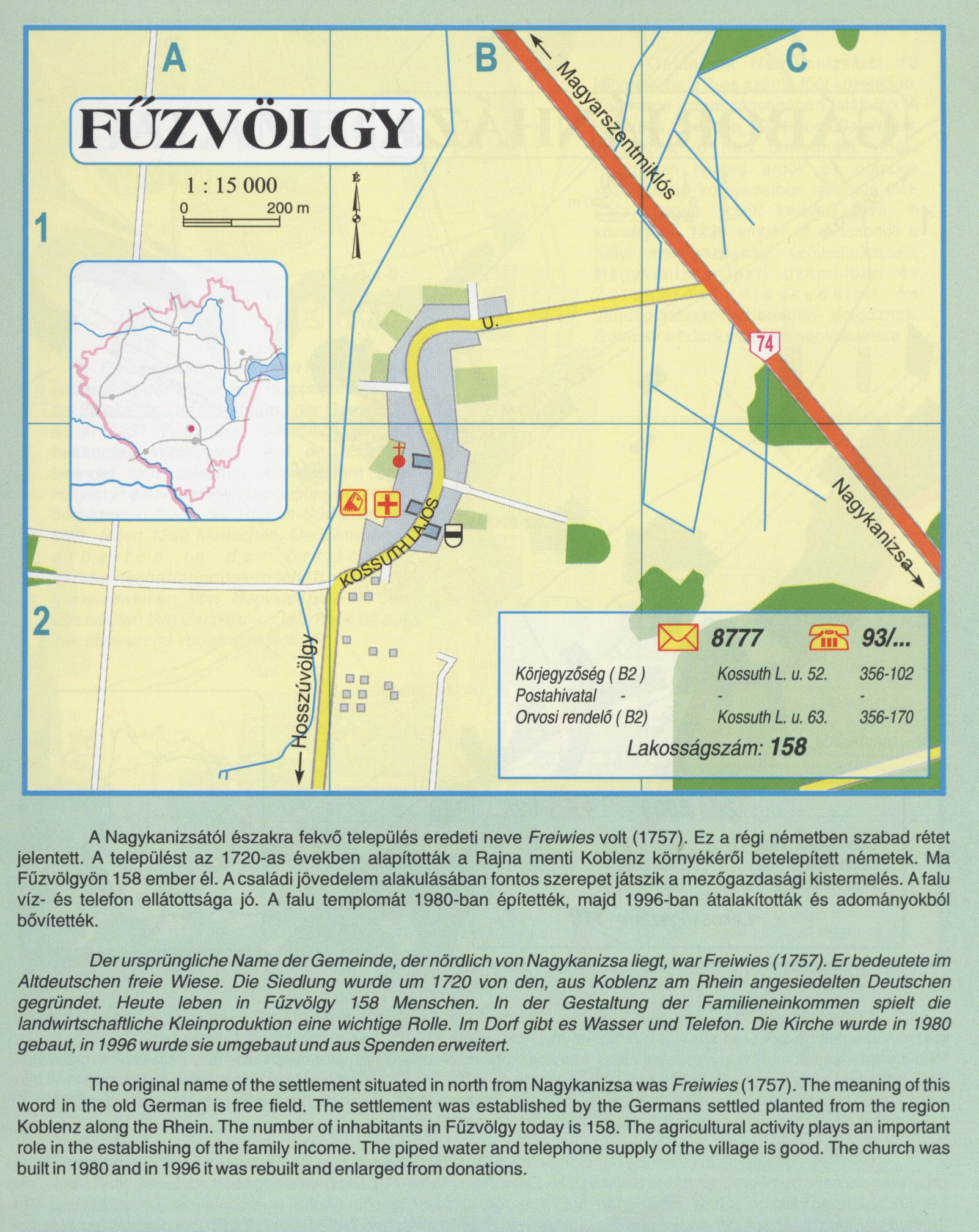 Nyilvános 2022 | 8602 | Fűzvölgy | A Nagykanizsától északra fekvő település eredeti neve Freiwies \\io\\\\ (1757). Ez a régi németben szabad rétet jelentett. A települést az 1720-as években alapították a Rajna menti Koblenz környékéről betelepített németek. Ma Fűzvölgyön 158 ember él. A családi jövedelem alakulásában fontos szerepet játszik a mezőgazdasági kistermelés. A falu víz- és telefon ellátottsága jó. A falu templomát 1980-ban építették, majd 1996-ban átalakították és adományokból bővítették. Der ursprüngliche Name der Gemeinde, der nördlich von Nagykanizsa liegt, war Freiwies (1757). Erbedeutete im Altdeutschen freie Wiese. Die Siedlung wurde um 1720 von den, aus Koblenz am Rhein angesiedelten Deutschen gegründet. Heute leben in Fűzvölgy 158 Menschen. In der Gestaltung der Familieneinkommen spielt die landwirtschaftliche Kleinproduktion eine wichtige Rolle. Im Dorf gibt es Wasser und Telefon. Die Kirche wurde in 1980 gebaut, in 1996 wurde sie umgebaut und aus Spenden erweitert. The original name of the settlement situated in north from Nagykanizsa was Freiwies (1757). The meaning of this word in the old German is free field. The settlement was established by the Germans settled planted from the region Koblenz along the Rhein. The number of inhabitants in Fűzvölgy today is 158. The agricultural activity plays an important role in the establishing of the family income. The piped water and telephone supply of the village is good. The church was built in 1980 and in 1996 it was rebuilt and enlarged from donations A részlet a következő kiadványból származik/Die Teile stammen vom volgenden Buch/This text came from the following book: Cím/Titel/Title: Zala megye településeinek atlasza - 257 település részletes térképe/Atlas der Komitat Zala - 257 Detailte Siedlungskarten/Zala county\'s Atlas - 257 settlement maps. Közreműködő/contributor: Lackner László (1943) (fotó) Kiadás/Ausgabe/Publisher: Gyula : HISZI-MAP, 1997 Sorozat/Serie/Series: Indulástól - megérkezésig... ETO: 912(439.121-2) ; 908.439.121 Cutter: Z 19 ISBN: 963-610-025-4 Oldalszám/Seiten/Pages: 323, 81 p. Megjegyzés/Note: Lezárva/Abgeschlossen am/Closed am: 1997. máj. 30. |
