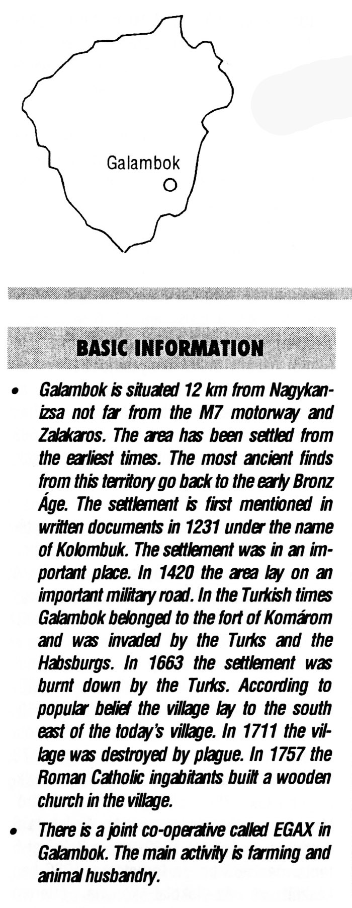 Nyilvános 2073 | 6182 | Galambok | BASIC INFORMATION Galambok is situated 12 km from Nagykanizsa not far from the M7 motorway and Zalakaros. The area has been settled from the earliest times. The most ancient finds from this territory go back to the early Bronz Age. The settlement is first mentioned in written documents in 1231 under the name of Kolombuk. The settlement was in an important place. In 1420 the area lay on an important military road. In the Turkish times Galambok belonged to the fort of Komárom and was invaded by the Turks and the Habsburgs. In 1663 the settlement was burnt down by the Turks. According to popular belief the village lay to the south east of the today\'s village. In 1711 the village was destroyed by plague. In 1757 the Roman Catholic ingabitants built a wooden church in the village. There is a joint co-operative called EGAX in Galambok. The main activity is farming and animal husbandry. This text came from the following book: Title: Handbook of Zala county (Zala megye kézikönyve) Series: County handbooks of Hungary (Magyarország megyei kézikönyvei) Chief editor: Hóbor József Publisher: (Hatvan), CEBA-Hungary Ltd, 1998 ETO: 908.439.121(035) ; 050.8(439.121) ISBN: 963-9089-18-2 Pages: 488-1040 p. Remark: Closed on: 1998. márc. 31. |