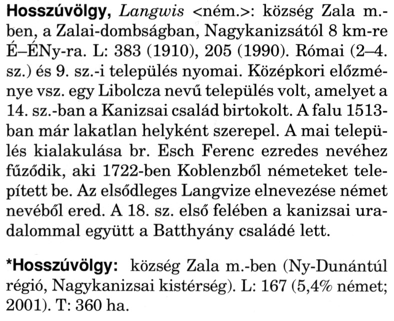 Nyilvános 1848 | 5373 | A szócikkek felismertetett szövege: | (A csillag után a kiegészítő kötetből származó szöveg következik) Hosszúvölgy, Langwis <ném.>: község Zala m.-ben, a Zalai-dombságban, Nagykanizsától 8 km-re É-ÉNy-ra. L: 383 (1910), 205 (1990). Római (2-4. sz.) és 9. sz.-i település nyomai. Középkori előzménye vsz. egy Libolcza nevű település volt, amelyet a 14. sz.-ban a Kanizsai család birtokolt. A falu 1513-ban már lakatlan helyként szerepel. A mai település kialakulása br. Esch Ferenc ezredes nevéhez fűződik, aki 1722-ben Koblenzből németeket telepített be. Az elsődleges Langvize elnevezése német nevéből ered. A 18. sz. első felében a kanizsai uradalommal együtt a Batthyány családé lett. *Hosszúvölgy: község Zala m.-ben (Ny-Dunántúl régió, Nagykanizsai kistérség). L: 167 (5,4% német; 2001). T: 360 ha. A szócikkek a következő lexikonból származnak: Cím: Magyar nagylexikon Közreműködő: Élesztős László (1949) (szerk.) ; Barabás Éva (1943) (szerk.) ; Berényi Gábor (1946) (szerk.) ; Bárány Lászlóné (szerk.) ; Adelmann-né Kertész Judit (1945) (közrem.) ; Froemel Károlyné Jáky Éva (1936) (közrem.) ; Akadémiai Kiadó és Nyomda Vállala Szerz. közl.: [... Élesztős László főszerk.] ; [szerk. Barabás Éva et al.] ; [bibliogr. Adelmanné Kertész Judit] ; [kész. az Akadémiai Kiadó Magyar Nagylexikon Szerkesztőségében] Kiadás: Budapest : Akad. K., 1993- Kötetei: 1. köt., A - Anc 2. köt., And - Bag 3. köt., Bah - Bij 4. köt., Bik - Bz 5. köt., C - Csem 6. köt., Csen - Ec 7. köt., Ed - Fe 8. köt., Ff - Gyep 9. köt., Gyer - Iq 10. köt., Ir - Kip 11. köt., Kir - Lem 12. köt., Len - Mep 13. köt., Mer - Nyk 14. köt., Nyl - Pom 15. köt., Pon - Sek 16. köt., Sel - Szö 17. köt., Szp - Ung 18. köt., Unh - Z 19. köt., Kiegészítő kötet, A - Z ETO jelzet: 030=945.11 Szakjelzet: 030 Cutter: M 14 ISBN: 963-05-6611-7 [!ISBN 963-05-6615-X] Nyelv: magyar Megjegyzés: Az 5. kötettől kiad. a Magyar Nagylexikon Kiadó ; A 6. kötettől főszerk. Berényi Gábor ; A 6. kötettől szakszerk. Bárány Lászlóné et al. ; A 6. kötettől bibliogr. Froemel Károlyné ; Bibliogr. a szócikkek végén |