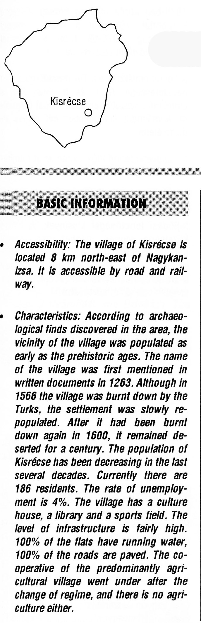 Nyilvános 1927 | 5534 | Kisrécse | BASIC INFORMATION Accessibility: The village of Kisrécse is located 8 km north-east of Nagykanizsa. It is accessible by road and railway. Characteristics: According to archaeological finds discovered in the area, the vicinity of the village was populated as early as the prehistoric ages. The name of the village was first mentioned in written documents in 1263. Although in 1566 the village was burnt down by the Turks, the settlement was slowly re-populated. After it had been burnt down again in 1600, it remained deserted for a century. The population of Kisrécse has been decreasing in the last several decades. Currently there are 186 residents. The rate of unemployment is 4%. The village has a culture house, a library and a sports field. The level of infrastructure is fairly high. 100% of the flats have running water, 100% of the roads are paved. The cooperative of the predominantly agricultural village went under after the change of regime, and there is no agriculture either. This text came from the following book: Title: Handbook of Zala county (Zala megye kézikönyve) Series: County handbooks of Hungary (Magyarország megyei kézikönyvei) Chief editor: Hóbor József Publisher: (Hatvan), CEBA-Hungary Ltd, 1998 ETO: 908.439.121(035) ; 050.8(439.121) ISBN: 963-9089-18-2 Pages: 488-1040 p. Remark: Closed on: 1998. márc. 31. |