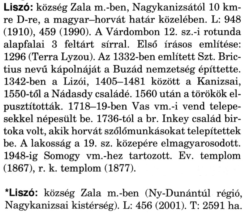 Nyilvános 2306 | 6390 | Rövid leírás | Teljes leírás (2.51 KB) | A szócikkek felismertetett szövege: (A csillag után a kiegészítő kötetből származó szöveg következik) Liszó: község Zala m.-ben, Nagykanizsától 10 km-re D-re, a magyar–horvát határ közelében. L: 948 (1910), 459 (1990). A Várdombon 12. sz.-i rotunda alapfalai 3 feltárt sírral. Első írásos említése: 1296 (Terra Lyzou). Az 1332-ben említett Szt. Bric-tius nevű kápolnáját a Buzád nemzetség építtette. 1342-ben a Lizói, 1405-1481 között a Kanizsai, 1550-től a Nádasdy családé. 1560 után a törökök elpusztították. 1718–19-ben Vas vm.-i vend telepesekkel népesült be. 1736-tól a br. Inkey család birtoka volt, akik horvát szőlőmunkásokat telepítettek be. A lakosság a 19. sz. közepére elmagyarosodott. 1948-ig Somogy vm.-hez tartozott. Ev. templom (1867), r. k. templom (1877). *Liszó: község Zala m.-ben (Ny-Dunántúl régió, Nagykanizsai kistérség). L: 456 (2001). T: 2591 ha. A szócikkek a következő lexikonból származnak: Cím: Magyar nagylexikon Közreműködő: Élesztős László (1949) (szerk.) ; Barabás Éva (1943) (szerk.) ; Berényi Gábor (1946) (szerk.) ; Bárány Lászlóné (szerk.) ; Adelmann-né Kertész Judit (1945) (közrem.) ; Froemel Károlyné Jáky Éva (1936) (közrem.) ; Akadémiai Kiadó és Nyomda Vállala Szerz. közl.: [... Élesztős László főszerk.] ; [szerk. Barabás Éva et al.] ; [bibliogr. Adelmanné Kertész Judit] ; [kész. az Akadémiai Kiadó Magyar Nagylexikon Szerkesztőségében] Kiadás: Budapest : Akad. K., 1993- Kötetei: 1. köt., A - Anc 2. köt., And - Bag 3. köt., Bah - Bij 4. köt., Bik - Bz 5. köt., C - Csem 6. köt., Csen - Ec 7. köt., Ed - Fe 8. köt., Ff - Gyep 9. köt., Gyer - Iq 10. köt., Ir - Kip 11. köt., Kir - Lem 12. köt., Len - Mep 13. köt., Mer - Nyk 14. köt., Nyl - Pom 15. köt., Pon - Sek 16. köt., Sel - Szö 17. köt., Szp - Ung 18. köt., Unh - Z 19. köt., Kiegészítő kötet, A - Z ETO jelzet: 030=945.11 Szakjelzet: 030 Cutter: M 14 ISBN: 963-05-6611-7 [!ISBN 963-05-6615-X] Nyelv: magyar Megjegyzés: Az 5. kötettől kiad. a Magyar Nagylexikon Kiadó ; A 6. kötettől főszerk. Berényi Gábor ; A 6. kötettől szakszerk. Bárány Lászlóné et al. ; A 6. kötettől bibliogr. Froemel Károlyné ; Bibliogr. a szócikkek végén |