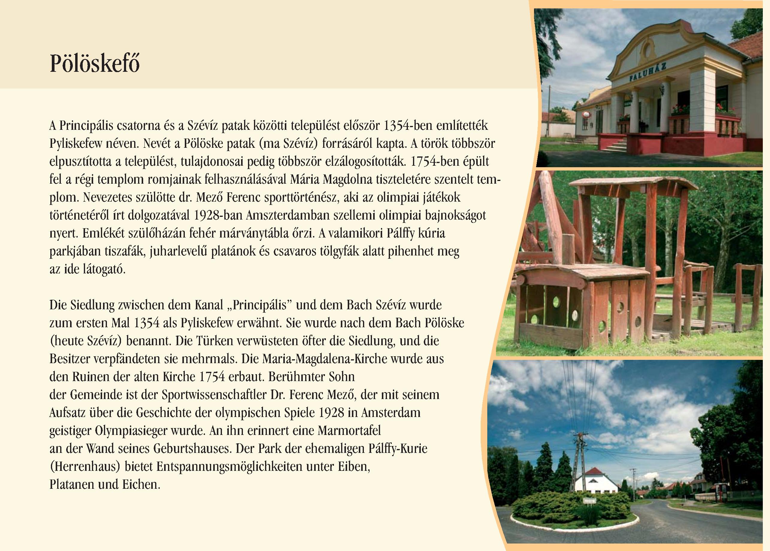 Nyilvános 2069 | 5895 | Pölöskefő | Die Siedlung zwischen dem Kanal ,,Principális" und dem Bach Szévíz wurde zum ersten Mal 1354 als Pyliskefew erwähnt. Sie wurde nach dem Bach Pölöske (heute Szévíz) benannt. Die Türken verwüsteten öfter die Siedlung, und die Besitzer verpfändeten sie mehrmals. Die Maria-Magdalena-Kirche wurde aus den Ruinen der alten Kirche 1754 erbaut. Berühmter Sohn der Gemeinde ist der Sportwissenschaftler Dr. Ferenc Mező, der mit seinem Aufsatz über die Geschichte der olympischen Spiele 1928 in Amsterdam geistiger Olympiasieger wurde. An ihn erinnert eine Marmortafel an der Wand seines Geburtshauses. Der Park der ehemaligen Pálffy-Kurie (Herrenhaus) bietet Entspannungsmöglichkeiten unter Eiben, Platanen und Eichen. Dieses Text stammt von: Pannonhát tájpark prospektus 2006. Web: http://www.pannonhat.hu/ (auch in Deutsch) |