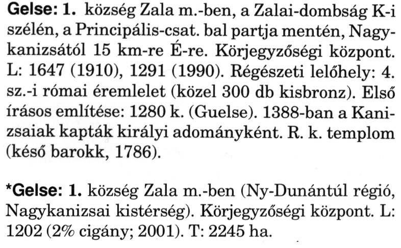Nyilvános 2036 | 5874 | A szócikkek felismertetett szövege: | (A csillag után a kiegészítő kötetből származó szöveg következik) Gelse: 1. község Zala m.-ben, a Zalai-dombság K-i szélén, a Principális-csat, bal partja mentén, Nagykanizsától 15 km-re É-re. Körjegyzőségi központ. L: 1647 (1910), 1291 (1990). Régészeti lelőhely: 4. sz.-i római éremlelet (közel 300 db kisbronz). Első írásos említése: 1280 k. (Guelse). 1388-ban a Kanizsaiak kapták királyi adományként. R. k. templom (késő barokk, 1786). *Gelse: 1. község Zala m.-ben (Ny-Dunántúl régió, Nagykanizsai kistérség). Körjegyzőségi központ. L: 1202 (2% cigány; 2001). T: 2245 ha. A szócikkek a következő lexikonból származnak: Cím: Magyar nagylexikon Közreműködő: Élesztős László (1949) (szerk.) ; Barabás Éva (1943) (szerk.) ; Berényi Gábor (1946) (szerk.) ; Bárány Lászlóné (szerk.) ; Adelmann-né Kertész Judit (1945) (közrem.) ; Froemel Károlyné Jáky Éva (1936) (közrem.) ; Akadémiai Kiadó és Nyomda Vállala Szerz. közl.: [... Élesztős László főszerk.] ; [szerk. Barabás Éva et al.] ; [bibliogr. Adelmanné Kertész Judit] ; [kész. az Akadémiai Kiadó Magyar Nagylexikon Szerkesztőségében] Kiadás: Budapest : Akad. K., 1993- Kötetei: 1. köt., A - Anc 2. köt., And - Bag 3. köt., Bah - Bij 4. köt., Bik - Bz 5. köt., C - Csem 6. köt., Csen - Ec 7. köt., Ed - Fe 8. köt., Ff - Gyep 9. köt., Gyer - Iq 10. köt., Ir - Kip 11. köt., Kir - Lem 12. köt., Len - Mep 13. köt., Mer - Nyk 14. köt., Nyl - Pom 15. köt., Pon - Sek 16. köt., Sel - Szö 17. köt., Szp - Ung 18. köt., Unh - Z 19. köt., Kiegészítő kötet, A - Z ETO jelzet: 030=945.11 Szakjelzet: 030 Cutter: M 14 ISBN: 963-05-6611-7 [!ISBN 963-05-6615-X] Nyelv: magyar Megjegyzés: Az 5. kötettől kiad. a Magyar Nagylexikon Kiadó ; A 6. kötettől főszerk. Berényi Gábor ; A 6. kötettől szakszerk. Bárány Lászlóné et al. ; A 6. kötettől bibliogr. Froemel Károlyné ; Bibliogr. a szócikkek végén |