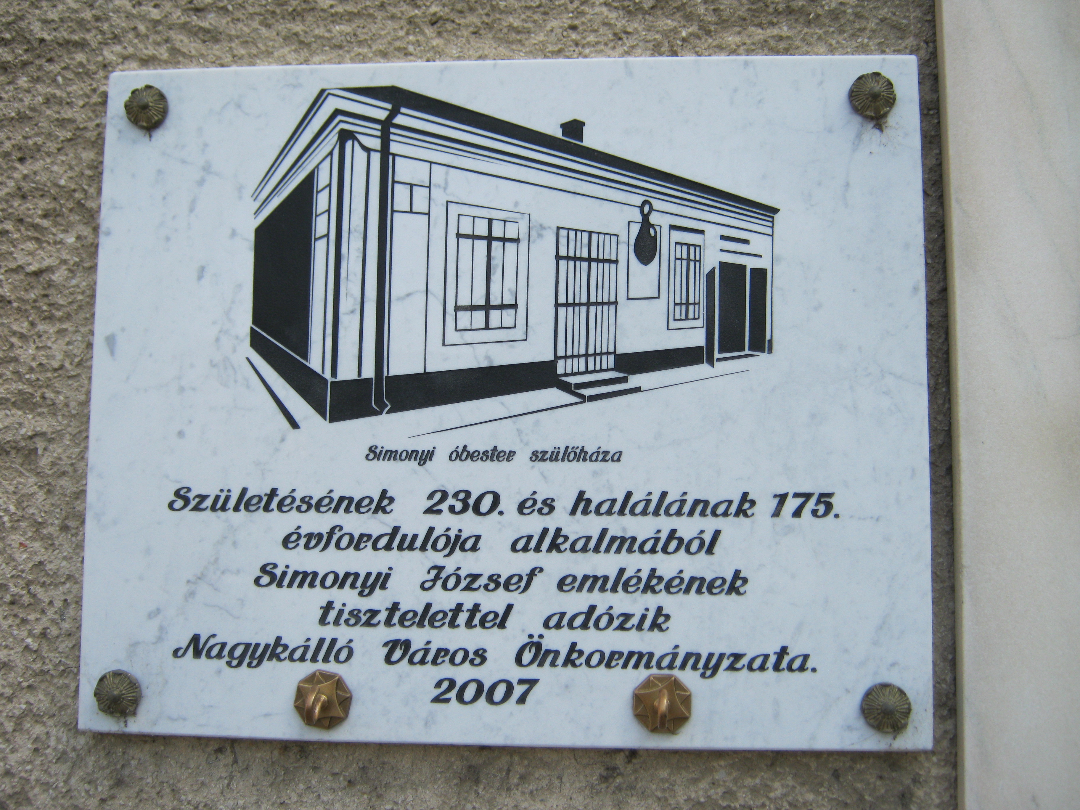 Nyilvános 1115 | 2655 | Nagykálló, Bátori út 2. | Egykor ezen a helyen állott a legendás Simonyi óbester szülőháza. Barbácsi és vitézvári báró Simonyi József (1771. március 18. – 1832. augusztus 23.), legendás hírű huszártiszt volt, kortársai "a legvitézebb huszár" kitüntető címmel illették. A panelházon szerencsére legalább látható az eredeti épületen 1932-ben elhelyezett emléktábla, egy új márványtáblán pedig megörökítették a szülőház képét. A fénykép 2010 augusztus elején készült. |