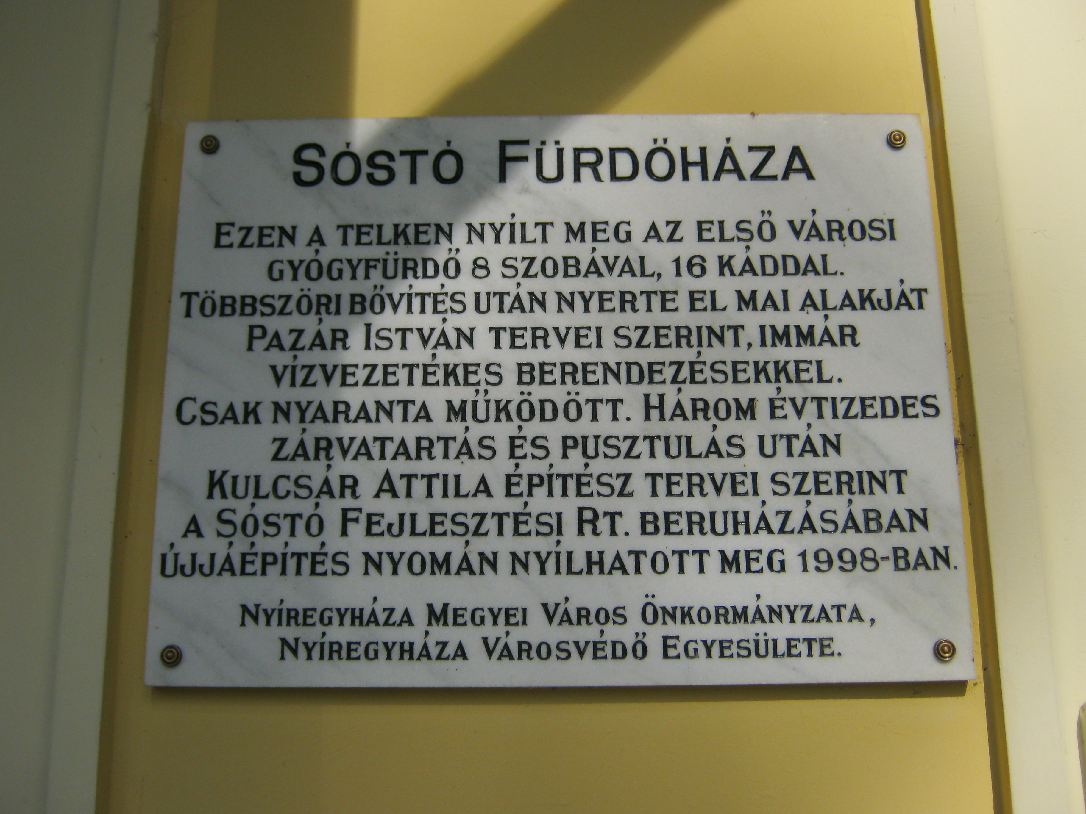 Nyilvános 768 | 1271 | Nyíregyháza-Sóstó, Fürdőház | A várostól 5 kilométerre fekvő Sóstó kedves kirándulóhelye a nyíregyháziaknak. A képen az első fürdőház műemlékké nyilvánított épülete látható.Ezen a helyen nyílt meg az első városi gyógyfürdő 1805-ben. Többszöri bővítés után mai alakját Pazár István tervei alapján 1911-ben nyerte el. Az 1970-es évek közepe után üresen álló, egyre jobban lepusztuló épületet 1997/98-ban újították fel. A fénykép 2010 augusztus elején készült |