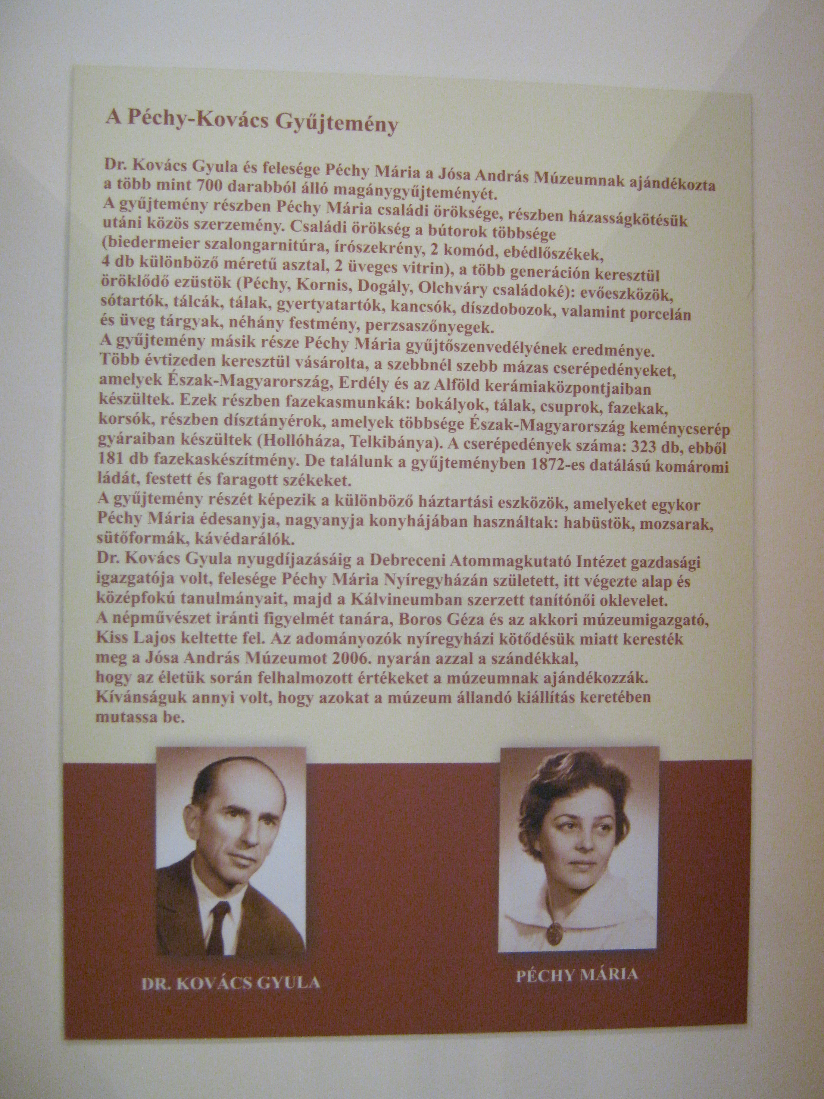 Nyilvános 803 | 1301 | Nyíregyháza, Benczúr tér 21. Jósa András Múzeum | Magyarország egyik legrégibb múzeumát Dr. Jósa András alapította 1868-ban, akinek ma nevét viseli. Egyik állandó kiállítása a Péchy - Kovács-gyűjtemény, dr. Kovács Gyula és felesége, Péchy Mária több, mint 700 darabból álló magánygyűjteménye. Dr. Kovács Gyula nyugdíjazásáig a Debreceni Atommagkutató Intézet gazdasági igazgatója volt, felesége tanítónő. A gyűjtemény egyik részét bútorok (biedermeier szalongarnitúra, ebédlőszékek, írószekrény stb.) és ezüst evőeszközök, tálcák, gyertyatartók és más tárgyak, valamint festmények és perzsaszőnyegek alkotják. A másik rész Péchy Mária gyűjtőszenvedélyének eredménye, aki több évtizeden keresztül vásárolta, a szebbnél szebb mázas cserépedényeket, amelyek Észak-Magyarország, Erdély és az Alföld kerámiaközpontjaiban készültek. Vannak itt különböző háztartási eszközök, amelyeket egykor Péchy Mária édesanyja, nagyanyja használt: habüstök, mozsarak, sütőformák, kávédarálók. Felh. irod.: Látnivalók Szabolcs-Szatmár-Bereg megyében. Miskolc, Well-PRess, 1999 http://jam.nyirbone.hu A fénykép 2010 augusztus elején készült. |