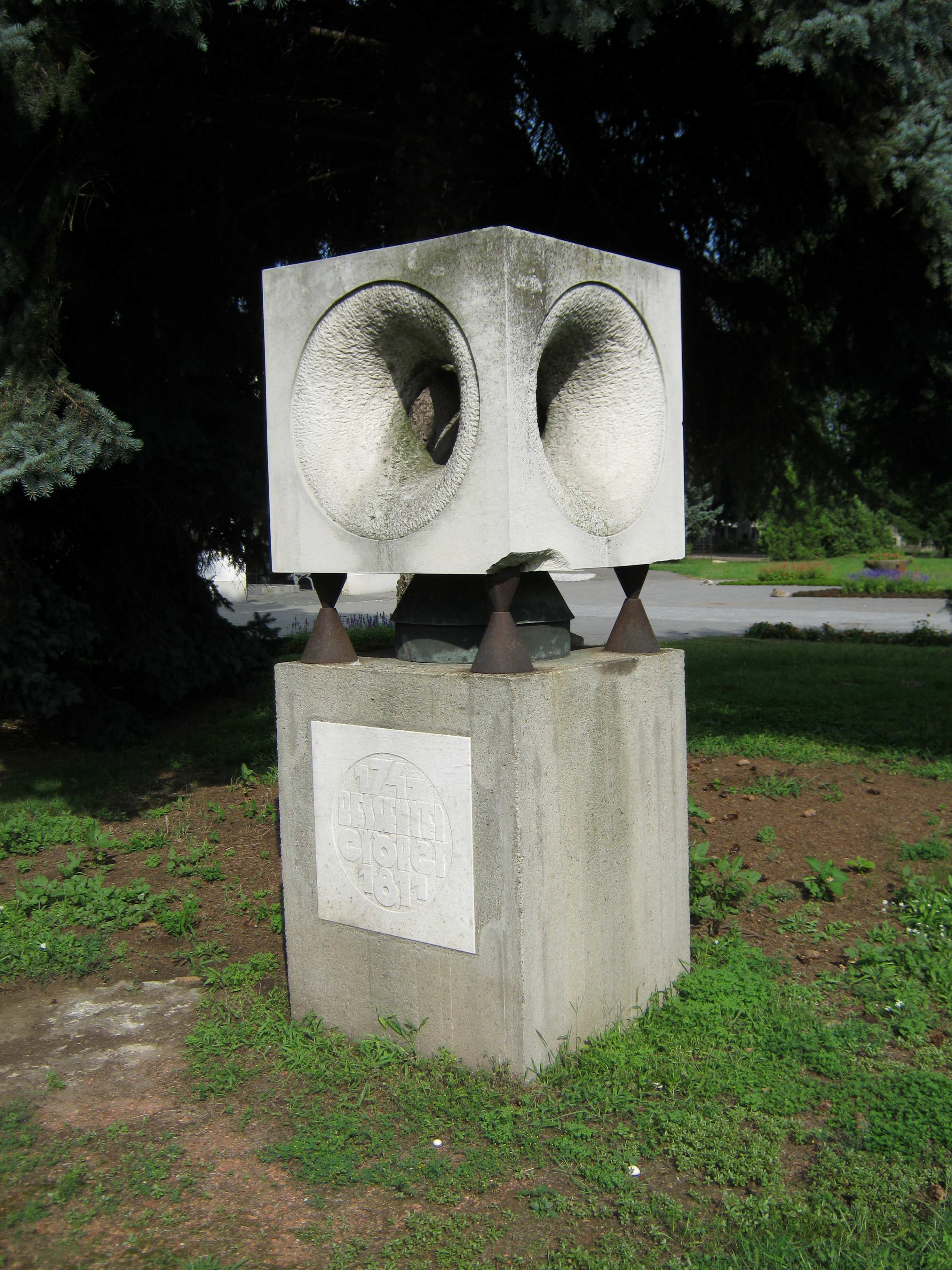 Nyilvános 848 | 1457 | Nyíregyháza, Pazonyi tér, Északi temető: Bessenyei György emlékműve | A Dózsa György út vezet Nyíregyháza Északi temetőjébe, amelyet a városlakók "Morgó" temetőnek is hívnak egy közeli régi kocsma neve alapján. Klinkertéglából készült jellegzetes bejáratát Rerrich Béla tervezte. A ravatalozó közelében, a Nemzeti Megbékélés Parkjában állították fel a temetőben nyugvó Bessenyei György (sírját lásd a következő képen) modern emlékművét, Bán Ferenc alkotását. Felh. irod.: Fazekas Árpád - Szekrényes András: Nyíregyháza temetői. Nyíregyháza, 1990 A fénykép 2010 augusztus elején készült |