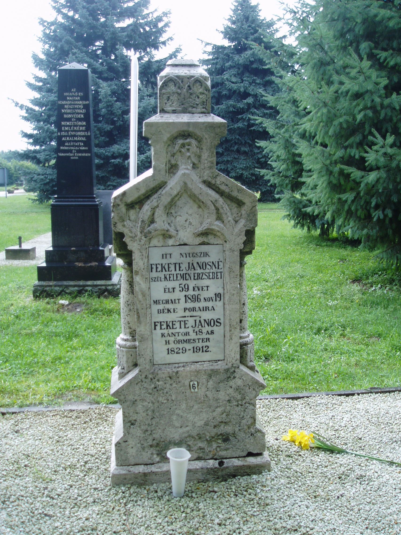 Nyilvános 869 | 1470 | Nyíregyháza, Pazonyi tér, Északi temető: Fekete János | A Dózsa György út vezet Nyíregyháza Északi temetőjébe. A ravatalozó közelében, a díszsírhelyek között találjuk Fekete János (1829-1912) kántor, 1848-as honvéd őrmester sírkövét. Felh. irod.: Fazekas Árpád - Szekrényes András: Nyíregyháza temetői. Nyíregyháza, 1990 A fénykép 2010 augusztus elején készült |