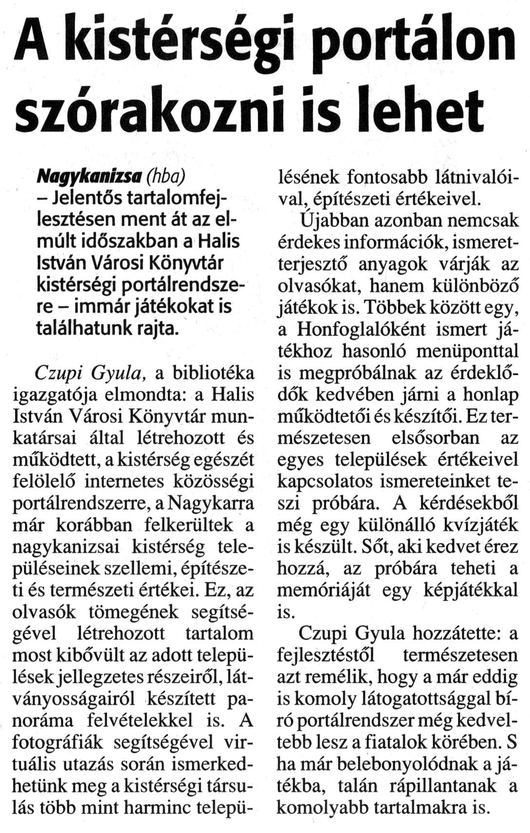 Nyilvános 934 | 1316 | Zalai Hírlap 2009. február 3. 28. szám 12. oldal | A kistérségi portálon szórakozni is lehet A cikk szövege: A kistérségi portálon szórakozni is lehet Nagykanizsa (hba) - Jelentős tartalomfejlesztésen ment át az elmúlt időszakban a Halis István Városi Könyvtár kistérségi portálrendszere - immár játékokat is találhatunk rajta. Czupi Gyula, a bibliotéka igazgatója elmondta: a Halis István Városi Könyvtár munkatársai által létrehozott és működtett, a kistérség egészét felölelő internetes közösségi portálrendszerre, a Nagykarra már korábban felkerültek a nagykanizsai kistérség településeinek szellemi, építészeti és természeti értékei. Ez, az olvasók tömegének segítségével létrehozott tartalom most kibővült az adott településekjellegzetes részeiről, látványosságairól készített panoráma felvételekkel is. A fotográfiák segítségével virtuális utazás során ismerkedhetünk meg a kistérségi társulás több mint harminc településének fontosabb látnivalóival, építészeti értékeivel. Ujabban azonban nemcsak érdekes információk, ismeretterjesztő anyagok várják az olvasókat, hanem különböző játékok is. Többek között egy, a Honfoglalóként ismert játékhoz hasonló menüponttal is megpróbálnak az érdeklődők kedvében járni a honlap működtetői és készítői. Ez természetesen elsősorban az egyes települések értékeivel kapcsolatos ismereteinket teszi próbára. A kérdésekből még egy különálló kvízjáték is készült. Sőt, aki kedvet érez hozzá, az próbára teheti a memóriáját egy képjátékkal is. Czupi Gyula hozzátette: a fejlesztéstől természetesen azt remélik, hogy a már eddig is komoly látogatottsággal bíró portálrendszer még kedveltebb lesz a fiatalok körében. S ha már belebonyolódnak a játékba, talán rápillantanak a komolyabb tartalmakra is. |