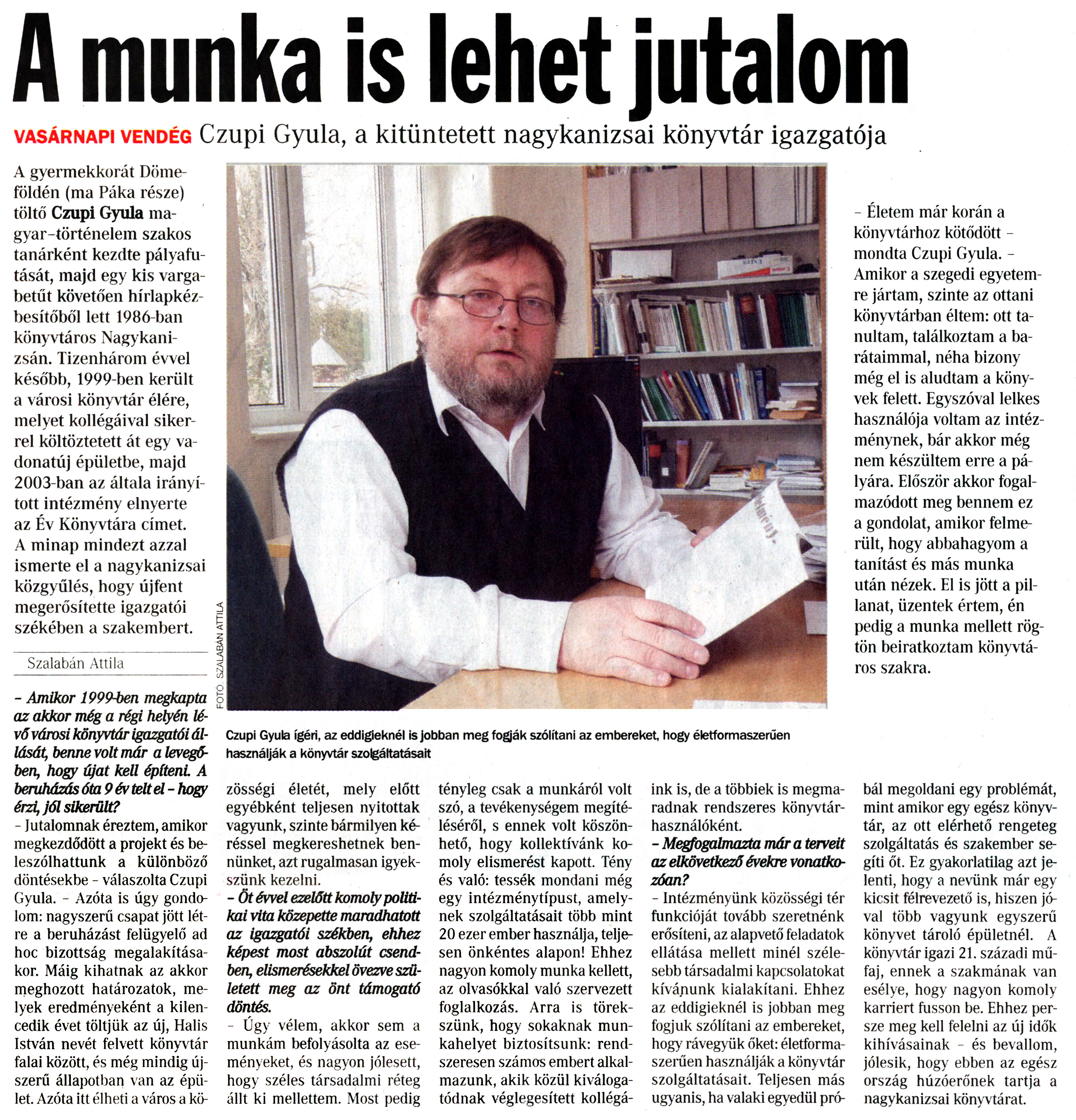 Nyilvános 972 | 2396 | Vasárnapi Zalai Hírlap 2009. április 5. 13. szám 3. oldal - A munka is lehet jutalom | A cikk szövege: A munka is lehet jutalom vasárnapi vendég Czupi Gyula, a kitüntetett nagykanizsai könyvtár igazgatója - Életem már korán a könyvtárhoz kötődött -mondta Czupi Gyula. -Amikor a szegedi egyetemre jártam, szinte az ottani könyvtárban éltem: ott tanultam, találkoztam a barátaimmal, néha bizony még el is aludtam a könyvek felett. Egyszóval lelkes használója voltam az intézménynek, bár akkor még nem készültem erre a pályára. Először akkor fogalmazódott meg bennem ez a gondolat, amikor felmerült, hogy abbahagyom a tanítást és más munka után nézek. El is jött a pillanat, üzentek értem, én pedig a munka mellett rögtön beiratkoztam könyvtáros szakra. Czupi Gyula ígéri, az eddigieknél is jobban meg fogják szólítani az embereket hogy életformaszerűen használják a könyvtár szolgáltatásait A gyermekkorát Dömeföldén (ma Páka része) töltő Czupi Gyula magyar-történelem szakos tanárként kezdte pályafutását, majd egy kis vargabetűt követően hírlapkézbesítőből lett 1986-ban könyvtáros Nagykanizsán. Tizenhárom évvel később, 1999-ben került a városi könyvtár élére, melyet kollégáival sikerrel költöztetett át egy vadonatúj épületbe, majd 2003-ban az általa irányított intézmény elnyerte az Év Könyvtára címet. A minap mindezt azzal ismerte el a nagykanizsai közgyűlés, hogy újfent megerősítette igazgatói székében a szakembert. Szalabán Attila - Amikor 1999-ben megkapta az akkor még a régi helyén lévő városi könyvtár igazgatói állását, benne volt már a levegőben, hogy újat kell építeni. A beruházás óta 9 év telt el - hogy érzi, jól sikerült? - Jutalomnak éreztem, amikor megkezdődött a projekt és beleszólhattunk a különböző döntésekbe - válaszolta Czupi Gyula. - Azóta is úgy gondolom: nagyszerű csapat jött létre a beruházást felügyelő ad hoc bizottság megalakításakor. Máig kihatnak az akkor meghozott határozatok, melyek eredményeként a kilencedik évet töltjük az új, Halis István nevét felvett könyvtár falai között, és még mindig újszerű állapotban van az épület. Azóta itt élheti a város a közösségi életét, mely előtt egyébként teljesen nyitottak vagyunk, szinte bármilyen kéréssel megkereshetnek bennünket, azt rugalmasan igyekszünk kezelni. - Öt évvel ezelőtt komoly politikai vita közepette maradhatott az igazgatói székben, ehhez képest most abszolút csendben, elismerésekkel övezve született meg az önt támogató döntés. - Úgy vélem, akkor sem a munkám befolyásolta az eseményeket, és nagyon jólesett, hogy széles társadalmi réteg állt ki mellettem. Most pedig tényleg csak a munkáról volt szó, a tevékenységem megítéléséről, s ennek volt köszönhető, hogy kollektívánk komoly elismerést kapott. Tény és való: tessék mondani még egy intézménytípust, amelynek szolgáltatásait több mint 20 ezer ember használja, teljesen önkéntes alapon! Ehhez nagyon komoly munka kellett, az olvasókkal való szervezett foglalkozás. Arra is törekszünk, hogy sokaknak munkahelyet biztosítsunk: rendszeresen számos embert alkalmazunk, akik közül kiváloga-tódnak véglegesített kollégáink is, de a többiek is megmaradnak rendszeres könyvtárhasználóként. - Megfogalmazta már a terveit az elkövetkező évekre vonatkozóan? - Intézményünk közösségi tér funkcióját tovább szeretnénk erősíteni, az alapvető feladatok ellátása mellett minél szélesebb társadalmi kapcsolatokat kívánunk kialakítani. Ehhez az eddigieknél is jobban meg fogjuk szólítani az embereket, hogy rávegyük őket: életformaszerűen használják a könyvtár szolgáltatásait. Teljesen más ugyanis, ha valaki egyedül próbál megoldani egy problémát, mint amikor egy egész könyvtár, az ott elérhető rengeteg szolgáltatás és szakember segíti őt. Ez gyakorlatilag azt jelenti, hogy a nevünk már egy kicsit félrevezető is, hiszen jóval több vagyunk egyszerű könyvet tároló épületnél. A könyvtár igazi 21. századi műfaj, ennek a szakmának van esélye, hogy nagyon komoly karriert fusson be. Ehhez persze meg kell felelni az új idők kihívásainak - és bevallom, jólesik, hogy ebben az egész ország húzóerőnek tartja a nagykanizsai könyvtárat. |