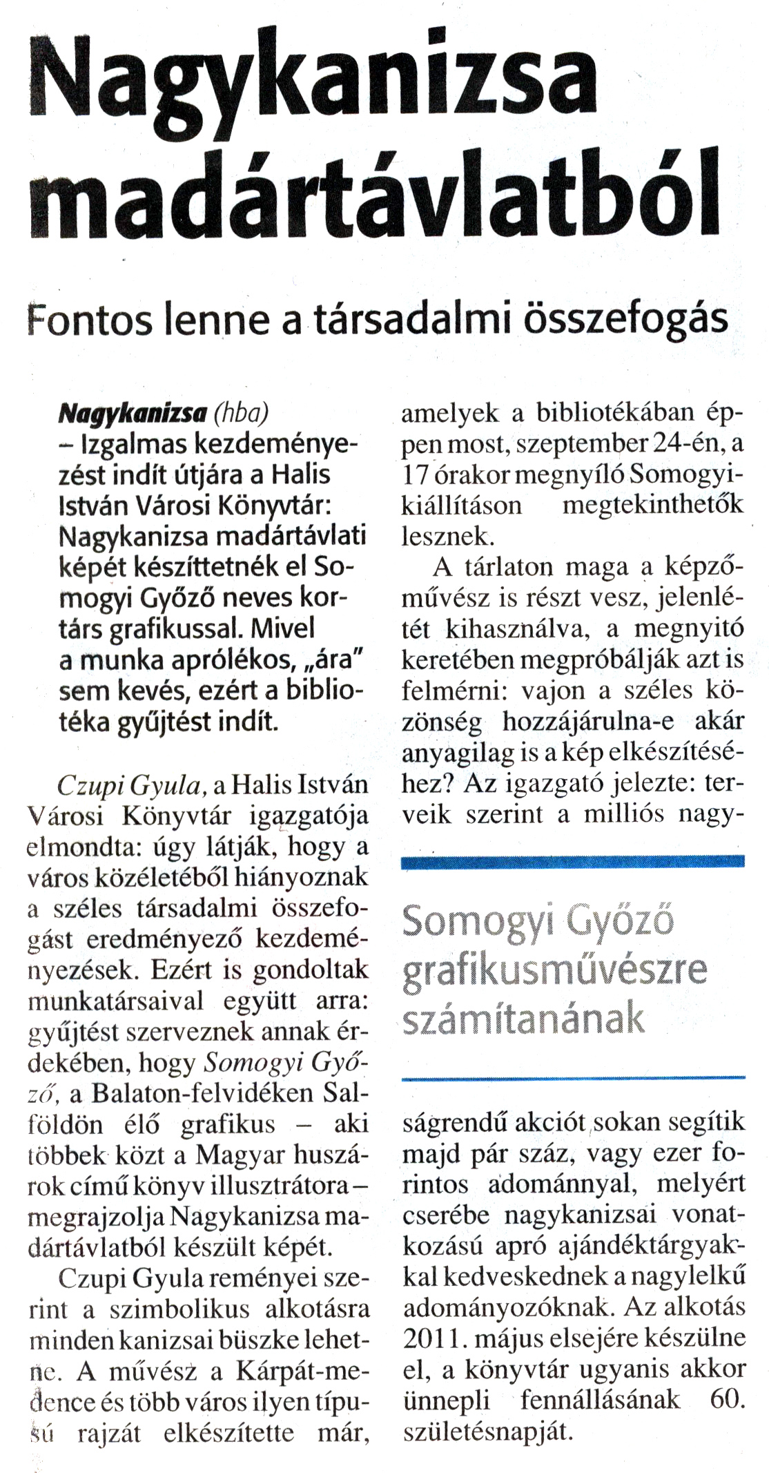 Nyilvános 954 | 1222 | Zalai Hírlap 2009. szeptember 15. 216. szám 7. oldal - Nagykanizsa madártávlatból | A cikk szövege: Nagykanizsa madártávlatból Fontos lenne a társadalmi összefogás Somogyi Győző grafikusművészre számítanának Nagykanizsa (hba) - Izgalmas kezdeményezést indít útjára a Halis István Városi Könyvtár: Nagykanizsa madártávlati képét készíttetnék el Somogyi Győző neves kortárs grafikussal. Mivel a munka aprólékos, „ára" sem kevés, ezért a bibliotéka gyűjtést indít. Czupi Gyula, a Halis István Városi Könyvtár igazgatója elmondta: úgy látják, hogy a város közéletéből hiányoznak a széles társadalmi összefogást eredményező kezdeményezések. Ezért is gondoltak munkatársaival együtt arra: gyűjtést szerveznek annak érdekében, hogy Somogyi Győző, a Balaton-felvidéken Salföldön élő grafikus - aki többek közt a Magyar huszárok című könyv illusztrátora - megrajzolja Nagykanizsa madártávlatból készült képét. Czupi Gyula reményei szerint a szimbolikus alkotásra minden kanizsai büszke lehetne. A művész a Kárpát-medence és több város ilyen típusú rajzát elkészítette már, amelyek a bibliotékában éppen most, szeptember 24-én, a 17 órakor megnyíló Somogyikiállításon megtekinthetők lesznek. A tárlaton maga a képzőművész is részt vesz, jelenlétét kihasználva, a megnyitó keretében megpróbálják azt is felmérni: vajon a széles közönség hozzájárulna-e akár anyagilag is a kép elkészítéséhez? Az igazgató jelezte: terveik szerint a milliós nagyságrendű akciót sokan segítik majd pár száz, vagy ezer forintos adománnyal, melyért cserébe nagykanizsai vonatkozású apró ajándéktárgyakkal kedveskednek a nagylelkű adományozóknak. Az alkotás 2011. május elsejére készülne el, a könyvtár ugyanis akkor ünnepli fennállásának 60. születésnapját. |