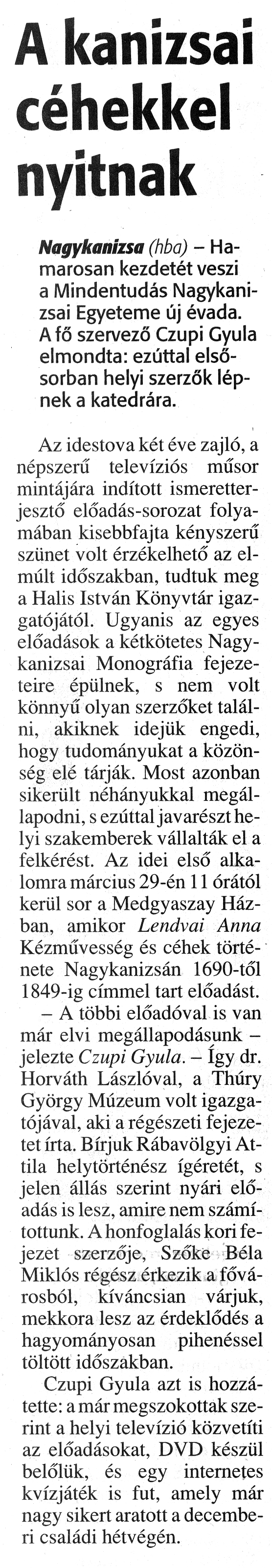 Nyilvános 932 | 1361 | Zalai Hírlap 2010. március 5. 54. szám 5. oldal - A kanizsai céhekkel nyitnak | A cikk szövege: A kanizsai céhekkel nyitnak Nagykanizsa (hba) - Hamarosan kezdetét veszi a Mindentudás Nagykanizsai Egyeteme új évada. A fő szervező Czupi Gyula elmondta: ezúttal elsősorban helyi szerzők lépnek a katedrára. Az idestova két éve zajló, a népszerű televíziós műsor mintájára indított ismeretterjesztő előadás-sorozat folyamában kisebbfajta kényszerű szünet volt érzékelhető az elmúlt időszakban, tudtuk meg a Halis István Könyvtár igazgatójától. Ugyanis az egyes előadások a kétkötetes Nagykanizsai Monográfia fejezeteire épülnek, s nem volt könnyű olyan szerzőket találni, akiknek idejük engedi, hogy tudományukat a közönség elé tárják. Most azonban sikerült néhányukkal megállapodni, s ezúttal javarészt helyi szakemberek vállalták el a felkérést. Az idei első alkalomra március 29-én 11 órától kerül sor a Medgyaszay Házban, amikor Lendvai Anna Kézművesség és céhek története Nagykanizsán 1690-től 1849-ig címmel tart előadást. - A többi előadóval is van már elvi megállapodásunk - jelezte Czupi Gyula. - Így dr. Horváth Lászlóval, a Thúry György Múzeum volt igazgatójával, aki a régészeti fejezetet írta. Bírjuk Rábavölgyi Attila helytörténész ígéretét, s jelen állás szerint nyári előadás is lesz, amire nem számítottunk. A honfoglalás kori fejezet szerzője, Szőke Béla Miklós régész érkezik a fővárosból, kíváncsian várjuk, mekkora lesz az érdeklődés a hagyományosan pihenéssel töltött időszakban. Czupi Gyula azt is hozzátette: a már megszokottak szerint a helyi televízió közvetíti az előadásokat, DVD készül belőlük, és egy internetes kvízjáték is fut, amely már nagy sikert aratott a decemberi családi hétvégén. |