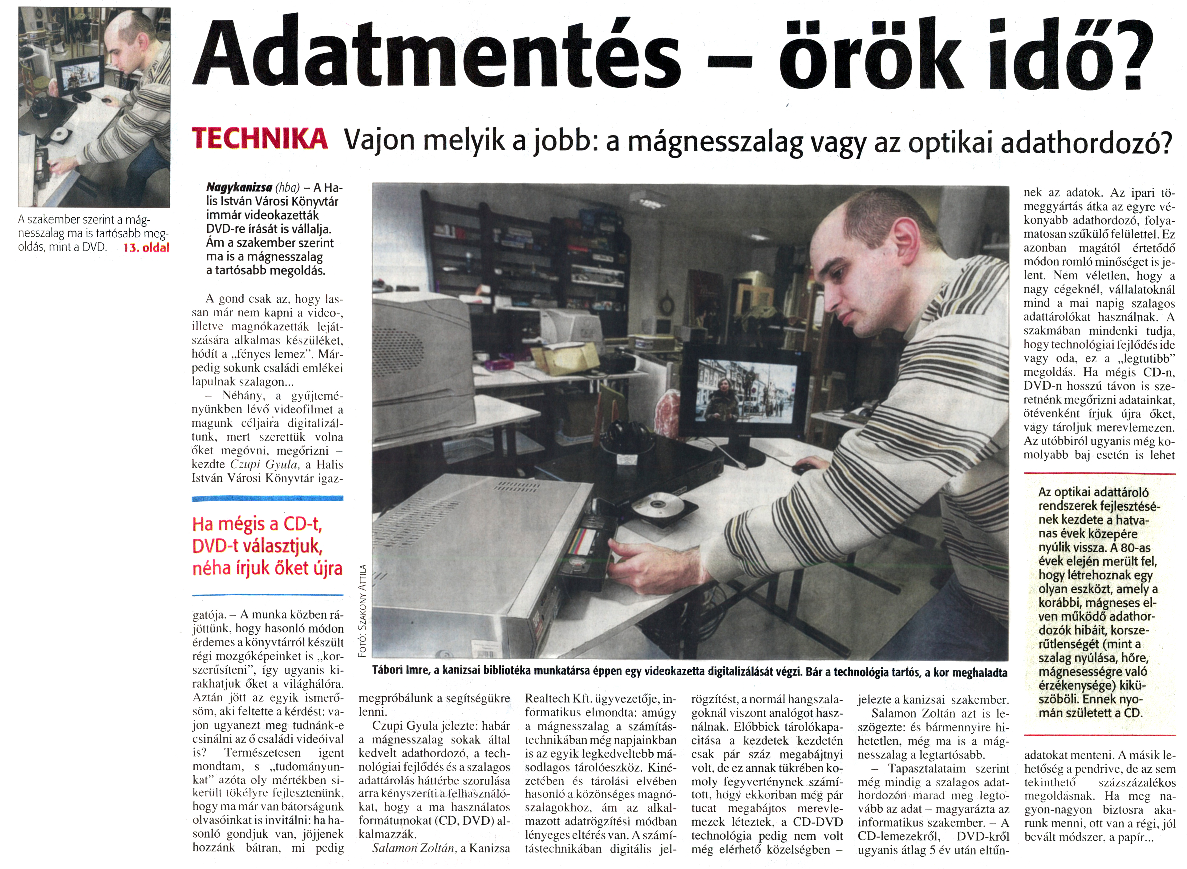 Nyilvános 923 | 1441 | Zalai Hírlap 2010. március 18. 64. szám 13. oldal - Adatmentés - örök idő | A cikk szövege: Adatmentés - örök idő? TECHNIKA Vajon melyik a jobb: a mágnesszalag vagy az optikai adathordozó? Tábori Imre, a kanizsai bibliotéka munkatársa éppen egy videokazetta digitalizálását végzi. Bár a technológia tartós, a kor meghaladta A szakember szerint a mágnesszalag ma is tartósabb megoldás, mint a DVD. 13. oldal Nagykanizsa (hba) - A Ha-lis István Városi Könyvtár immár videokazetták DVD-re írását is vállalja. Ám a szakember szerint ma is a mágnesszalag a tartósabb megoldás. A gond csak az, hogy lassan már nem kapni a videó-, illetve magnókazetták lejátszására alkalmas készüléket, hódít a „fényes lemez". Márpedig sokunk családi emlékei lapulnak szalagon... - Néhány, a gyűjteményünkben lévő videofilmet a magunk céljaira digitalizáltunk, mert szerettük volna őket megóvni, megőrizni -kezdte Czupi Gyula, a Halis István Városi Könyvtár igaz- Ha mégis a CD-t, DVD-t választjuk, néha írjuk őket újra gatója. - A munka közben rájöttünk, hogy hasonló módon érdemes a könyvtárról készült régi mozgóképeinket is „korszerűsíteni", így ugyanis kirakhatjuk őket a világhálóra. Aztán jött az egyik ismerősöm, aki feltette a kérdést: vajon ugyanezt meg tudnánk-e csinálni az ő családi videóival is? Természetesen igent mondtam, s „tudományunkat" azóta oly mértékben sikerült tökélyre fejlesztenünk, hogy ma már van bátorságunk olvasóinkat is invitálni: ha hasonló gondjuk van, jöjjenek hozzánk bátran, mi pedig megpróbálunk a segítségükre lenni. Czupi Gyula jelezte: habár a mágnesszalag sokak által kedvelt adathordozó, a technológiai fejlődés és a szalagos adattárolás háttérbe szorulása arra kényszeríti a felhasználókat, hogy a ma használatos formátumokat (CD. DVD) alkalmazzák. Salamon Zoltán, a Kanizsa Realtech Kft. ügyvezetője, informatikus elmondta: amúgy a mágnesszalag a számítástechnikában még napjainkban is az egyik legkedveltebb másodlagos tárolóeszköz. Kinézetében és tárolási elvében hasonló a közönséges magnószalagokhoz, ám az alkalmazott adatrögzítési módban lényeges eltérés van. A számítástechnikában digitális jel- rögzítést, a normál hangszalagoknál viszont analógot használnak. Előbbiek tárolókapacitása a kezdetek kezdetén csak pár száz megabájtnyi volt, de ez annak tükrében komoly fegyverténynek számított, hogy ekkoriban még pár tucat megabájtos merevlemezek léteztek, a CD-DVD technológia pedig nem volt még elérhető közelségben - jelezte a kanizsai szakember. Salamon Zoltán azt is leszögezte: és bármennyire hihetetlen, még ma is a mágnesszalag a legtartósabb. - Tapasztalataim szerint még mindig a szalagos adathordozón marad meg legtovább az adat - magyarázta az informatikus szakember. - A CD-lemezekről, DVD-kről ugyanis átlag 5 év után eltűn- nek az adatok. Az ipari tömeggyártás átka az egyre vékonyabb adathordozó, folyamatosan szűkülő felülettel. Ez azonban magától értetődő módon romló minőséget is jelent. Nem véletlen, hogy a nagy cégeknél, vállalatoknál mind a mai napig szalagos adattárolókat használnak. A szakmában mindenki tudja, hogy technológiai fejlődés ide vagy oda, ez a „legtutibb" megoldás. Ha mégis CD-n, DVD-n hosszú távon is szeretnénk megőrizni adatainkat, ötévenként írjuk újra őket, vagy tároljuk merevlemezen. Az utóbbiról ugyanis még komolyabb baj esetén is lehet Az optikai adattároló rendszerek fejlesztésének kezdete a hatvanas évek közepére nyúlik vissza. A 80-as évek elején merült fel, hogy létrehoznak egy olyan eszközt, amely a korábbi, mágneses elven működő adathordozók hibáit, korszerűtlenségét (mint a szalag nyúlása, hőre, mágnesességre való érzékenysége) kiküszöböli. Ennek nyomán született a CD. adatokat menteni. A másik lehetőség a pendrive, de az sem tekinthető százszázalékos megoldásnak. Ha meg nagyon-nagyon biztosra akarunk menni, ott van a régi, jól bevált módszer, a papír... |