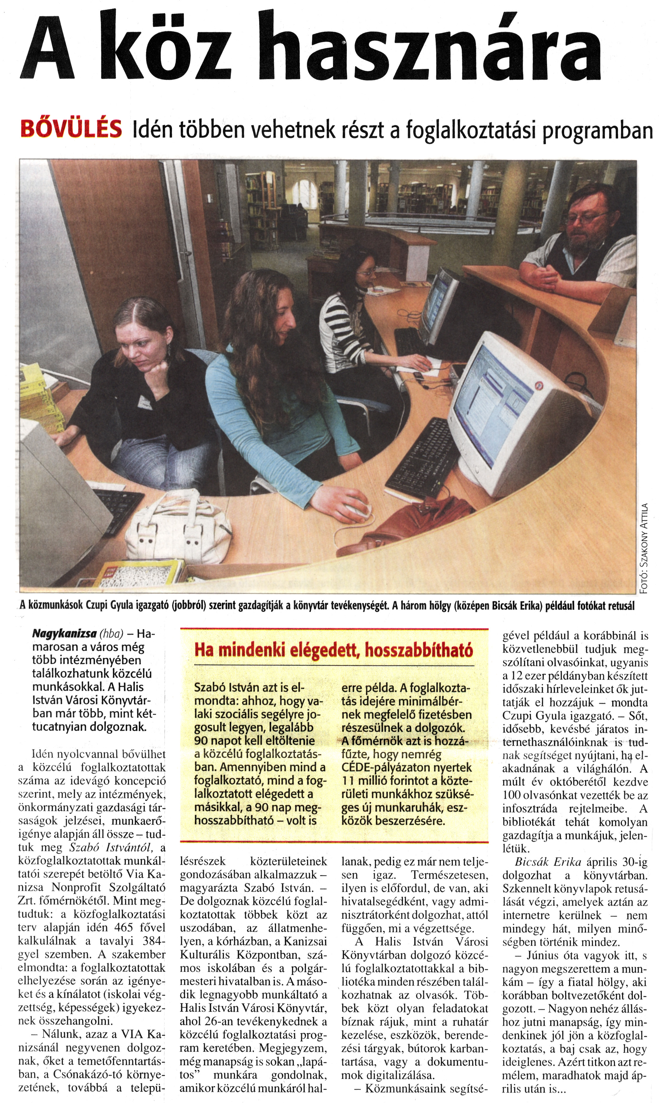 Nyilvános 910 | 1414 | Zalai Hírlap 2010. március 23. 68. szám 5. oldal - A köz hasznára | A cikk szövege: A köz hasznára BŐVÜLÉS Idén többen vehetnek részt a foglalkoztatási programban A közmunkások Czupi Gyula igazgató (jobbról) szerint gazdagítják a könyvtár tevékenységét. A három hölgy (középen Bicsak Erika) például fotókat retusál Ha mindenki elégedett, hosszabbítható Szabó István azt is elmondta: ahhoz, hogy valaki szociális segélyre jogosult legyen, legalább 90 napot kell eltöltenie a közcélú foglalkoztatásban. Amennyiben mind a foglalkoztató, mind a foglalkoztatott elégedett a másikkal, a 90 nap meghosszabbítható - volt is erre példa. A foglalkoztatás idejére minimálbérnek megfelelő fizetésben részesülnek a dolgozók. A főmérnök azt is hozzáfűzte, hogy nemrég CÉDE-pályázaton nyertek 11 millió forintot a közterületi munkákhoz szükséges új munkaruhák, eszközök beszerzésére. Nagykanizsa (hba) - Hamarosan a város még több intézményében találkozhatunk közcélú munkásokkal. A Halis István Városi Könyvtárban már több, mint két-tucatnyian dolgoznak. Idén nyolcvannal bővülhet a közcélú foglalkoztatottak száma az idevágó koncepció szerint, mely az intézmények, önkormányzati gazdasági társaságok jelzései, munkaerőigénye alapján áll össze - tudtuk meg Szabó Istvántól, a közfoglalkoztatottak munkáltatói szerepét betöltő Via Kanizsa Nonprofit Szolgáltató Zrt. főmérnökétől. Mint megtudtuk: a közfoglalkoztatási terv alapján idén 465 fővel kalkulálnak a tavalyi 384-gyel szemben. A szakember elmondta: a foglalkoztatottak elhelyezése során az igényeket és a kínálatot (iskolai végzettség, képességek) igyekeznek összehangolni. - Nálunk, azaz a VIA Kanizsánál negyvenen dolgoznak, őket a temetőfenntartásban, a Csónakázó-tó környezetének, továbbá a településrészek közterületeinek gondozásában alkalmazzuk -magyarázta Szabó István. — De dolgoznak közcélú foglalkoztatottak többek közt az uszodában, az állatmenhelyen, a kórházban, a Kanizsai Kulturális Központban, számos iskolában és a polgármesteri hivatalban is. A második legnagyobb munkáltató a Halis István Városi Könyvtár, ahol 26-án tevékenykednek a közcélú foglalkoztatási program keretében. Megjegyzem, még manapság is sokan „lapátos" munkára gondolnak, amikor közcélú munkáról hallanak, pedig ez már nem teljesen igaz. Természetesen, ilyen is előfordul, de van, aki hivatalsegédként, vagy adminisztrátorként dolgozhat, attól függően, mi a végzettsége. A Halis István Városi Könyvtárban dolgozó közcélú foglalkoztatottakkal a bibliotéka minden részében találkozhatnak az olvasók. Többek közt olyan feladatokat bíznak rájuk, mint a ruhatár kezelése, eszközök, berendezési tárgyak, bútorok karbantartása, vagy a dokumentumok digitalizálása. - Közmunkásaink segítségével például a korábbinál is közvetlenebbül tudjuk megszólítani olvasóinkat, ugyanis a 12 ezer példányban készített időszaki hírleveleinket ők juttatják el hozzájuk - mondta Czupi Gyula igazgató. - Sőt, idősebb, kevésbé járatos internethasználóinknak is tudnak segítséget nyújtani, ha elakadnának a világhálón. A múlt év októberétől kezdve 100 olvasónkat vezették be az infosztráda rejtelmeibe. A bibliotékát tehát komolyan gazdagítja a munkájuk, jelenlétük. Bicsak Erika április 30-ig dolgozhat a könyvtárban. Szkennelt könyvlapok retusálását végzi, amelyek aztán az internetre kerülnek - nem mindegy hát, milyen minőségben történik mindez. - Június óta vagyok itt, s nagyon megszerettem a munkám - így a fiatal hölgy, aki korábban boltvezetőként dolgozott. - Nagyon nehéz álláshoz jutni manapság, így mindenkinek jól jön a közfoglalkoztatás, a baj csak az, hogy ideiglenes. Azért titkon azt remélem, maradhatok majd április után is... |