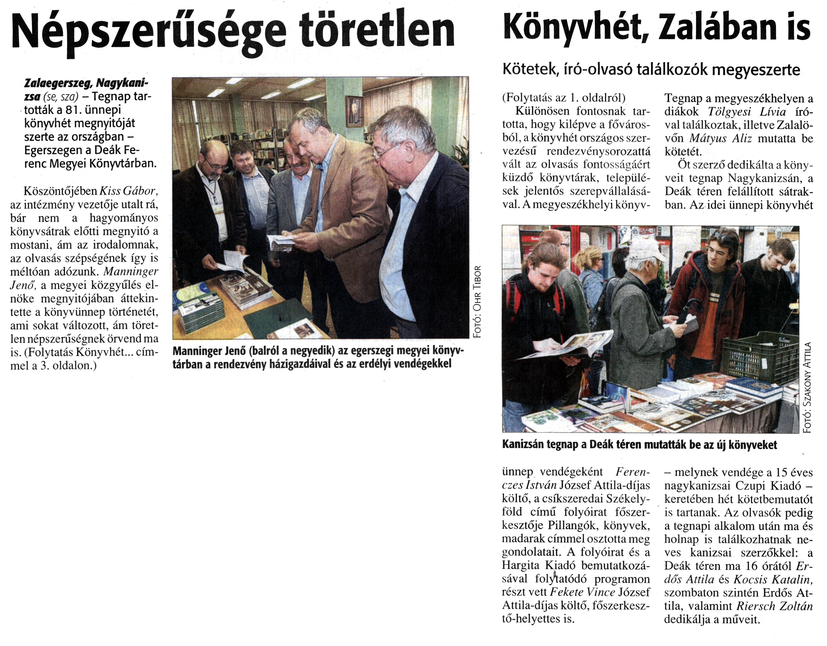 Nyilvános 926 | 1393 | Zalai Hírlap 2010. június 4. 128. szám 1, 3. oldal - Népszerűsége töretlen - Könyvhét, Zalában is | A cikk szövege: Népszerűsége töretlen Zalaegerszeg, Nagykanizsa (se, sza) - Tegnap tartották a 81. ünnepi könyvhét megnyitóját szerte az országban -Egerszegen a Deák Ferenc Megyei Könyvtárban. Köszöntőjében Kiss Gábor, az intézmény vezetője utalt rá, bár nem a hagyományos könyvsátrak előtti megnyitó a mostani, ám az irodalomnak, az olvasás szépségének így is méltóan adózunk. Manninger Jenő, a megyei közgyűlés elnöke megnyitójában áttekintette a könyvünnep történetét, ami sokat változott, ám töretlen népszerűségnek örvend ma is. (Folytatás Könyvhét... címmel a 3. oldalon.) Manninger Jenő (balról a negyedik) az egerszegi megyei könyvtárban a rendezvény házigazdáival és az erdélyi vendégekkel Könyvhét, Zalában is Kötetek, író-olvasó találkozók megyeszerte (Folytatás az 1. oldalról) Különösen fontosnak tartotta, hogy kilépve a fővárosból, a könyvhét országos szervezésű rendezvénysorozattá vált az olvasás fontosságáért küzdő könyvtárak, települések jelentős szerepvállalásával. A megyeszékhelyi könyv- ünnep vendégeként Ferenczes István József Attila-díjas költő, a csíkszeredai Székelyföld című folyóirat főszerkesztője Pillangók, könyvek, madarak címmel osztotta meg gondolatait. A folyóirat és a Hargita Kiadó bemutatkozásával folytatódó programon részt vett Fekete Vince József Attila-díjas költő, főszerkesztő-helyettes is. Tegnap a megyeszékhelyen a diákok Tölgyesi Lívia íróval találkoztak, illetve Zalalövőn Mátyus Aliz mutatta be kötetét. Öt szerző dedikálta a könyveit tegnap Nagykanizsán, a Deák téren felállított sátrakban. Az idei ünnepi könyvhét — melynek vendége a 15 éves nagykanizsai Czupi Kiadó -keretében hét kötetbemutatót is tartanak. Az olvasók pedig a tegnapi alkalom után ma és holnap is találkozhatnak neves kanizsai szerzőkkel: a Deák téren ma 16 órától Erdős Attila és Kocsis Katalin, szombaton szintén Erdős Attila, valamint Riersch Zoltán dedikálja a műveit. Kanizsán tegnap a Deák téren mutatták be az új könyveket |