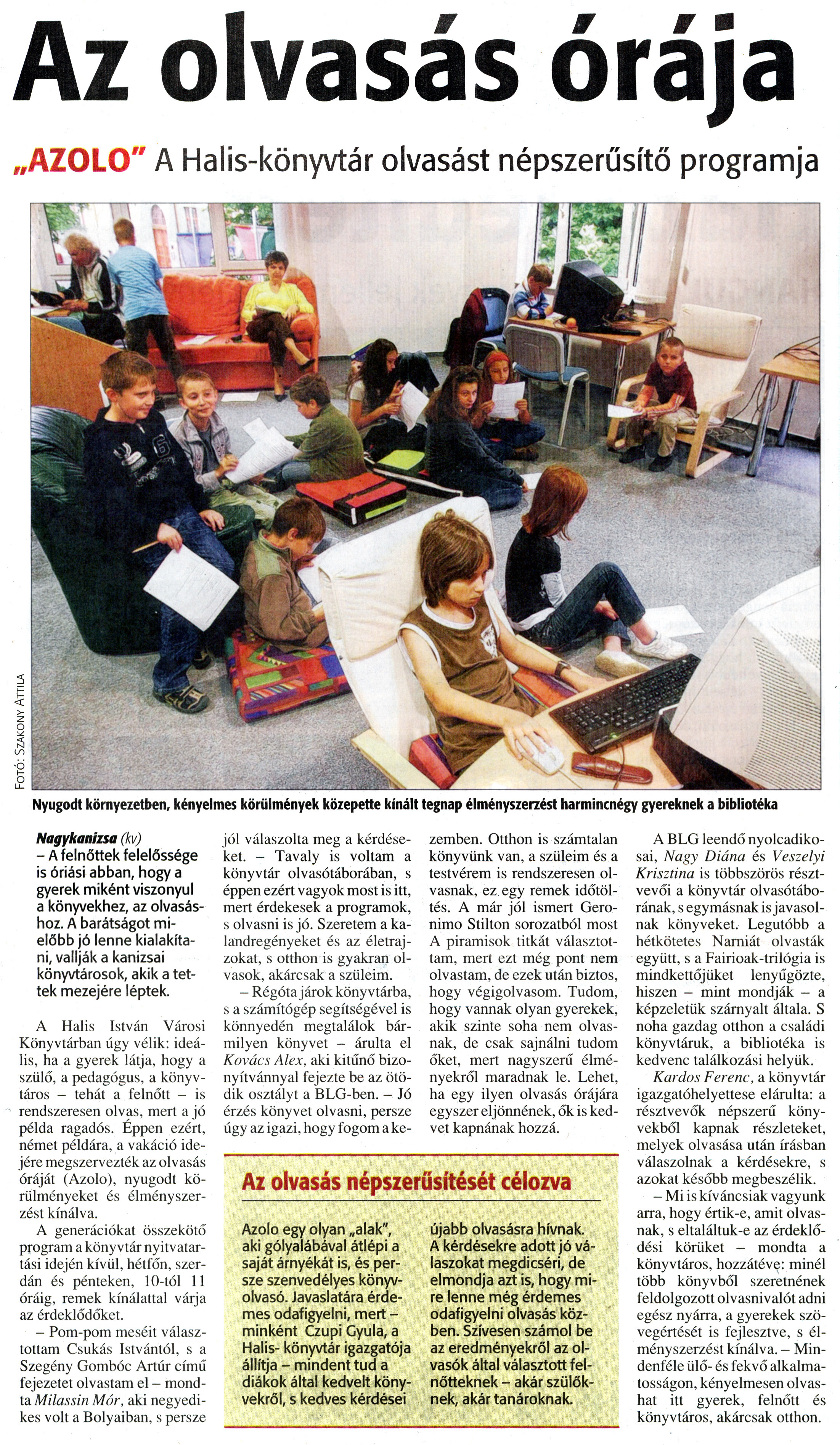 Nyilvános 1176 | 1887 | Zalai Hírlap 2010. június 22. 143. szám 11. oldal - Az olvasás órája | A cikk szövege: Az olvasás órája „AZOLO" A Halis-könyvtár olvasást népszerűsítő programja Nyugodt környezetben, kényelmes körülmények közepette kínált tegnap élményszerzést harmincnégy gyereknek a bibliotéka Nagykanizsa (kv) - A felnőttek felelőssége is óriási abban, hogy a gyerek miként viszonyul a könyvekhez, az olvasáshoz. A barátságot mielőbb jó lenne kialakítani, vallják a kanizsai könyvtárosok, akik a tettek mezejére léptek. A Halis István Városi Könyvtárban úgy vélik: ideális, ha a gyerek látja, hogy a szülő, a pedagógus, a könyvtáros - tehát a felnőtt - is rendszeresen olvas, mert a jó példa ragadós. Éppen ezért, német példára, a vakáció idejére megszervezték az olvasás óráját (Azolo), nyugodt körülményeket és élményszerzést kínálva. A generációkat összekötő program a könyvtár nyitvatartási idején kívül, hétfőn, szerdán és pénteken, 10-tól 11 óráig, remek kínálattal várja az érdeklődőket. - Pom-pom meséit választottam Csukás Istvántól, s a Szegény Gombóc Artúr című fejezetet olvastam el - mondta Milassin Mór, aki negyedikes volt a Bolyaiban, s persze jól válaszolta meg a kérdéseket. - Tavaly is voltam a könyvtár olvasótáborában, s éppen ezért vagyok most is itt, mert érdekesek a programok, s olvasni is jó. Szeretem a kalandregényeket és az életrajzokat, s otthon is gyakran olvasok, akárcsak a szüleim. - Régóta járok könyvtárba, s a számítógép segítségével is könnyedén megtalálok bármilyen könyvet - árulta el Kovács Alex, aki kitűnő bizonyítvánnyal fejezte be az ötödik osztályt a BLG-ben. - Jó érzés könyvet olvasni, persze úgy az igazi, hogy fogom a kezemben. Otthon is számtalan könyvünk van, a szüleim és a testvérem is rendszeresen olvasnak, ez egy remek időtöltés. A már jól ismert Geronimo Stilton sorozatból most A piramisok titkát választottam, mert ezt még pont nem olvastam, de ezek után biztos, hogy végigolvasom. Tudom, hogy vannak olyan gyerekek, akik szinte soha nem olvasnak, de csak sajnálni tudom őket, mert nagyszerű élményekről maradnak le. Lehet, ha egy ilyen olvasás órájára egyszer eljönnének, ők is kedvet kapnának hozzá. A BLG leendő nyolcadikosai, Nagy Diána és Veszelyi Krisztina is többszörös résztvevői a könyvtár olvasótáborának, s egymásnak is javasolnak könyveket. Legutóbb a hétkötetes Narniát olvasták együtt, s a Fairioak-trilógia is mindkettőjüket lenyűgözte, hiszen - mint mondják - a képzeletük szárnyalt általa. S noha gazdag otthon a családi könyvtáruk, a bibliotéka is kedvenc találkozási helyük. Kardos Ferenc, a könyvtár igazgatóhelyettese elárulta: a résztvevők népszerű könyvekből kapnak részleteket, melyek olvasása után írásban válaszolnak a kérdésekre, s azokat később megbeszélik. - Mi is kíváncsiak vagyunk arra, hogy értik-e, amit olvasnak, s eltaláltuk-e az érdeklődési körüket - mondta a könyvtáros, hozzátéve: minél több könyvből szeretnének feldolgozott olvasnivalót adni egész nyárra, a gyerekek szövegértését is fejlesztve, s élményszerzést kínálva. - Mindenféle ülő- és fekvő alkalmatosságon, kényelmesen olvashat itt gyerek, felnőtt és könyvtáros, akárcsak otthon. Az olvasás népszerűsítését célozva Azolo egy olyan „alak", aki gólyalábával átlépi a saját árnyékát is, és persze szenvedélyes könyvolvasó. Javaslatára érdemes odafigyelni, mert -minként Czupi Gyula, a Halis- könyvtár igazgatója állítja - mindent tud a diákok által kedvelt könyvekről, s kedves kérdései újabb olvasásra hívnak. A kérdésekre adott jó válaszokat megdicséri, de elmondja azt is, hogy mire lenne még érdemes odafigyelni olvasás közben. Szívesen számol be az eredményekről az olvasók által választott felnőtteknek - akár szülőknek, akár tanároknak. |