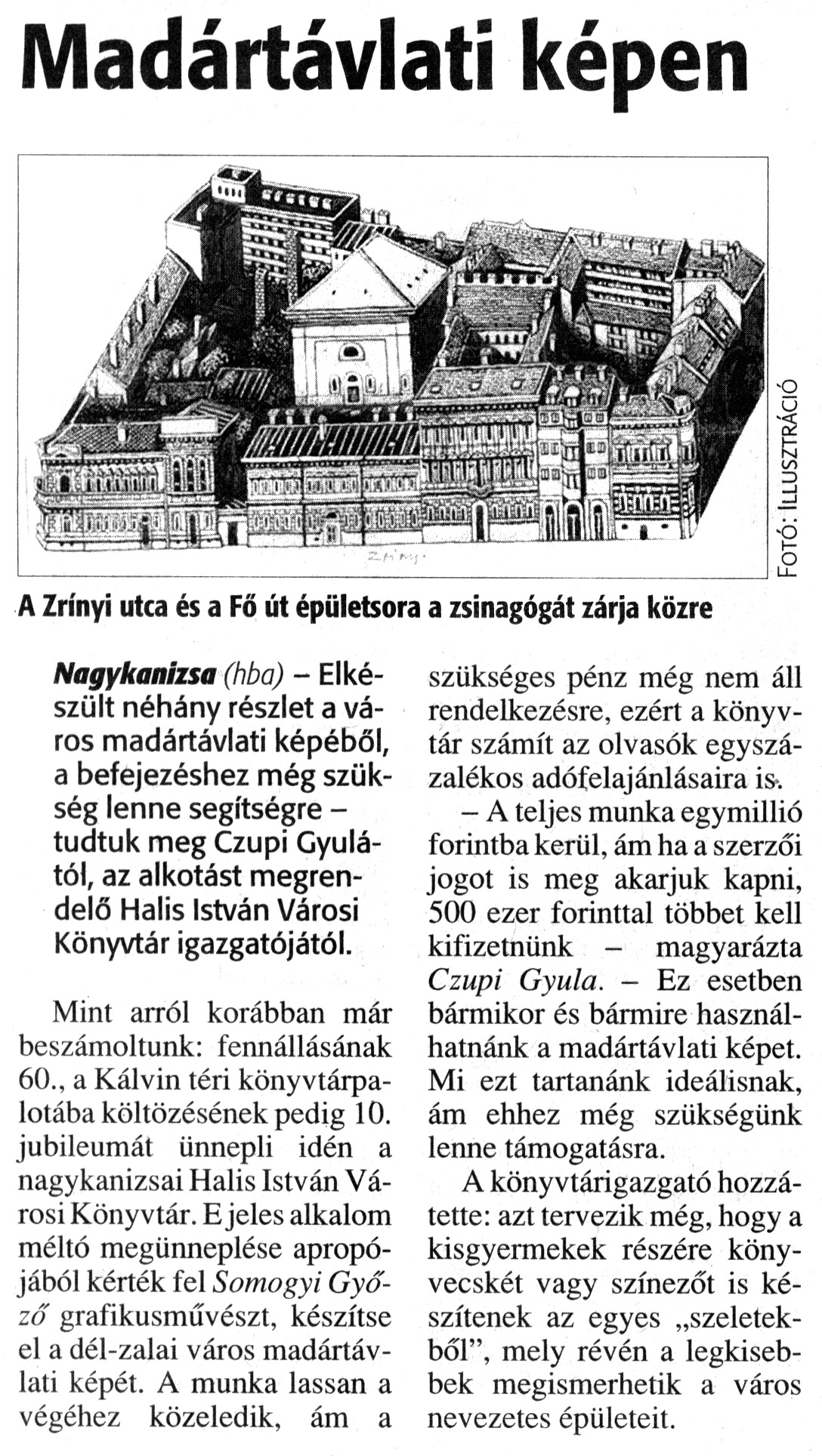 Nyilvános 1644 | 4939 | Zalai Hírlap 2011. február 16. 39. szám 7. oldal - Madártávlati képen | A cikk szövege: Madártávlati képen A Zrínyi utca és a Fő út épületsora a zsinagógát zárja közre Nagykanizsa (hba) - Elkészült néhány részlet a város madártávlati képéből, a befejezéshez még szükség lenne segítségre -tudtuk meg Czupi Gyulától, az alkotást megrendelő Halis István Városi Könyvtár igazgatójától. Mint arról korábban már beszámoltunk: fennállásának 60., a Kálvin téri könyvtárpalotába költözésének pedig 10. jubileumát ünnepli idén a nagykanizsai Halis István Városi Könyvtár. E jeles alkalom méltó megünneplése apropójából kérték fel Somogyi Győző grafikusművészt, készítse el a dél-zalai város madártávlati képét. A munka lassan a végéhez közeledik, ám a szükséges pénz még nem áll rendelkezésre, ezért a könyvtár számít az olvasók egyszázalékos adófelajánlásaira is. - A teljes munka egymillió forintba kerül, ám ha a szerzői jogot is meg akarjuk kapni, 500 ezer forinttal többet kell kifizetnünk - magyarázta Czupi Gyula. - Ez esetben bármikor és bármire használhatnánk a madártávlati képet. Mi ezt tartanánk ideálisnak, ám ehhez még szükségünk lenne támogatásra. A könyvtárigazgató hozzátette: azt tervezik még, hogy a kisgyermekek részére könyvecskét vagy színezőt is készítenek az egyes „szeletekből", mely révén a legkisebbek megismerhetik a város nevezetes épületeit. Fotó: Illusztráció |