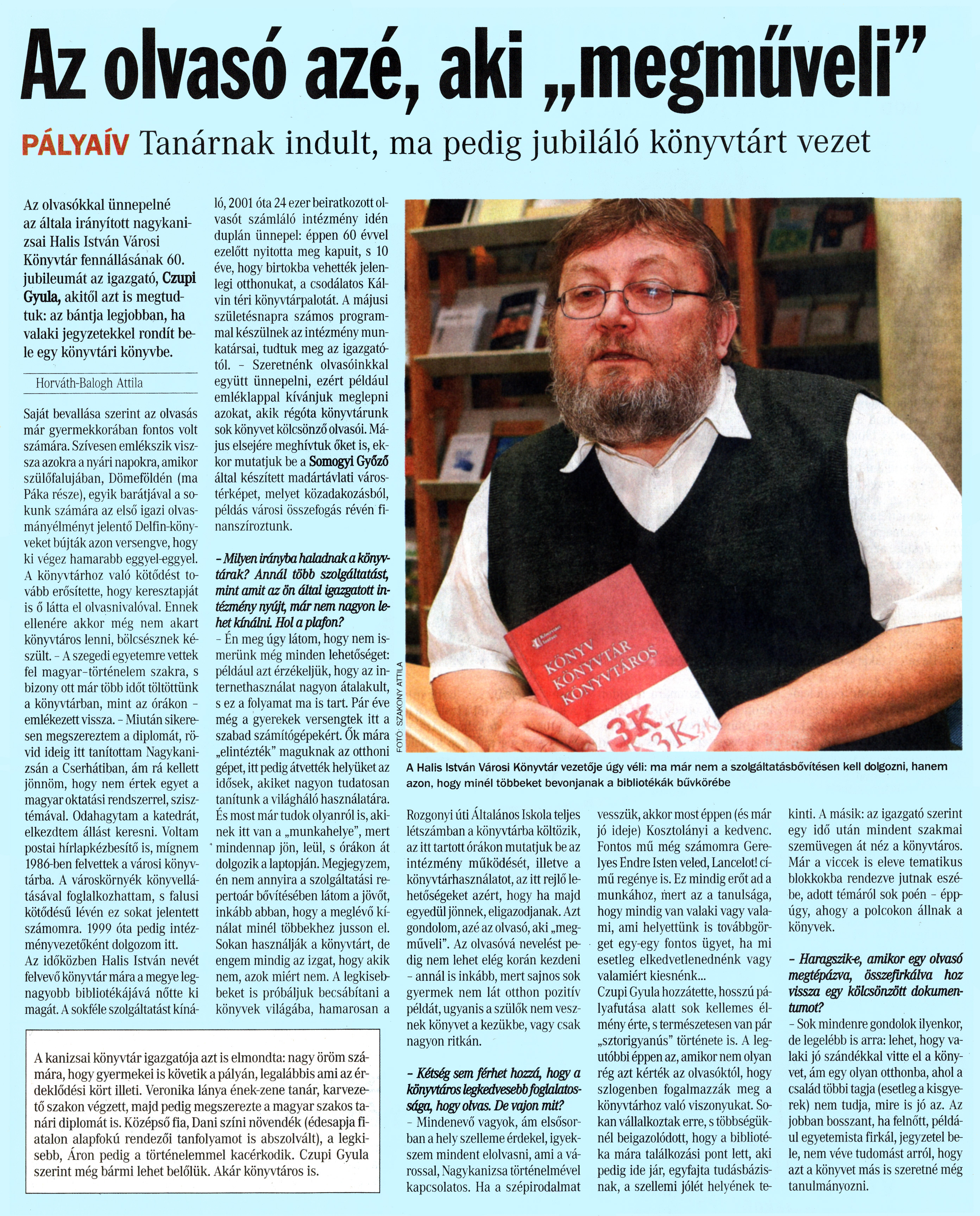 Nyilvános 1739 | 5884 | Vasárnapi Zalai Hírlap 2011. április 10. 15. szám 5. oldal - Az olvasó azé, aki megműveli | A cikk szövege: Az olvasó azé, aki „megműveli" PÁLYAÍV Tanárnak indult, ma pedig jubiláló könyvtárt vezet Az olvasókkal ünnepelné az általa irányított nagykanizsai Halis István Városi Könyvtár fennállásának 60. jubileumát az igazgató, Czupi Gyula, akitől azt is megtudtuk: az bántja legjobban, ha valaki jegyzetekkel rondít bele egy könyvtári könyvbe. Horváth-Balogh Attila Saját bevallása szerint az olvasás már gyermekkorában fontos volt számára. Szívesen emlékszik vissza azokra a nyári napokra, amikor szülőfalujában, Dömeföldén (ma Páka része), egyik barátjával a sokunk számára az első igazi olvasmányélményt jelentő Delfin-könyveket bújták azon versengve, hogy ki végez hamarabb eggyel-eggyel. A könyvtárhoz való kötődést tovább erősítette, hogy keresztapját is ő látta el olvasnivalóval. Ennek ellenére akkor még nem akart könyvtáros lenni, bölcsésznek készült. - A szegedi egyetemre vettek fel magyar-történelem szakra, s bizony ott már több időt töltöttünk a könyvtárban, mint az órákon -emlékezett vissza. - Miután sikeresen megszereztem a diplomát, rövid ideig itt tanítottam Nagykanizsán a Cserhátiban, ám rá kellett jönnöm, hogy nem értek egyet a magyar oktatási rendszerrel, szisztémával. Odahagytam a katedrát, elkezdtem állást keresni. Voltam postai hírlapkézbesítő is, mígnem 1986-ben felvettek a városi könyvtárba. A városkörnyék könyvellátásával foglalkozhattam, s falusi kötődésű lévén ez sokat jelentett számomra. 1999 óta pedig intézményvezetőként dolgozom itt. Az időközben Halis István nevét felvevő könyvtár mára a megye legnagyobb bibliotékájává nőtte ki magát. A sokféle szolgáltatást kínáló, 2001 óta 24 ezer beiratkozott olvasót számláló intézmény idén duplán ünnepel: éppen 60 évvel ezelőtt nyitotta meg kapuit, s 10 éve, hogy birtokba vehették jelenlegi otthonukat, a csodálatos Kálvin téri könyvtárpalotát. A májusi születésnapra számos programmal készülnek az intézmény munkatársai, tudtuk meg az igazgatótól. - Szeretnénk olvasóinkkal együtt ünnepelni, ezért például emléklappal kívánjuk meglepni azokat, akik régóta könyvtárunk sok könyvet kölcsönző olvasói. Május elsejére meghívtuk őket is, ekkor mutatjuk be a Somogyi Győző által készített madártávlati várostérképet, melyet közadakozásból, példás városi összefogás révén finanszíroztunk. - Milyen irányba haladnak a könyvtárak? Annál több szolgáltatást, mint amit az ön által igazgatott intézmény nyújt, már nem nagyon lehet kínálni Hol a plafon? - Én meg úgy látom, hogy nem ismerünk még minden lehetőséget: például azt érzékeljük, hogy az internethasználat nagyon átalakult, s ez a folyamat ma is tart. Pár éve még a gyerekek versengtek itt a szabad számítógépekért. Ők mára „elintézték" maguknak az otthoni gépet, itt pedig átvették helyüket az idősek, akiket nagyon tudatosan tanítunk a világháló használatára. És most már tudok olyanról is, akinek itt van a „munkahelye", mert mindennap jön, leül, s órákon át dolgozik a laptopján. Megjegyzem, én nem annyira a szolgáltatási repertoár bővítésében látom a jövőt, inkább abban, hogy a meglévő kínálat minél többekhez jusson el. Sokan használják a könyvtárt, de engem mindig az izgat, hogy akik nem, azok miért nem. A legkisebbeket is próbáljuk becsábítani a könyvek világába, hamarosan a Rozgonyi úti Általános Iskola teljes létszámban a könyvtárba költözik, az itt tartott órákon mutatjuk be az intézmény működését, illetve a könyvtárhasználatot, az itt rejlő lehetőségeket azért, hogy ha majd egyedül jönnek, eligazodjanak. Azt gondolom, azé az olvasó, aki „megműveli". Az olvasóvá nevelést pedig nem lehet elég korán kezdeni - annál is inkább, mert sajnos sok gyermek nem lát otthon pozitív példát, ugyanis a szülők nem vesznek könyvet a kezükbe, vagy csak nagyon ritkán. - Kétség sem férhet hozzá, hogy a könyvtáros legkedvesebb foglalatossága, hogy olvas. De vajon mit? - Mindenevő vagyok, ám elsősorban a hely szelleme érdekel, igyekszem mindent elolvasni, ami a várossal, Nagykanizsa történelmével kapcsolatos. Ha a szépirodalmat vesszük, akkor most éppen (és már jó ideje) Kosztolányi a kedvenc. Fontos mű még számomra Gerelyes Endre Isten veled, Lancelot! című regénye is. Ez mindig erőt ad a munkához, mert az a tanulsága, hogy mindig van valaki vagy valami, ami helyettünk is továbbgörget egy-egy fontos ügyet, ha mi esetleg elkedvetlenednénk vagy valamiért kiesnénk... Czupi Gyula hozzátette, hosszú pályafutása alatt sok kellemes élmény érte, s természetesen van pár „sztorigyanús" története is. A legutóbbi éppen az, amikor nem olyan rég azt kérték az olvasóktól, hogy szlogenben fogalmazzák meg a könyvtárhoz való viszonyukat. Sokan vállalkoztak erre, s többségüknél beigazolódott, hogy a bibliotéka mára találkozási pont lett, aki pedig ide jár, egyfajta tudásbázisnak, a szellemi jólét helyének te- kinti. A másik: az igazgató szerint egy idő után mindent szakmai szemüvegen át néz a könyvtáros. Már a viccek is eleve tematikus blokkokba rendezve jutnak eszébe, adott témáról sok poén - éppúgy, ahogy a polcokon állnak a könyvek. - Haragszik-e, amikor egy olvasó megtépázva, összefirkálva hoz vissza egy kölcsönzött dokumentumot? - Sok mindenre gondolok ilyenkor, de legelébb is arra: lehet, hogy valaki jó szándékkal vitte el a könyvet, ám egy olyan otthonba, ahol a család többi tagja (esetleg a kisgyerek) nem tudja, mire is jó az. Az jobban bosszant, ha felnőtt, például egyetemista firkál, jegyzetel bele, nem 