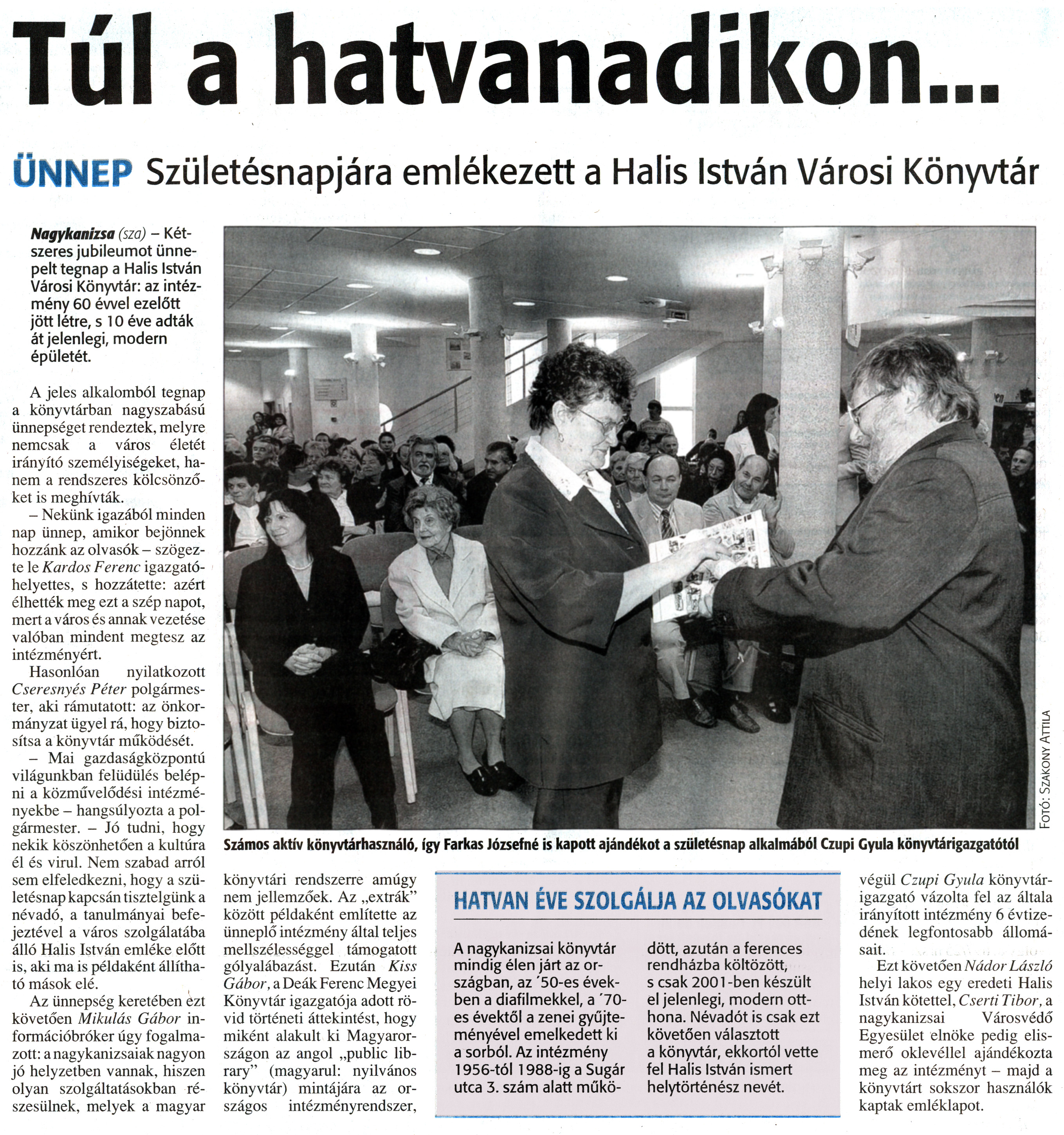 Nyilvános 1683 | 4594 | Zalai Hírlap 2011. május 2. 101. szám 16. oldal - Túl a hatvanadikon | A cikk szövege: Túl a hatvanadikon... ÜNNEP Születésnapjára emlékezett a Halis István Városi Könyvtár Nagykanizsa (sza) - Kétszeres jubileumot ünnepelt tegnap a Halis István Városi Könyvtár: az intézmény 60 évvel ezelőtt jött létre, s 10 éve adták át jelenlegi, modern épületét. A jeles alkalomból tegnap a könyvtárban nagyszabású ünnepséget rendeztek, melyre nemcsak a város életét irányító személyiségeket, hanem a rendszeres kölcsönzőket is meghívták. - Nekünk igazából minden nap ünnep, amikor bejönnek hozzánk az olvasók - szögezte le Kardos Ferenc igazgatóhelyettes, s hozzátette: azért élhették meg ezt a szép napot, mert a város és annak vezetése valóban mindent megtesz az intézményért. Hasonlóan nyilatkozott Cseresnyés Péter polgármester, aki rámutatott: az önkormányzat ügyel rá, hogy biztosítsa a könyvtár működését. - Mai gazdaságközpontú világunkban felüdülés belépni a közművelődési intézményekbe - hangsúlyozta a polgármester. - Jó tudni, hogy nekik köszönhetően a kultúra él és virul. Nem szabad arról sem elfeledkezni, hogy a születésnap kapcsán tisztelgünk a névadó, a tanulmányai befejeztével a város szolgálatába álló Halis István emléke előtt is, aki ma is példaként állítható mások elé. Az ünnepség keretében ezt követően Mikulás Gábor információbróker úgy fogalmazott: a nagykanizsaiak nagyon jó helyzetben vannak, hiszen olyan szolgáltatásokban részesülnek, melyek a magyar könyvtári rendszerre amúgy nem jellemzőek. Az „extrák" között példaként említette az ünneplő intézmény által teljes mellszélességgel támogatott gólyalábazást. Ezután Kiss Gábor, a Deák Ferenc Megyei Könyvtár igazgatója adott rövid történeti áttekintést, hogy miként alakult ki Magyarországon az angol „public library" (magyarul: nyilvános könyvtár) mintájára az országos intézményrendszer, végül Czupi Gyula könyvtárigazgató vázolta fel az általa irányított intézmény 6 évtizedének legfontosabb állomásait. Ezt követően Nádor László helyi lakos egy eredeti Halis István kötettel, Cserti Tibor, a nagykanizsai Városvédő Egyesület elnöke pedig elismerő oklevéllel ajándékozta meg az intézményt - majd a könyvtárt sokszor használók kaptak emléklapot. Számos aktív könyvtárhasználó, így Farkas Józsefné is kapott ajándékot a születésnap alkalmából Czupi Gyula könyvtárigazgatótól HATVAN ÉVE SZOLGÁLJA AZ OLVASÓKAT A nagykanizsai könyvtár mindig élen járt az országban, az \'50-es években a diafilmekkel, a \'70-es évektől a zenei gyűjteményével emelkedett ki a sorból. Az intézmény 1956-tól 1988-ig a Sugár utca 3. szám alatt működött, azután a ferences rendházba költözött, s csak 2001-ben készült el jelenlegi, modern otthona. Névadót is csak ezt követően választott a könyvtár, ekkortól vette fel Halis István ismert helytörténész nevét. |
