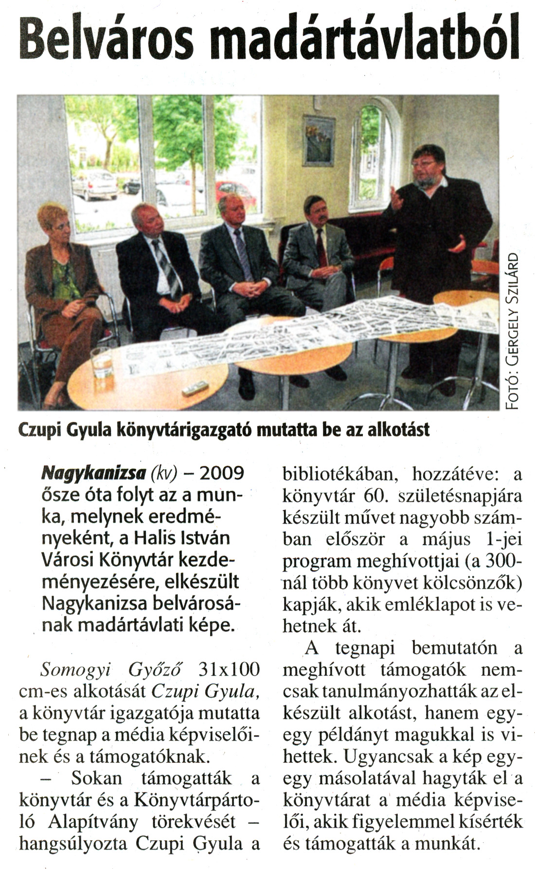 Nyilvános 1627 | 4609 | Zalai Hírlap 2011. április 27. 97. szám 4. oldal - Belváros madártávlatból | A cikk szövege: Belváros madártávlatból Czupi Gyula könyvtárigazgató mutatta be az alkotást Nagykanizsa (kv) - 2009 ősze óta folyt az a munka, melynek eredményeként, a Halis István Városi Könyvtár kezdeményezésére, elkészült Nagykanizsa belvárosának madártávlati képe. Somogyi Győző 31x100 cm-es alkotását Czupi Gyula, a könyvtár igazgatója mutatta be tegnap a média képviselőinek és a támogatóknak. - Sokan támogatták a könyvtár és a Könyvtárpártoló Alapítvány törekvését - hangsúlyozta Czupi Gyula a bibliotékában, hozzátéve: a könyvtár 60. születésnapjára készült művet nagyobb számban először a május 1-jei program meghívottjai (a 300-nál több könyvet kölcsönzők) kapják, akik emléklapot is vehetnek át. A tegnapi bemutatón a meghívott támogatók nemcsak tanulmányozhatták az elkészült alkotást, hanem egy-egy példányt magukkal is vihettek. Ugyancsak a kép egy-egy másolatával hagyták el a könyvtárat a média képviselői, akik figyelemmel kísérték és támogatták a munkát. Fotó: Gergely Szilárd |