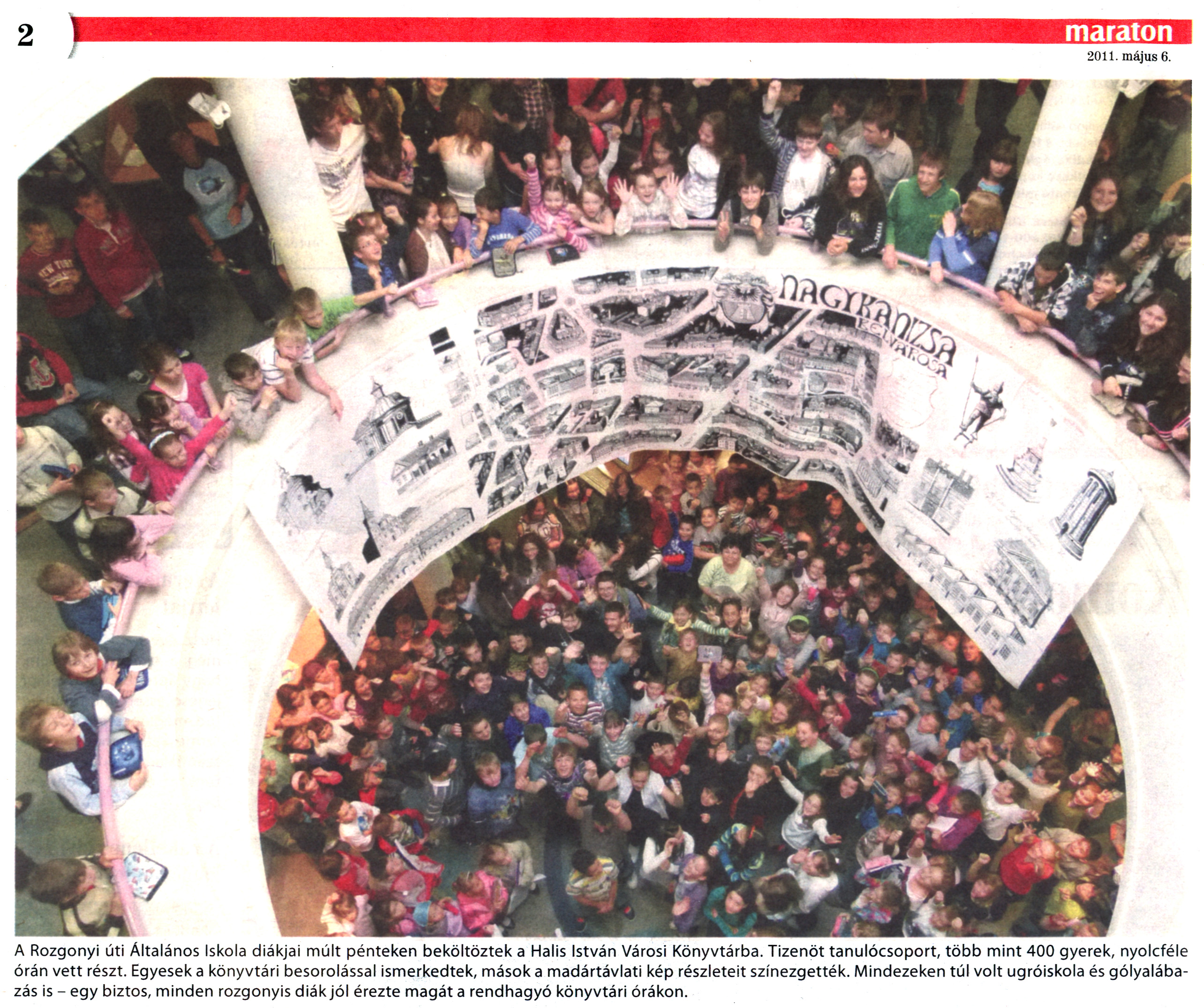 Nyilvános 1935 | 7422 | Nagykanizsai Maraton 2011. május 6. 18. szám 2. oldal - Rozgonyi úti Általános Iskola | A cikk szövege: A Rozgonyi úti Általános Iskola diákjai múlt pénteken beköltöztek a Halis István Városi Könyvtárba. Tizenöt tanulócsoport, több mint 400 gyerek, nyolcféle órán vett részt. Egyesek a könyvtári besorolással ismerkedtek, mások a madártávlati kép részleteit színezgették. Mindezeken túl volt ugróiskola és gólyalábazás is - egy biztos, minden rozgonyis diák jól érezte magát a rendhagyó könyvtári órákon. |