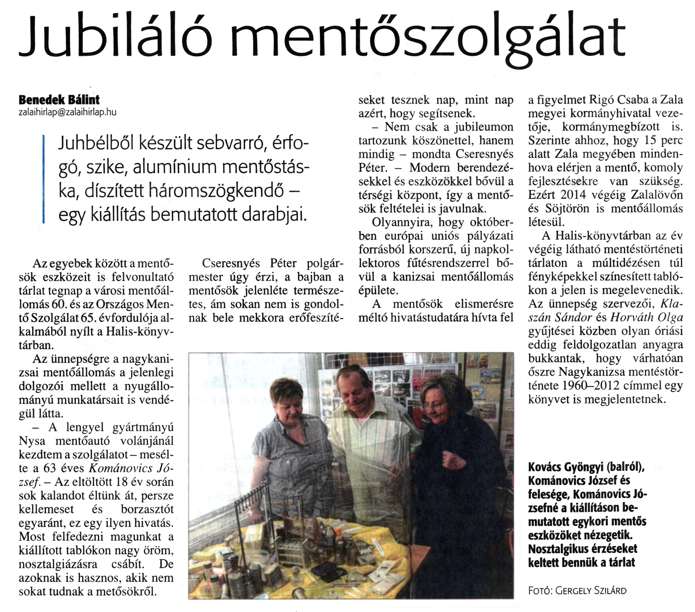 Nyilvános 1346 | 3110 | Zalai Hírlap 2013. május 11. 109. szám 10. oldal - Jubiláló mentőszolgálat | Jubiláló mentőszolgálat Benedek Bálint zalaihirlap@zalaihirlap.hu Juhbélből készült sebvarró, érfogó, szike, alumínium mentőstáska, díszített háromszögkendő -egy kiállítás bemutatott darabjai. Az egyebek között a mentősök eszközeit is felvonultató tárlat tegnap a városi mentőállomás 60. és az Országos Mentő Szolgálat 65. évfordulója alkalmából nyílt a Halis-könyvtárban. Az ünnepségre a nagykanizsai mentőállomás a jelenlegi dolgozói mellett a nyugállományú munkatársait is vendégül látta. - A lengyel gyártmányú Nysa mentőautó volánjánál kezdtem a szolgálatot - mesélte a 63 éves Kománovics József. - Az eltöltött 18 év során sok kalandot éltünk át, persze kellemeset és borzasztót egyaránt, ez egy ilyen hivatás. Most felfedezni magunkat a kiállított tablókon nagy öröm, nosztalgiázásra csábít. De azoknak is hasznos, akik nem sokat tudnak a metősökről. Cseresnyés Péter polgármester úgy érzi, a bajban a mentősök jelenléte természetes, ám sokan nem is gondolnak bele mekkora erőfeszítéseket tesznek nap, mint nap azért, hogy segítsenek. - Nem csak a jubileumon tartozunk köszönettel, hanem mindig - mondta Cseresnyés Péter. - Modern berendezésekkel és eszközökkel bővül a térségi központ, így a mentősök feltételei is javulnak. Olyannyira, hogy októberben európai uniós pályázati forrásból korszerű, új napkollektoros fűtésrendszerrel bővül a kanizsai mentőállomás épülete. A mentősök elismerésre méltó hivatástudatára hívta fel a figyelmet Rigó Csaba a Zala megyei kormányhivatal vezetője, kormánymegbízott is. Szerinte ahhoz, hogy 15 perc alatt Zala megyében mindenhova elérjen a mentő, komoly fejlesztésekre van szükség. Ezért 2014 végéig Zalalövőn és Söjtörön is mentőállomás létesül. A Halis-könyvtárban az év végéig látható mentéstörténeti tárlaton a múltidézésen túl fényképekkel színesített tablókon a jelen is megelevenedik. Az ünnepség szervezői, Klaszán Sándor és Horváth Olga gyűjtései közben olyan óriási eddig feldolgozatlan anyagra bukkantak, hogy várhatóan őszre Nagykanizsa mentéstörténete 1960-2012 címmel egy könyvet is megjelentetnek. Kovács Gyöngyi (balról), Kománovics József és felesége, Kománovics Józsefné a kiállításon bemutatott egykori mentős eszközöket nézegetik. Nosztalgikus érzéseket keltett bennük a tárlat Fotó: Gergely Szilárd |