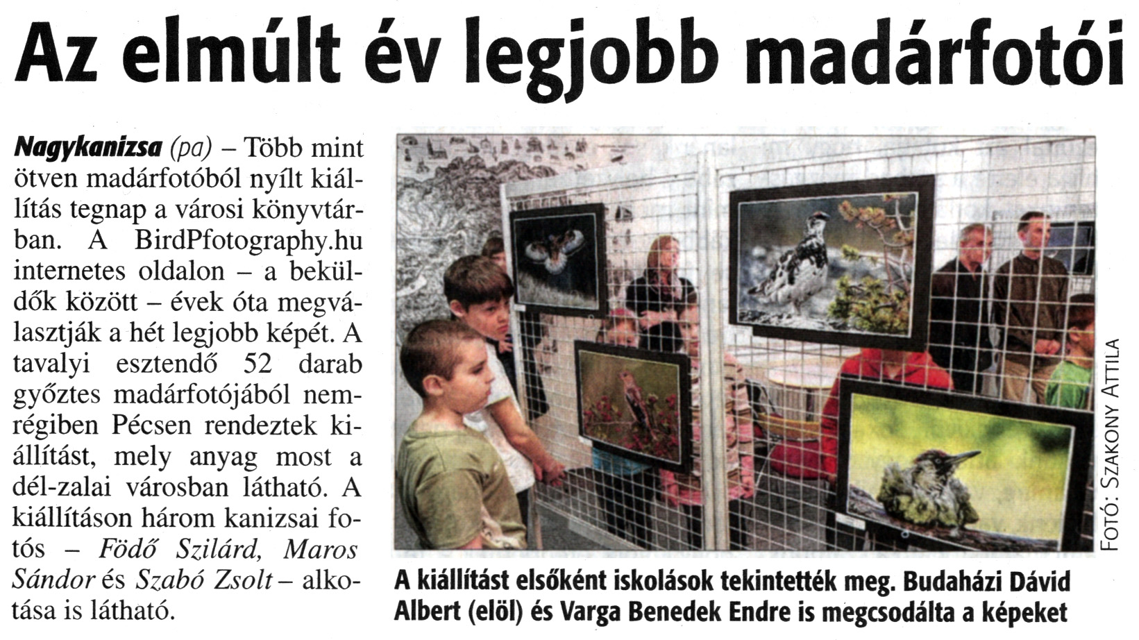 Nyilvános 1239 | 2775 | Zalai Hírlap 2015. március 10. 58. szám 3. oldal - Az elmúlt év legjobb madárfotói | Az elmúlt év legjobb madárfotói Nagykanizsa (pa) - Több mint ötven madárfotóból nyílt kiállítás tegnap a városi könyvtárban. A BirdPfotography.hu internetes oldalon - a beküldők között - évek óta megválasztják a hét legjobb képét. A tavalyi esztendő 52 darab győztes madárfotójából nemrégiben Pécsen rendeztek kiállítást, mely anyag most a dél-zalai városban látható. A kiállításon három kanizsai fotós - Födő Szilárd, Maros Sándor és Szabó Zsolt - alkotása is látható. A kiállítást elsőként iskolások tekintették meg. Budaházi Dávid Albert (elöl) és Varga Benedek Endre is megcsodálta a képeket |