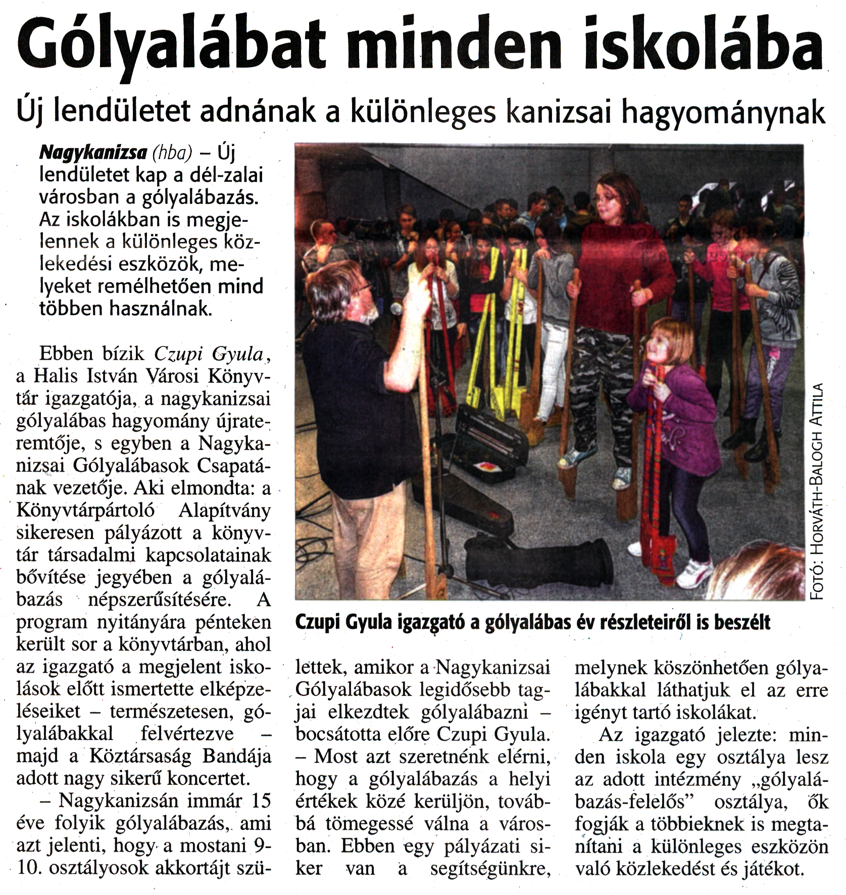 Nyilvános 1534 | 3430 | Zalai Hírlap 2016. november 29. 280. szám 2. oldal - Gólyalábat minden iskolába | Új lendületet adnának a különleges kanizsai hagyománynak Nagykanizsa (hba) - Új lendületet kap a dél-zalai városban a gólyalábazás. Az iskolákban is megjelennek a különleges közlekedési eszközök, melyeket remélhetően mind többen használnak. Ebben bízik Czupi Gyula, a Halis István Városi Könyvtár igazgatója, a nagykanizsai gólyalábas hagyomány újrateremtője, s egyben a Nagykanizsai Gólyalábasok Csapatának vezetője. Aki elmondta: a Könyvtárpártoló Alapítvány sikeresen pályázott a könyvtár társadalmi kapcsolatainak bővítése jegyében a gólyalábazás népszerűsítésére. A program nyitányára pénteken került sor a könyvtárban, ahol az igazgató a megjelent iskolások előtt ismertette elképzeléseiket - természetesen, gólyalábakkal felvértezve - majd a Köztársaság Bandája adott nagy sikerű koncertet. - Nagykanizsán immár 15 éve folyik gólyalábazás, ami azt jelenti, hogy a mostani 9-10. osztályosok akkortájt születtek, amikor a Nagykanizsai Gólyalábasok legidősebb tagjai elkezdtek gólyalábazni -bocsátotta előre Czupi Gyula. - Most azt szeretnénk elérni, hogy a gólyalábazás a helyi értékek közé kerüljön, továbbá tömegessé válna a városban. Ebben egy pályázati siker van a segítségünkre, melynek köszönhetően gólyalábakkal láthatjuk el az erre igényt tartó iskolákat. Az igazgató jelezte: minden iskola egy osztálya lesz az adott intézmény „gólyalábazás-felelős" osztálya, ők fogják a többieknek is megtanítani a különleges eszközön való közlekedést és játékot. Gólyalábat minden iskolába Fotó: Horváth-Balogh Attila |