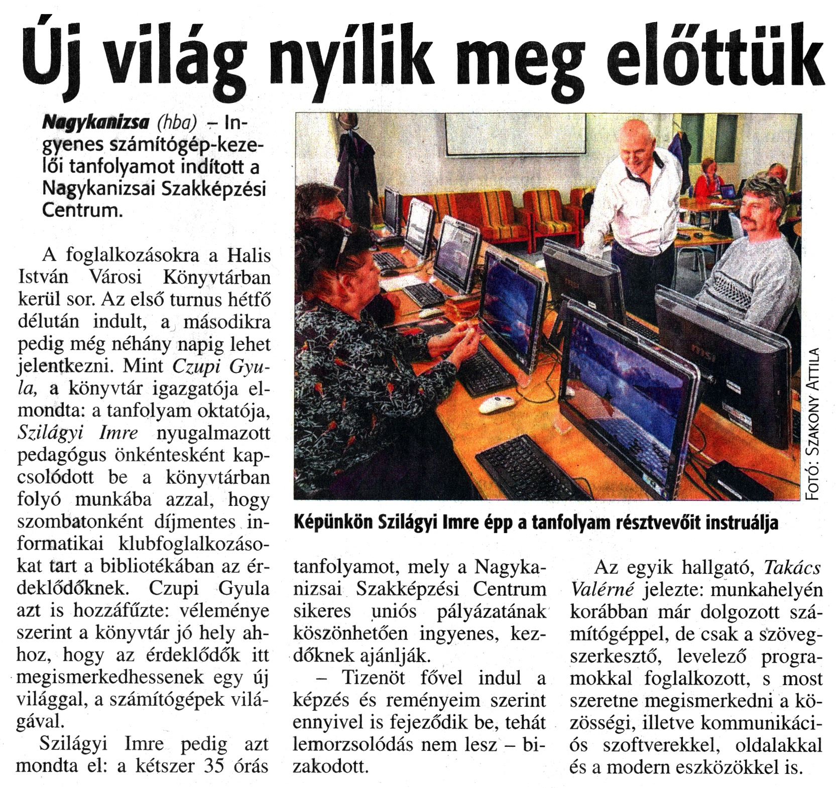 Nyilvános 1537 | 3201 | Zalai Hírlap 2017. március 17. 64. szám 3. oldal | Új világ nyílik meg előttük Nagykanizsa (hba) - Ingyenes számítógép-kezelői tanfolyamot indított a Nagykanizsai Szakképzési Centrum. A foglalkozásokra a Halis István Városi Könyvtárban kerül sor. Az első turnus hétfő délután indult, a másodikra pedig még néhány napig lehet jelentkezni. Mint Czupi Gyula, a könyvtár igazgatója elmondta: a tanfolyam oktatója, Szilágyi Imre nyugalmazott pedagógus önkéntesként kapcsolódott be a könyvtárban folyó munkába azzal, hogy szombatonként díjmentes informatikai klubfoglalkozásokat tart a bibliotékában az érdeklődőknek. Czupi Gyula azt is hozzáfűzte: véleménye szerint a könyvtár jó hely ahhoz, hogy az érdeklődők itt megismerkedhessenek egy új világgal, a számítógépek világával. Szilágyi Imre pedig azt mondta el: a kétszer 35 órás tanfolyamot, mely a Nagykanizsai Szakképzési Centrum sikeres uniós pályázatának köszönhetően ingyenes, kezdőknek ajánlják. - Tizenöt fővel indul a képzés és reményeim szerint ennyivel is fejeződik be, tehát lemorzsolódás nem lesz - bizakodott. Az egyik hallgató, Takács Valérné jelezte: munkahelyén korábban már dolgozott számítógéppel, de csak a szövegszerkesztő, levelező programokkal foglalkozott, s most szeretne megismerkedni a közösségi, illetve kommunikációs szoftverekkel, oldalakkal és a modern eszközökkel is. Képünkön Szilágyi Imre épp a tanfolyam résztvevőit instruálja |