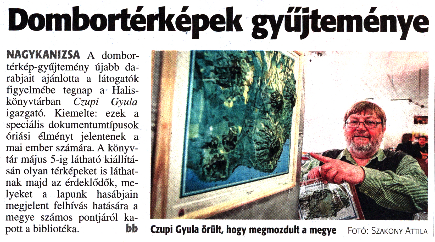 Nyilvános 1465 | 3041 | Zalai Hírlap 2017. április 25. 95. szám 2. oldal | Dombortérképek gyűjteménye NAGYKANIZSA A dombortérkép-gyűjtemény újabb darabjait ajánlotta a látogatók figyelmébe tegnap a Halis-könyvtárban Czupi Gyula igazgató. Kiemelte: ezek a speciális dokumentumtípusok óriási élményt jelentenek a mai ember számára. A könyvtár május 5-ig látható kiállításán olyan térképeket is láthatnak majd az érdeklődők, melyeket a lapunk hasábjain megjelent felhívás hatására a megye számos pontjáról kapott a bibliotéka. bb Czupi Gyula örült, hogy megmozdult a megye Fotó: Szakony Attila |