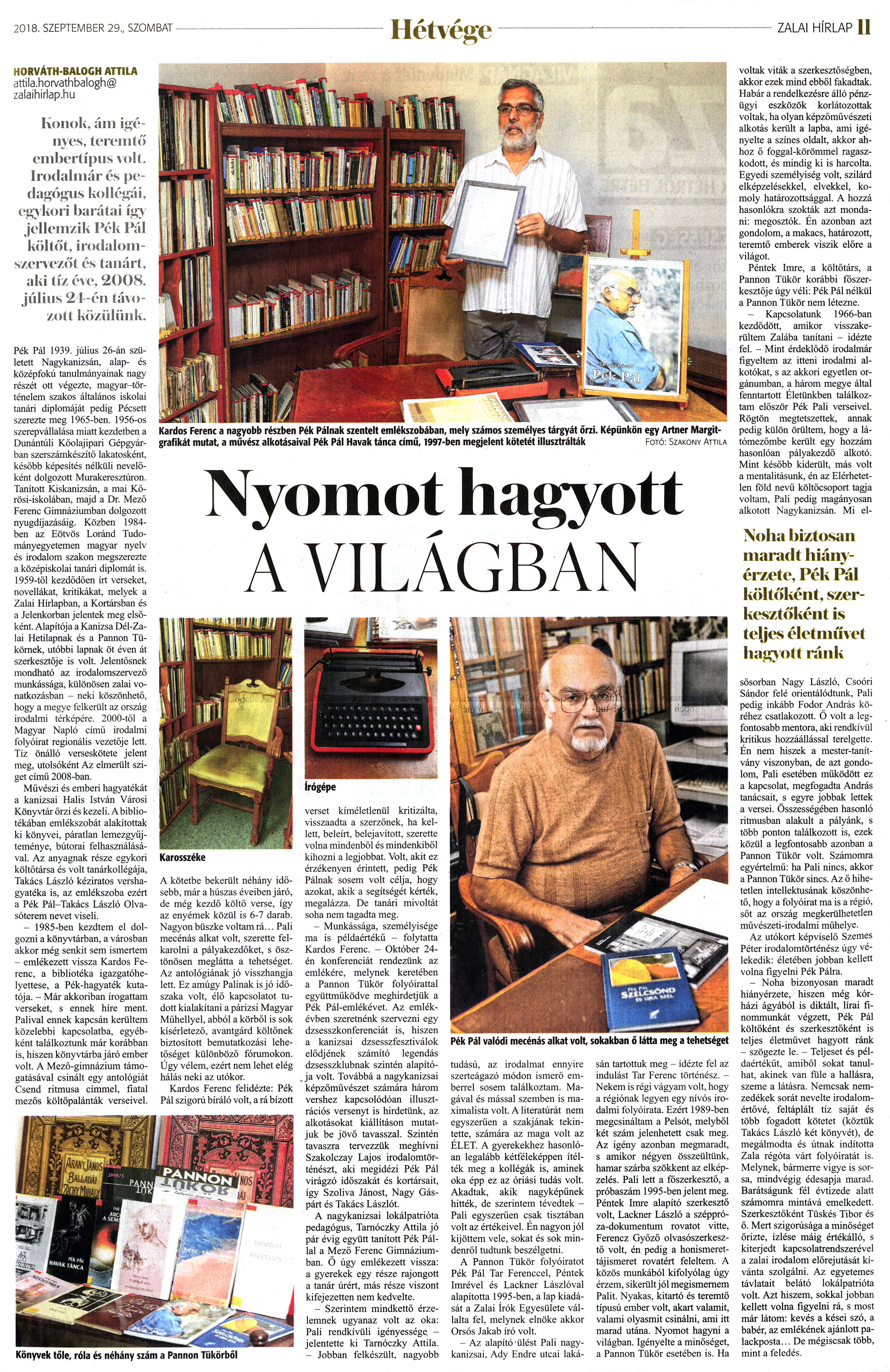 Nyilvános 1733 | 3539 | Zalai Hírlap 2018. szeptember 29. 227. szám 11. oldal - Nyomot hagyott a világban | HORVÁTH-BALOGH ATTILA attila.horvathbalogh@ zalaihirlap.hu Konok, ám igényes, teremtő embertípus volt. Irodalmár és pedagógus kollégái, egykori barátai így jellemzik Pék Pál költőt, irodalomszervezőt és tanárt, aki tíz éve, 2008. július 21 -én távozott közülünk. Pék Pál 1939. július 26-án született Nagykanizsán, alap- és középfokú tanulmányainak nagy részét ott végezte, magyar-történelem szakos általános iskolai tanári diplomáját pedig Pécsett szerezte meg 1965-ben. 1956-os szerepvállalása miatt kezdetben a Dunántúli Kőolajipari Gépgyárban szerszámkészítő lakatosként, később képesítés nélküli nevelőként dolgozott Murakeresztúron. Tanított Kiskanizsán, a mai Kőrösi-iskolában, majd a Dr. Mező Ferenc Gimnáziumban dolgozott nyugdíjazásáig. Közben 1984-ben az Eötvös Loránd Tudományegyetemen magyar nyelv és irodalom szakon megszerezte a középiskolai tanári diplomát is. 1959-től kezdődően írt verseket, novellákat, kritikákat, melyek a Zalai Hírlapban, a Kortársban és a Jelenkorban jelentek meg elsőként. Alapítója a Kanizsa Dél-Zalai Hetilapnak és a Pannon Tükörnek, utóbbi lapnak öt éven át szerkesztője is volt. Jelentősnek mondható az irodalomszervező munkássága, különösen zalai vonatkozásban - neki köszönhető, hogy a megye felkerült az ország irodalmi térképére. 2000-től a Magyar Napló című irodalmi folyóirat regionális vezetője lett. Tíz önálló verseskötete jelent meg, utolsóként Az elmerült sziget című 2008-ban. Művészi és emberi hagyatékát a kanizsai Halis István Városi Könyvtár őrzi és kezeli. A bibliotékában emlékszobát alakítottak ki könyvei, páratlan lemezgyűjteménye, bútorai felhasználásával. Az anyagnak része egykori költőtársa és volt tanárkollégája, Takács László kéziratos vershagyatéka is, az emlékszoba ezért a Pék Pál-Takács László Olvasóterem nevet viseli. - 1985-ben kezdtem el dolgozni a könyvtárban, a városban akkor még senkit sem ismertem - emlékezett vissza Kardos Ferenc, a bibliotéka igazgatóhelyettese, a Pék-hagyaték kutatója. - Már akkoriban írogattam verseket, s ennek híre ment. Palival ennek kapcsán kerültem közelebbi kapcsolatba, egyébként találkoztunk már korábban is, hiszen könyvtárba járó ember volt. A Mező-gimnázium támogatásával csinált egy antológiát Csend ritmusa címmel, fiatal mezős költőpalánták verseivel. Karosszéke A kötetbe bekerült néhány idősebb, már a húszas éveiben járó, de még kezdő költő verse, így az enyémek közül is 6-7 darab. Nagyon büszke voltam rá... Pali mecénás alkat volt, szerette felkarolni a pályakezdőket, s ösztönösen meglátta a tehetséget. Az antológiának jó visszhangja lett. Ez amúgy Palinak is jó időszaka volt, élő kapcsolatot tudott kialakítani a párizsi Magyar Műhellyel, abból a körből is sok kísérletező, avantgárd költőnek biztosított bemutatkozási lehetőséget különböző fórumokon. Úgy vélem, ezért nem lehet elég hálás neki az utókor. Kardos Ferenc felidézte: Pék Pál szigorú bíráló volt, a rá bízott verset kíméletlenül kritizálta, visszaadta a szerzőnek, ha kellett, beleírt, belejavított, szerette volna mindenből és mindenkiből kihozni a legjobbat. Volt, akit ez érzékenyen érintett, pedig Pék Pálnak sosem volt célja, hogy azokat, akik a segítségét kérték, megalázza. De tanári mivoltát soha nem tagadta meg. - Munkássága, személyisége ma is példaértékű - folytatta Kardos Ferenc. - Október 24-én konferenciát rendezünk az emlékére, melynek keretében a Pannon Tükör folyóirattal együttműködve meghirdetjük a Pék Pál-emlékévet. Az emlékévben szeretnénk szervezni egy dzsesszkonferenciát is, hiszen a kanizsai dzsesszfesztiválok elődjének számító legendás dzsesszklubnak szintén alapítója volt. Továbbá a nagykanizsai képzőművészet számára három vershez kapcsolódóan illusztrációs versenyt is hirdetünk, az alkotásokat kiállításon mutatjuk be jövő tavasszal. Szintén tavaszra tervezzük meghívni Szakolczay Lajos irodalomtörténészt, aki megidézi Pék Pál virágzó időszakát és kortársait, így Szoliva Jánost, Nagy Gáspárt és Takács Lászlót. A nagykanizsai lokálpatrióta pedagógus, Tarnóczky Attila jó pár évig együtt tanított Pék Pállal a Mező Ferenc Gimnáziumban. Ő úgy emlékezett vissza: a gyerekek egy része rajongott a tanár úrért, más része viszont kifejezetten nem kedvelte. - Szerintem mindkettő érzelemnek ugyanaz volt az oka: Pali rendkívüli igényessége, - jelentette ki Tarnóczky Attila. - Jobban felkészült, nagyobb tudású, az irodalmat ennyire szerteágazó módon ismerő emberrel sosem találkoztam. Magával és mással szemben is maximalista volt. A literatúrát nem egyszerűen a szakjának tekintette, számára az maga volt az ÉLET. A gyerekekhez hasonlóan legalább kétféleképpen ítélték meg a kollégák is, aminek oka épp ez az óriási tudás volt. Akadtak, akik nagyképűnek hitték, de szerintem tévedtek -Pali egyszerűen csak tisztában volt az értékeivel. Én nagyon jól kijöttem vele, sokat és sok mindenről tudtunk beszélgetni. A Pannon Tükör folyóiratot Pék Pál Tar Ferenccel, Péntek Imrével és Lackner Lászlóval alapította 1995-ben, a lap kiadását a Zalai írók Egyesülete vállalta fel, melynek elnöke akkor Orsós Jakab író volt. - Az alapító-ülést Pali nagykanizsai, Ady Endre utcai laká- sán tartottuk meg - idézte fel az indulást Tar Ferenc történész. -Nekem is régi vágyam volt, hogy a régiónak legyen egy nívós irodalmi folyóirata. Ezért 1989-ben megcsináltam a Pelsót, melyből két szám jelenhetett csak meg. Az igény azonban megmaradt, s 