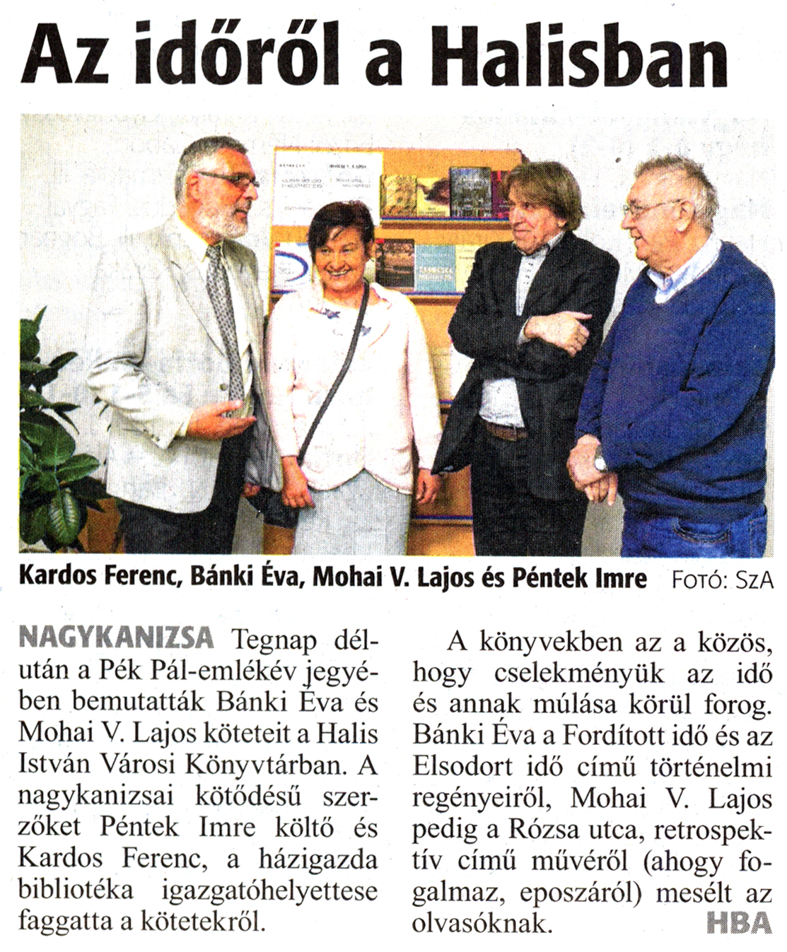 Nyilvános 1389 | 2430 | Zalai Hírlap 2018. november 7. 258. szám 16. oldal | Az időről a Halisban Kardos Ferenc, Bánki Éva, Mohai V. Lajos és Péntek Imre Fotó: SzA NAGYKANIZSA Tegnap délután a Pék Pál-emlékév jegyében bemutatták Bánki Éva és Mohai V. Lajos köteteit a Halis István Városi Könyvtárban. A nagykanizsai kötődésű szerzőket Péntek Imre költő és Kardos Ferenc, a házigazda bibliotéka igazgatóhelyettese faggatta a kötetekről. A könyvekben az a közös, hogy cselekményük az idő és annak múlása körül forog. Bánki Éva a Fordított idő és az Elsodort idő című történelmi regényeiről, Mohai V. Lajos pedig a Rózsa utca, retrospektív című művéről (ahogy fogalmaz, eposzáról) mesélt az olvasóknak. HBA |