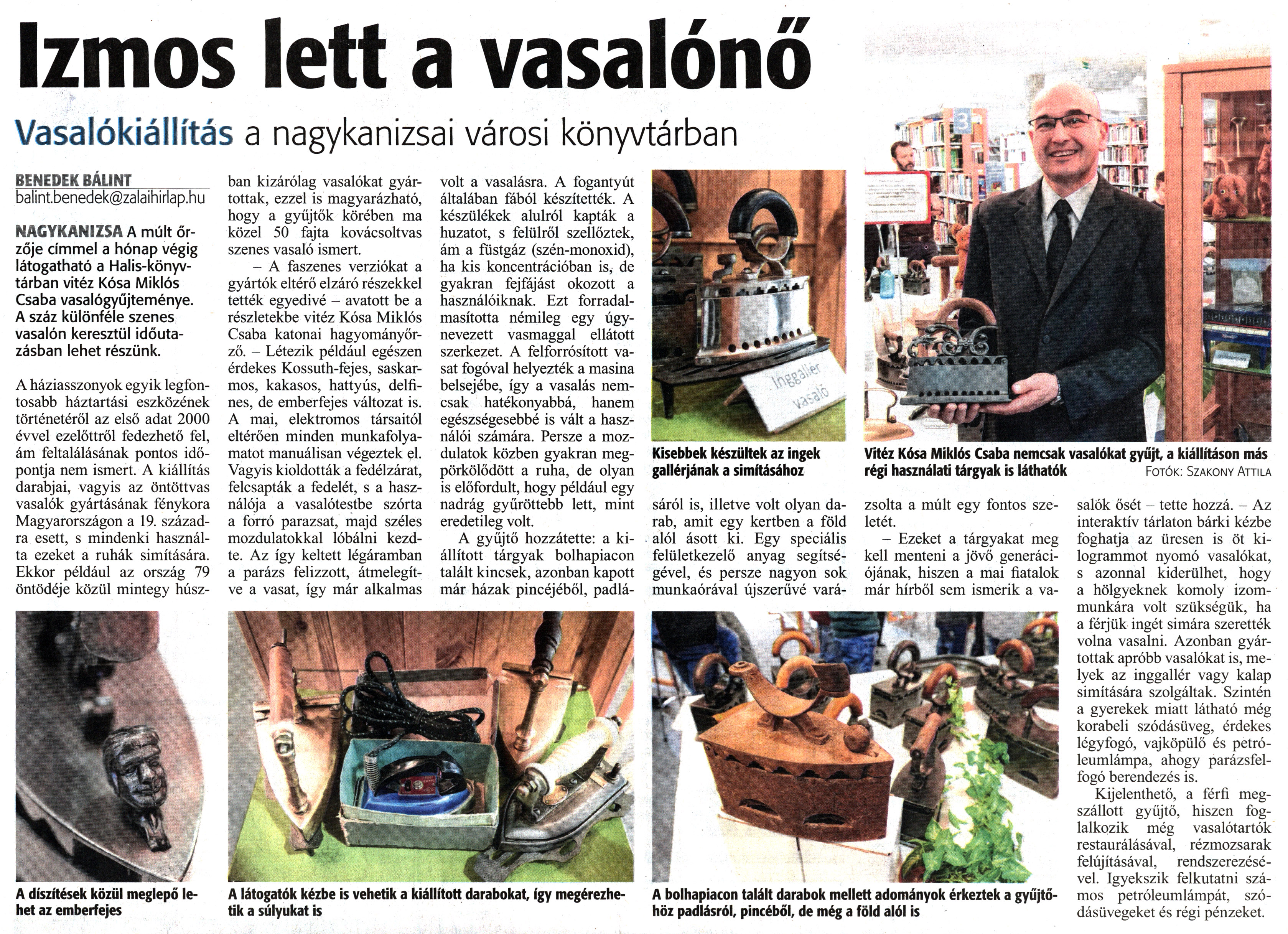 Nyilvános 1385 | 2587 | Zalai Hírlap 2019. március 26. 71. szám 9. oldal | BENEDEK BÁLINT balint.benedek@zalaihirlap.hu NAGYKANIZSA A múlt őrzője címmel a hónap végig látogatható a Halis-könyvtárban vitéz Kósa Miklós Csaba vasalógyűjteménye. A száz különféle szenes vasalón keresztül időutazásban lehet részünk. A háziasszonyok egyik legfontosabb háztartási eszközének történetéről az első adat 2000 évvel ezelőttről fedezhető fel, ám feltalálásának pontos időpontja nem ismert. A kiállítás darabjai, vagyis az öntöttvas vasalók gyártásának fénykora Magyarországon a 19. századra esett, s mindenki használta ezeket a ruhák simítására. Ekkor például az ország 79 öntödéje közül mintegy húszban kizárólag vasalókat gyártottak, ezzel is magyarázható, hogy a gyűjtők körében ma közel 50 fajta kovácsoltvas szenes vasaló ismert. - A faszenes verziókat a gyártók eltérő elzáró részekkel tették egyedivé - avatott be a részletekbe vitéz Kósa Miklós Csaba katonai hagyományőrző. - Létezik például egészen érdekes Kossuth-fejes, saskarmos, kakasos, hattyús, delfines, de emberfejes változat is. A mai, elektromos társaitól eltérően minden munkafolyamatot manuálisan végeztek el. Vagyis kioldották a fedélzárat, felcsapták a fedelét, s a használója a vasalótestbe szórta a forró parazsat, majd széles mozdulatokkal lóbálni kezdte. Az így keltett légáramban a parázs felizzott, átmelegítve a vasat, így már alkalmas volt a vasalásra. A fogantyút általában fából készítették. A készülékek alulról kapták a huzatot, s felülről szellőztek, ám a füstgáz (szén-monoxid), ha kis koncentrációban is, de gyakran fejfájást okozott a használóiknak. Ezt forradalmasította némileg egy úgynevezett vasmaggal ellátott szerkezet. A felforrósított vasat fogóval helyezték a masina belsejébe, így a vasalás nemcsak hatékonyabbá, hanem egészségesebbé is vált a használói számára. Persze a mozdulatok közben gyakran megpörkölődött a ruha, de olyan is előfordult, hogy például egy nadrág gyűröttebb lett, mint eredetileg volt. A gyűjtő hozzátette: a kiállított tárgyak bolhapiacon talált kincsek, azonban kapott már házak pincéjéből, padlásáról is, illetve volt olyan darab, amit egy kertben a föld alól ásott ki. Egy speciális felületkezelő anyag segítségével, és persze nagyon sok munkaórával újszerűvé varázsolta a múlt egy fontos szeletét. - Ezeket a tárgyakat meg kell menteni a jövő generációjának, hiszen a mai fiatalok már hírből sem ismerik a vasalók ősét - tette hozzá. - Az interaktív tárlaton bárki kézbe foghatja az üresen is öt kilogrammot nyomó vasalókat, s azonnal kiderülhet, hogy a hölgyeknek komoly izommunkára volt szükségük, ha a férjük ingét simára szerették volna vasalni. Azonban gyártottak apróbb vasalókat is, melyek az inggallér vagy kalap simítására szolgáltak. Szintén a gyerekek miatt látható még korabeli szódásüveg, érdekes légyfogó, vajköpülő és petróleumlámpa, ahogy parázsfelfogó berendezés is. Kijelenthető, a férfi megszállott gyűjtő, hiszen foglalkozik még vasalótartók restaurálásával, rézmozsarak felújításával, rendszerezésével. Igyekszik felkutatni számos petróleumlámpát, szódásüvegeket és régi pénzeket. A látogatók kézbe is vehetik a kiállított darabokat, így megérezhetik a súlyukat is A bolhapiacon talált darabok mellett adományok érkeztek a gyűjtőhöz padlásról, pincéből, de még a föld alól is A díszítések közül meglepő lehet az emberfejes Izmos lett a vasalónő Vasalókiállítás a nagykanizsai városi könyvtárban Vitéz Kósa Miklós Csaba nemcsak vasalókat gyűjt, a kiállításon más régi használati tárgyak is láthatók Fotók: Szakony Attila |
