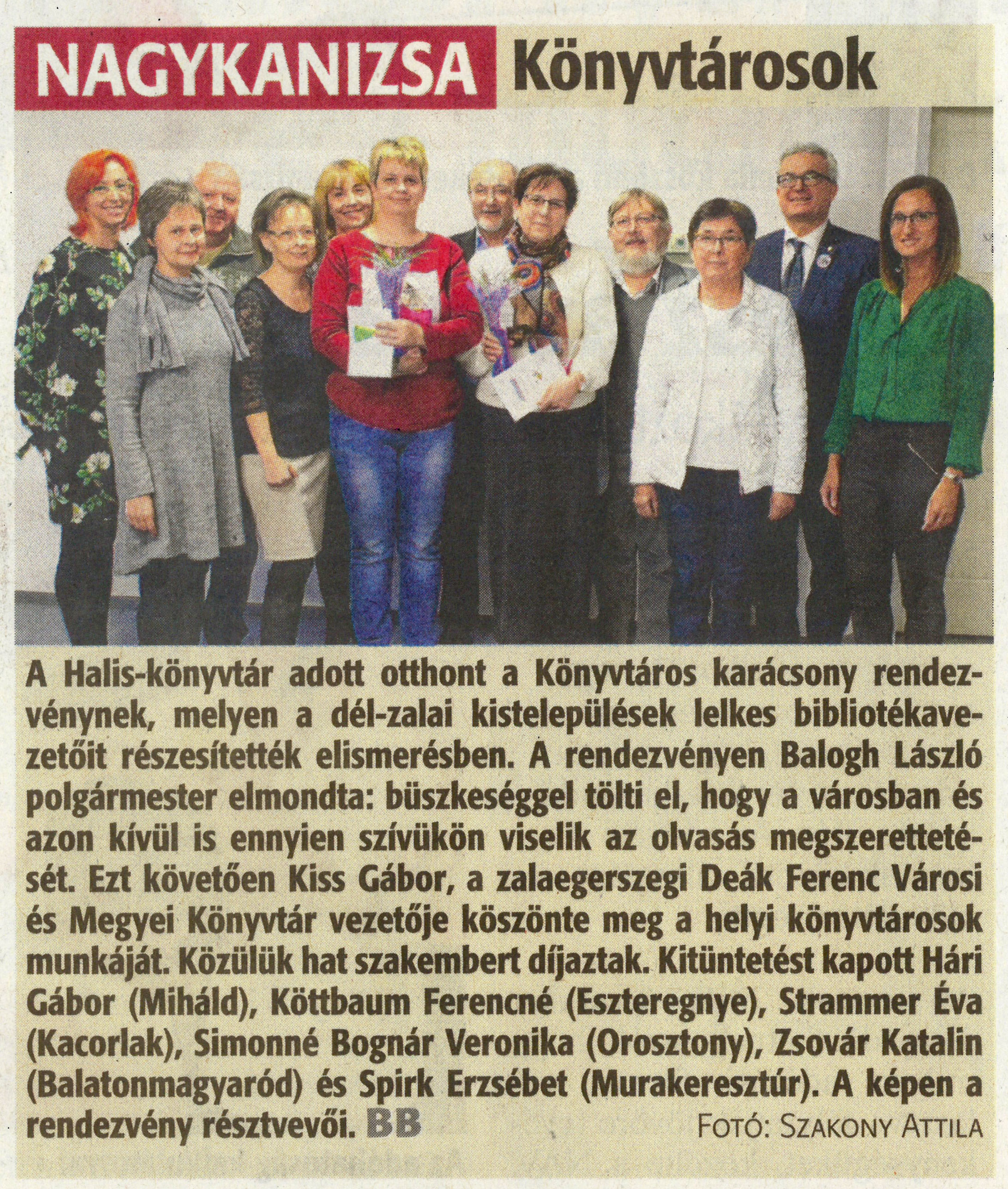 Nyilvános 1156 | 1785 | Zalai Hírlap 2019. december 11. 287.sz. 3.old. - NAGYKANIZSA Könyvtárosok | A Halis-könyvtár adott otthont a Könyvtáros karácsony rendezvénynek, melyen a dél-zalai kistelepülések lelkes bibliotékavezetőit részesítették elismerésben. A rendezvényen Balogh László polgármester elmondta: büszkeséggel tölti el, hogy a városban és azon kívül is ennyien szívükön viselik az olvasás megszerettetését. Ezt követően Kiss Gábor, a zalaegerszegi Deák Ferenc Városi és Megyei Könyvtár vezetője köszönte meg a helyi könyvtárosok munkáját. Közülük hat szakembert díjaztak. Kitüntetést kapott Hári Gábor (Miháld), Köttbaum Ferencné (Eszteregnye), Strammer Éva (Kacorlak), Simonné Bognár Veronika (Orosztony), Zsovár Katalin (Balatonmagyaród) és Spirk Erzsébet (Murakeresztúr). A képen a rendezvény résztvevői. FOTÓ: SZAKONY ATTILA |