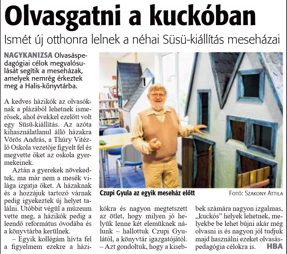 Nyilvános 1225 | 2673 | Zalai Hírlap 2020. június 17. 140. szám 16. oldal | Olvasgatni a kuckóban Ismét új otthonra lelnek a néhai Süsü-kiállítás meseházai NAGYKANIZSA Olvasáspedagógiai célok megvalósulását segítik a meseházak, amelyek nemrég érkeztek meg a Halis-könyvtárba. A kedves házikók az olvasóknak a plázából lehetnek ismerősek, ahol évekkel ezelőtt volt egy Süsü-kiállítás. Az azóta kihasználatlanul álló házakra Vörös András, a Thúry Vitézlő Oskola vezetője figyelt fel és megvette őket az oskola gyermekeinek. Aztán a gyerekek növekedtek, ma már nem a mesék világa izgatja őket. A házaknak és a hozzájuk tartozó várnak pedig igyekeztek új helyet találni. Utóbbit végül a múzeum vette meg, a házikók pedig a leendő református óvodába és a könyvtárba kerülnek. - Egyik kollégám hívta fel a figyelmem ezekre a házikókra és nagyon megtetszett az ötlet, hogy milyen jó helyük lenne két elemüknek nálunk - hallottuk Czupi Gyulától, a könyvtár igazgatójától. - Azt gondoltuk, hogy a kisebbek számára nagyon izgalmas, „kuckós" helyek lehetnek, melyekbe be lehet bújni akár még olvasni is és nagyon jól tudjuk majd használni ezeket olvasáspedagógia célokra is. HBA |