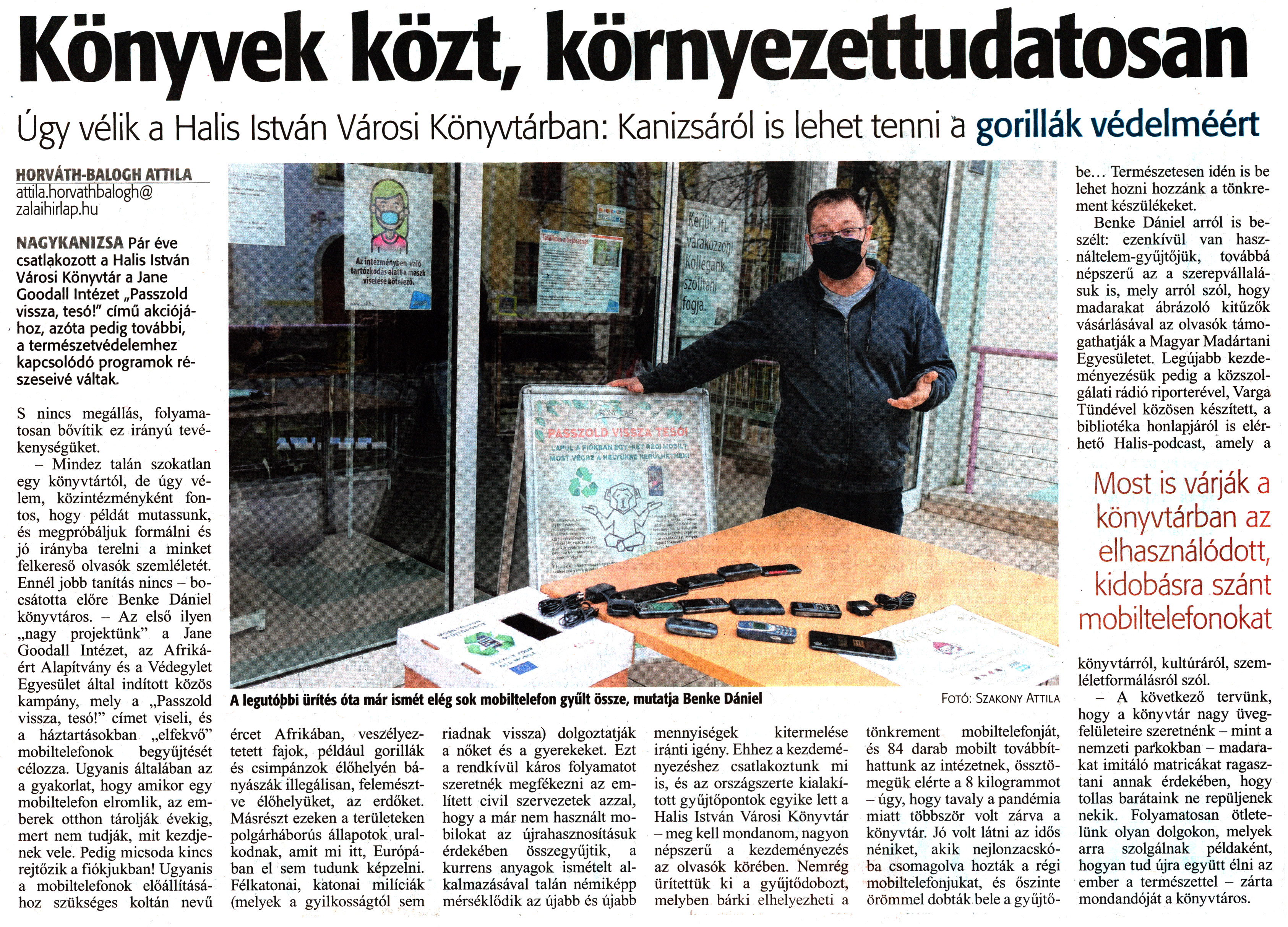 Nyilvános 1101 | 1550 | Zalai Hírlap 2021. február 8. 32. szám 4. oldal | Könyvek közt, környezettudatosan NAGYKANIZSA Pár éve csatlakozott a Halis István Városi Könyvtár a Jane Goodall Intézet „Passzold vissza, tesó!" című akciójához, azóta pedig további, a természetvédelemhez kapcsolódó programok részeseivé váltak. S nincs megállás, folyamatosan bővítik ez irányú tevékenységüket. - Mindez talán szokatlan egy könyvtártól, de úgy vélem, közintézményként fontos, hogy példát mutassunk, és megpróbáljuk formálni és jó irányba terelni a minket felkereső olvasók szemléletét. Ennél jobb tanítás nincs - bocsátotta előre Benke Dániel könyvtáros. - Az első ilyen „nagy projektünk" a Jane Goodall Intézet, az Afrikáért Alapítvány és a Védegylet Egyesület által indított közös kampány, mely a „Passzold vissza, tesó!" címet viseli, és a háztartásokban „elfekvő" mobiltelefonok begyűjtését célozza. Ugyanis általában az a gyakorlat, hogy amikor egy mobiltelefon elromlik, az emberek otthon tárolják évekig, mert nem tudják, mit kezdjenek vele. Pedig micsoda kincs rejtőzik a fiókjukban! Ugyanis a mobiltelefonok előállításához szükséges koltán nevű ércet Afrikában, veszélyeztetett fajok, például gorillák és csimpánzok élőhelyén bányásszák illegálisan, felemésztve élőhelyüket, az erdőket. Másrészt ezeken a területeken polgárháborús állapotok uralkodnak, amit mi itt, Európában el sem tudunk képzelni. Félkatonai, katonai milíciák (melyek a gyilkosságtól sem riadnak vissza) dolgoztatják a nőket és a gyerekeket. Ezt a rendkívül káros folyamatot szeretnék megfékezni az említett civil szervezetek azzal, hogy a már nem használt mobilokat az újrahasznosításuk érdekében összegyűjtik, a kurrens anyagok ismételt alkalmazásával talán némiképp mérséklődik az újabb és újabb mennyiségek kitermelése iránti igény. Ehhez a kezdeményezéshez csatlakoztunk mi is, és az országszerte kialakított gyűjtőpontok egyike lett a Halis István Városi Könyvtár - meg kell mondanom, nagyon népszerű a kezdeményezés az olvasók körében. Nemrég ürítettük ki a gyüjtődobozt, melyben bárki elhelyezheti a tönkrement mobiltelefonját, és 84 darab mobilt továbbíthattunk az intézetnek, össztömegük elérte a 8 kilogrammot - úgy, hogy tavaly a pandémia miatt többször volt zárva a könyvtár. Jó volt látni az idős néniket, akik nejlonzacskóba csomagolva hozták a régi mobiltelefonjukat, és őszinte örömmel dobták bele a gyűjtőbe... Természetesen idén is be lehet hozni hozzánk a tönkrement készülékeket. Benke Dániel arról is beszélt: ezenkívül van használtelem-gyüjtőjük, továbbá népszerű az a szerepvállalásuk is, mely arról szól, hogy madarakat ábrázoló kitűzők vásárlásával az olvasók támogathatják a Magyar Madártani Egyesületet. Legújabb kezdeményezésük pedig a közszolgálati rádió riporterével, Varga Tündével közösen készített, a bibliotéka honlapjáról is elérhető Halis-podcast, amely a könyvtárról, kultúráról, szemléletformálásról szól. - A következő tervünk, hogy a könyvtár nagy üvegfelületeire szeretnénk - mint a nemzeti parkokban - madarakat imitáló matricákat ragasztani annak érdekében, hogy tollas barátaink ne repüljenek nekik. Folyamatosan ötletelünk olyan dolgokon, melyek arra szolgálnak példaként, hogyan tud újra együtt élni az ember a természettel - zárta mondandóját a könyvtáros. HORVÁTH-BALOGH ATTILA attila.horvathbalogh@ zalaihirlap.hu |