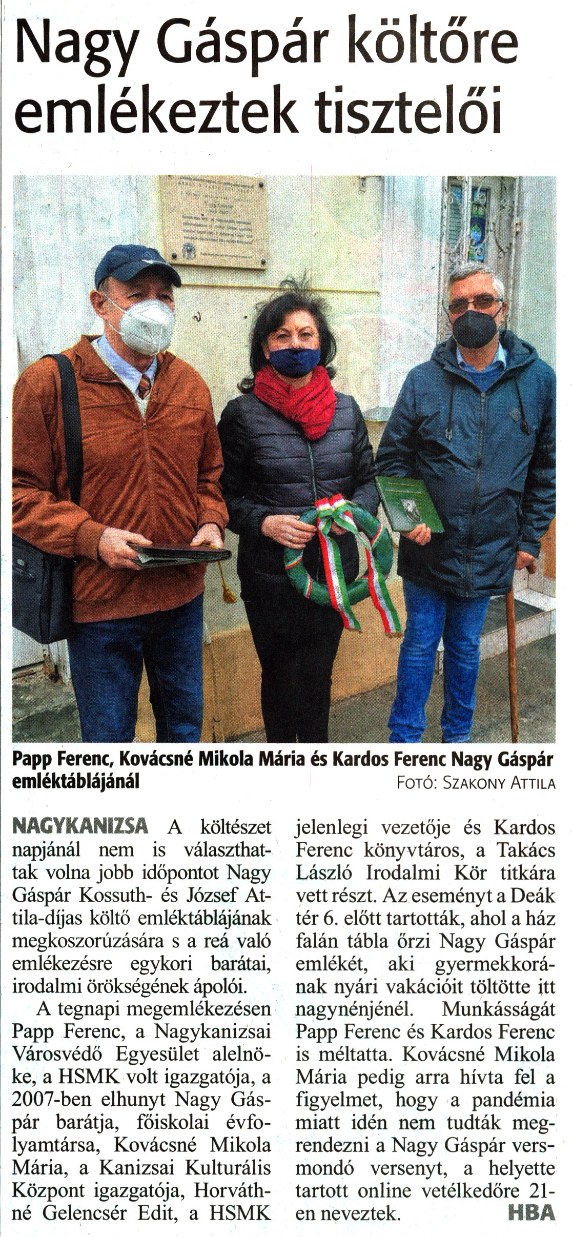 Nyilvános 1090 | 1486 | Zalai Hírlap 2021. április 12. 83. szám 3. oldal | Nagy Gáspár költőre emlékeztek tisztelői Papp Ferenc, Kovácsné Mikola Mária és Kardos Ferenc Nagy Gáspár emléktáblájánál Fotó: Szakony Attila NAGYKANIZSA A költészet napjánál nem is választhattak volna jobb időpontot Nagy Gáspár Kossuth- és József Attila-díjas költő emléktáblájának megkoszorúzására s a reá való emlékezésre egykori barátai, irodalmi örökségének ápolói. A tegnapi megemlékezésen Papp Ferenc, a Nagykanizsai Városvédő Egyesület alelnöke, a HSMK volt igazgatója, a 2007-ben elhunyt Nagy Gáspár barátja, főiskolai évfolyamtársa, Kovácsné Mikola Mária, a Kanizsai Kulturális Központ igazgatója, Horváthné Gelencsér Edit, a HSMK jelenlegi vezetője és Kardos Ferenc könyvtáros, a Takács László Irodalmi Kör titkára vett részt. Az eseményt a Deák tér 6. előtt tartották, ahol a ház falán tábla őrzi Nagy Gáspár emlékét, aki gyermekkorának nyári vakációit töltötte itt nagynénjénél. Munkásságát Papp Ferenc és Kardos Ferenc is méltatta. Kovácsné Mikola Mária pedig arra hívta fel a figyelmet, hogy a pandémia miatt idén nem tudták megrendezni a Nagy Gáspár versmondó versenyt, a helyette tartott online vetélkedőre 21-en neveztek. HBA |
