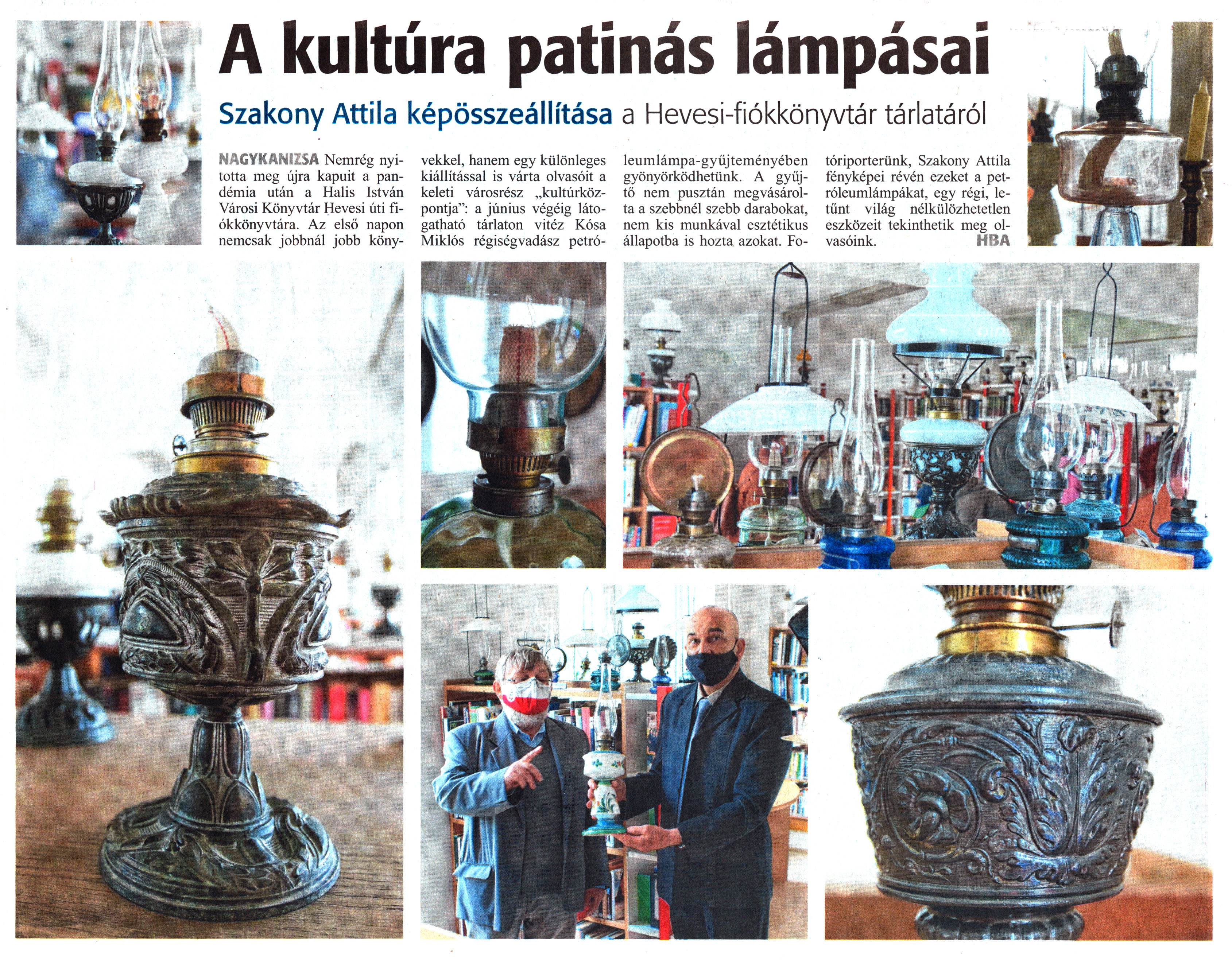 Nyilvános 1067 | 1766 | Zalai Hírlap 2021. május 26. 119. szám 5. oldal | A kultúra patinás lámpásai Szakony Attila képösszeállítása a Hevesi-fiókkönyvtár tárlatáról NAGYKANIZSA Nemrég nyitotta meg újra kapuit a pandémia után a Halis István Városi Könyvtár Hevesi úti fiókkönyvtára. Az első napon nemcsak jobbnál jobb könyvekkel, hanem egy különleges kiállítással is várta olvasóit a keleti városrész „kultúrközpontja": a június végéig látogatható tárlaton vitéz Kósa Miklós régiségvadász petróleumlámpa-gyűjteményében gyönyörködhetünk. A gyűjtő nem pusztán megvásárolta a szebbnél szebb darabokat, nem kis munkával esztétikus állapotba is hozta azokat. Fotóriporterünk, Szakony Attila fényképei révén ezeket a petróleumlámpákat, egy régi, letűnt világ nélkülözhetetlen eszközeit tekinthetik meg olvasóink. HBA |