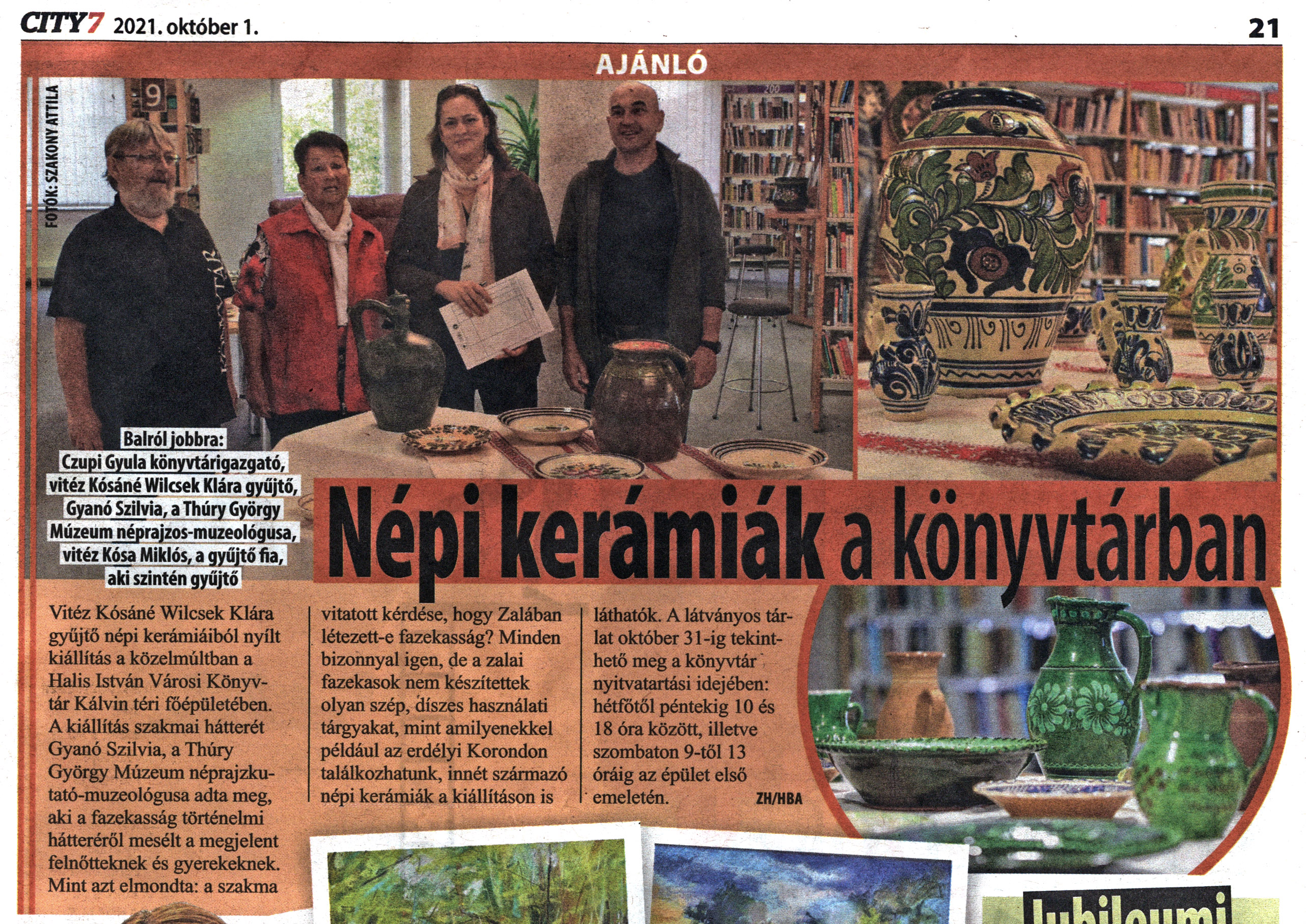Nyilvános 1407 | 2245 | City7 Magazin 2021. október 1. 28. szám 21. oldal | Népi kerámiák a könyvtárban Vitéz Kósáné Wilcsek Klára gyűjtő népi kerámiáiból nyílt kiállítás a közelmúltban a Halis István Városi Könyvtár Kálvin téri főépületében. A kiállítás szakmai hátterét Gyanó Szilvia, a Thúry György Múzeum néprajzkutató-muzeológusa adta meg, aki a fazekasság történelmi hátteréről mesélt a megjelent felnőtteknek és gyerekeknek. Mint azt elmondta: a szakma vitatott kérdése, hogy Zalában létezett-e fazekasság? Minden bizonnyal igen, de a zalai fazekasok nem készítettek olyan szép, díszes használati tárgyakat, mint amilyenekkel például az erdélyi Korondon találkozhatunk, innét származó népi kerámiák a kiállításon is láthatók. A látványos tárlat október 31-ig tekinthető meg a könyvtár nyitvatartási idejében: hétfőtől péntekig 10 és 18 óra között, illetve szombaton 9-től 13 óráig az épület első emeletén. ZH/HBA Balról jobbra: Czupi Gyula könyvtárigazgató, vitéz Kósáné Wilcsek Klára gyűjtő, Gyanó Szilvia, a Thúry György Múzeum néprajzos-muzeológusa, vitéz Kósa Miklós, a gyűjtő fia, aki szintén gyűjtő |