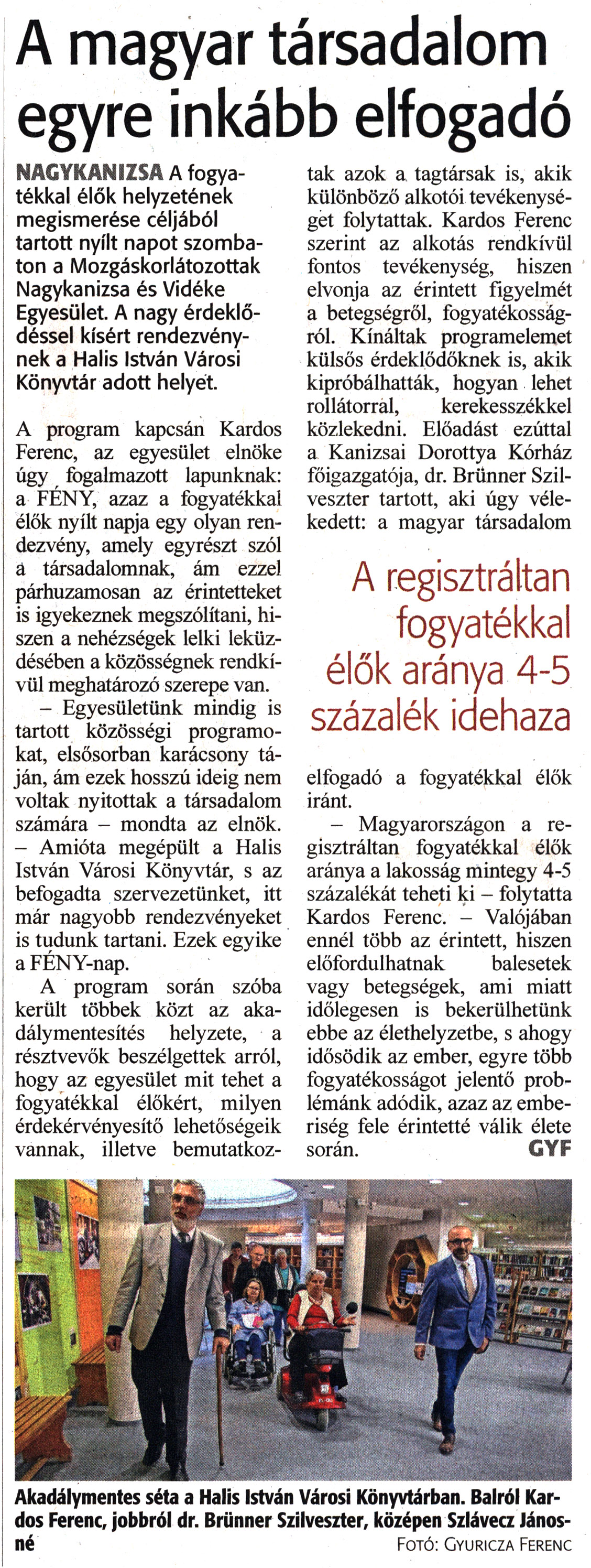 Nyilvános 1032 | 1321 | Zalai Hírlap 2022. október 17. 242. szám 2. oldal | A magyar társadalom egyre inkább elfogadó NAGYKANIZSA A fogyatékkal élők helyzetének megismerése céljából tartott nyílt napot szombaton a Mozgáskorlátozottak Nagykanizsa és Vidéke Egyesület. A nagy érdeklődéssel kísért rendezvénynek a Halis István Városi Könyvtár adott helyét. A program kapcsán Kardos Ferenc, az egyesület elnöke úgy fogalmazott lapunknak: a FÉNY, azaz a fogyatékkal élők nyílt napja egy olyan rendezvény, amely egyrészt szól a társadalomnak, ám ezzel párhuzamosan az érintetteket is igyekeznek megszólítani, hiszen a nehézségek lelki leküzdésében a közösségnek rendkívül meghatározó szerepe van. - Egyesületünk mindig is tartott közösségi programokat, elsősorban karácsony táján, ám ezek hosszú ideig nem voltak nyitottak a társadalom számára - mondta az elnök. - Amióta megépült a Halis István Városi Könyvtár, s az befogadta szervezetünket, itt már nagyobb rendezvényeket is tudunk tartani. Ezek egyike a FÉNY-nap. A program során szóba került többek közt az akadálymentesítés helyzete, a résztvevők beszélgettek arról, hogy az egyesület mit tehet a fogyatékkal élőkért, milyen érdekérvényesítő lehetőségeik vannak, illetve bemutatkoztak azok a tagtársak is, akik különböző alkotói tevékenységet folytattak. Kardos Ferenc szerint az alkotás rendkívül fontos tevékenység, hiszen elvonja az érintett figyelmét a betegségről, fogyatékosságról. Kínáltak programelemet külsős érdeklődőknek is, akik kipróbálhatták, hogyan lehet rollátorral, kerekesszékkel közlekedni. Előadást ezúttal a Kanizsai Dorottya Kórház főigazgatója, dr. Brünner Szilveszter tartott, aki úgy vélekedett: a magyar társadalom elfogadó a fogyatékkal élők iránt. - Magyarországon a regisztráltan fogyatékkal élők aránya a lakosság mintegy 4-5 százalékát teheti ki - folytatta Kardos Ferenc. - Valójában ennél több az érintett, hiszen előfordulhatnak balesetek vagy betegségek, ami miatt időlegesen is bekerülhetünk ebbe az élethelyzetbe, s ahogy idősödik az ember, egyre több fogyatékosságot jelentő problémánk adódik, azaz az emberiség fele érintetté válik élete során. CYF Akadálymentes séta a Halis István Városi Könyvtárban. Balról Kardos Ferenc, jobbról dr. Brünner Szilveszter, középen Szlávecz Jánosné Fotó: Cvuricza Ferenc |